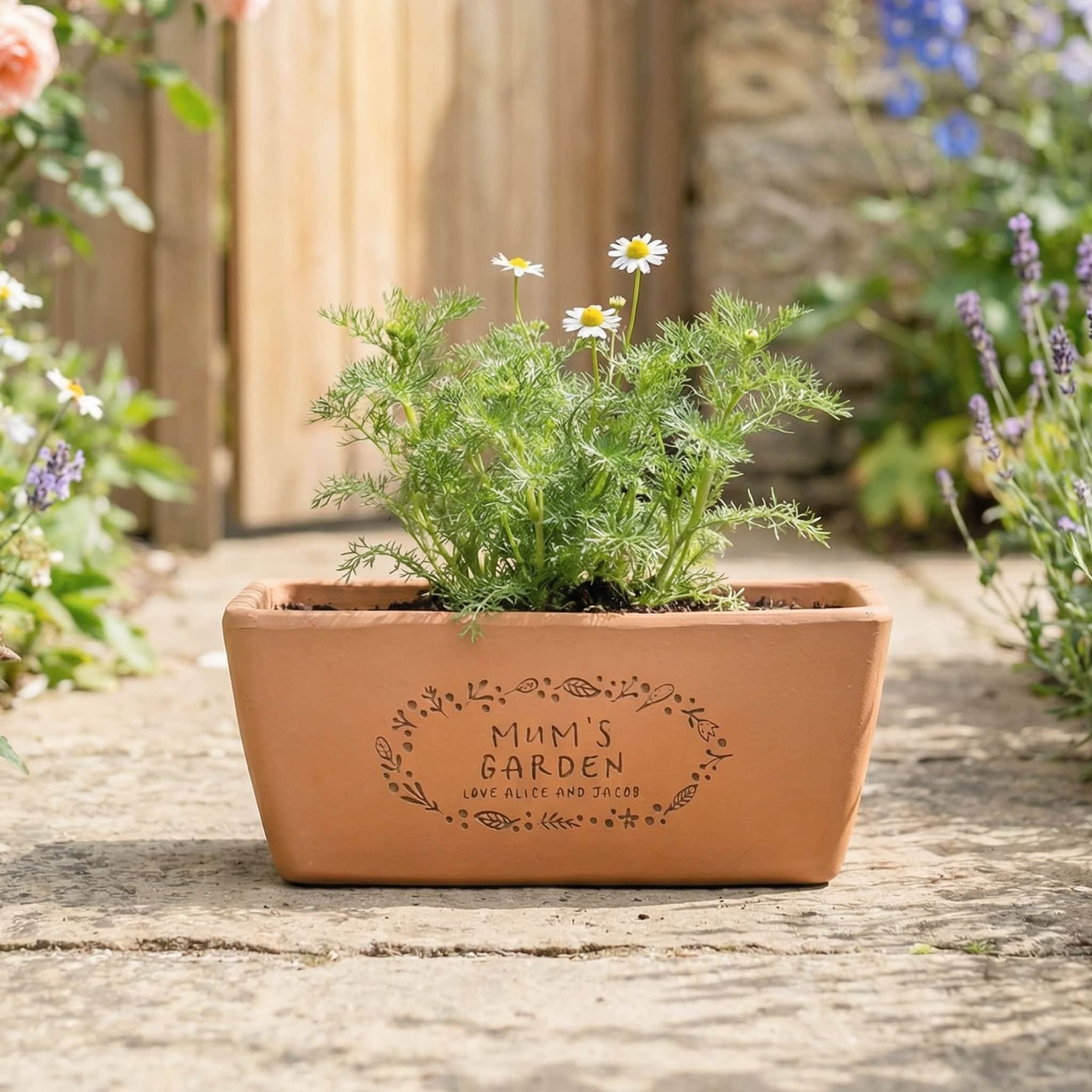 A personalised terracotta window box engraved with a border of leaves and flowers surrounding your message. A gorgeous personalised gift for your loved ones' garden.