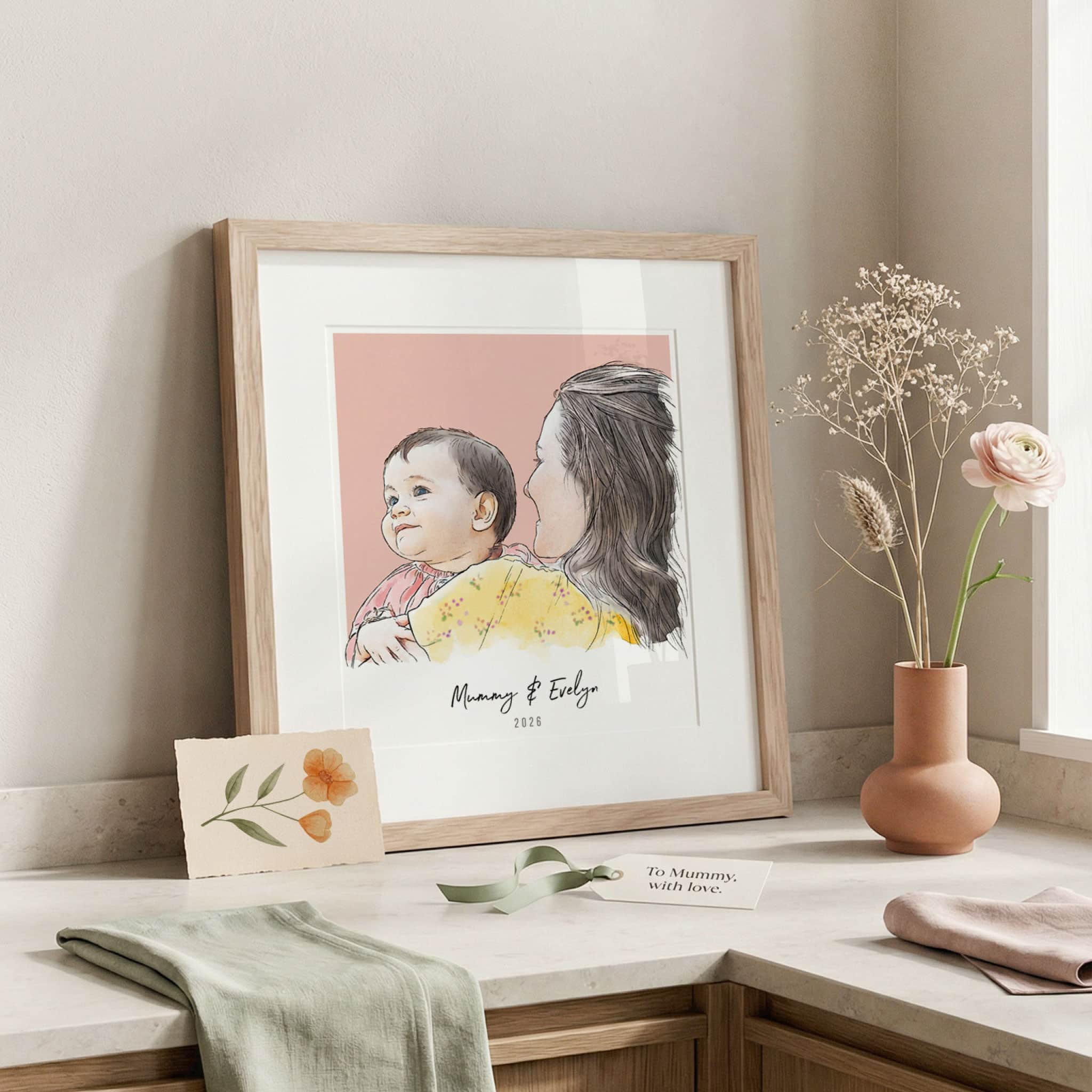 Each illustration starts with a digital sketch based on your photo, which is then enhanced by our talented artists, adding unique details and personal touches. We never use AI or filters—just authentic craftsmanship from our team. The final artwork is then printed on high-quality, acid-free artist paper.