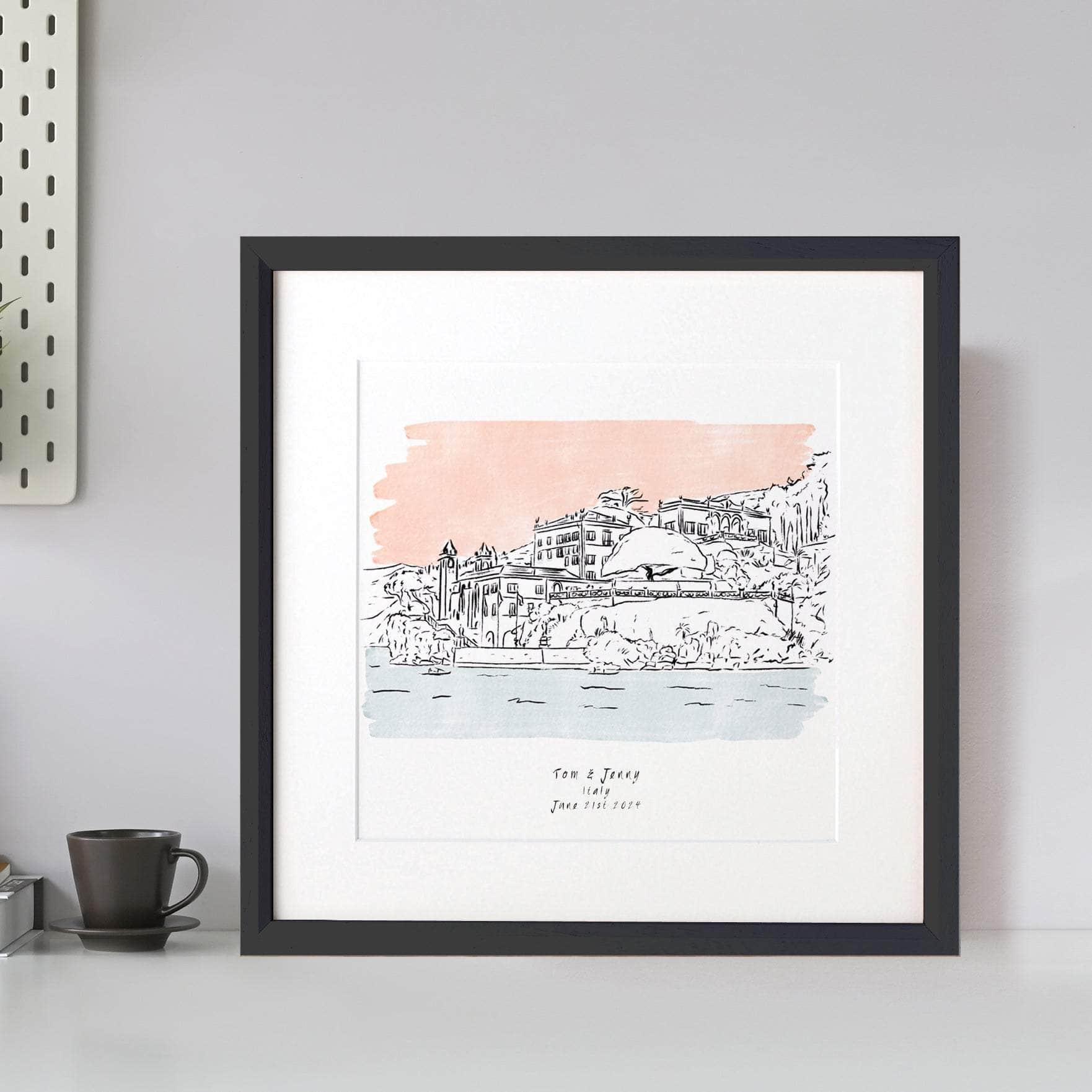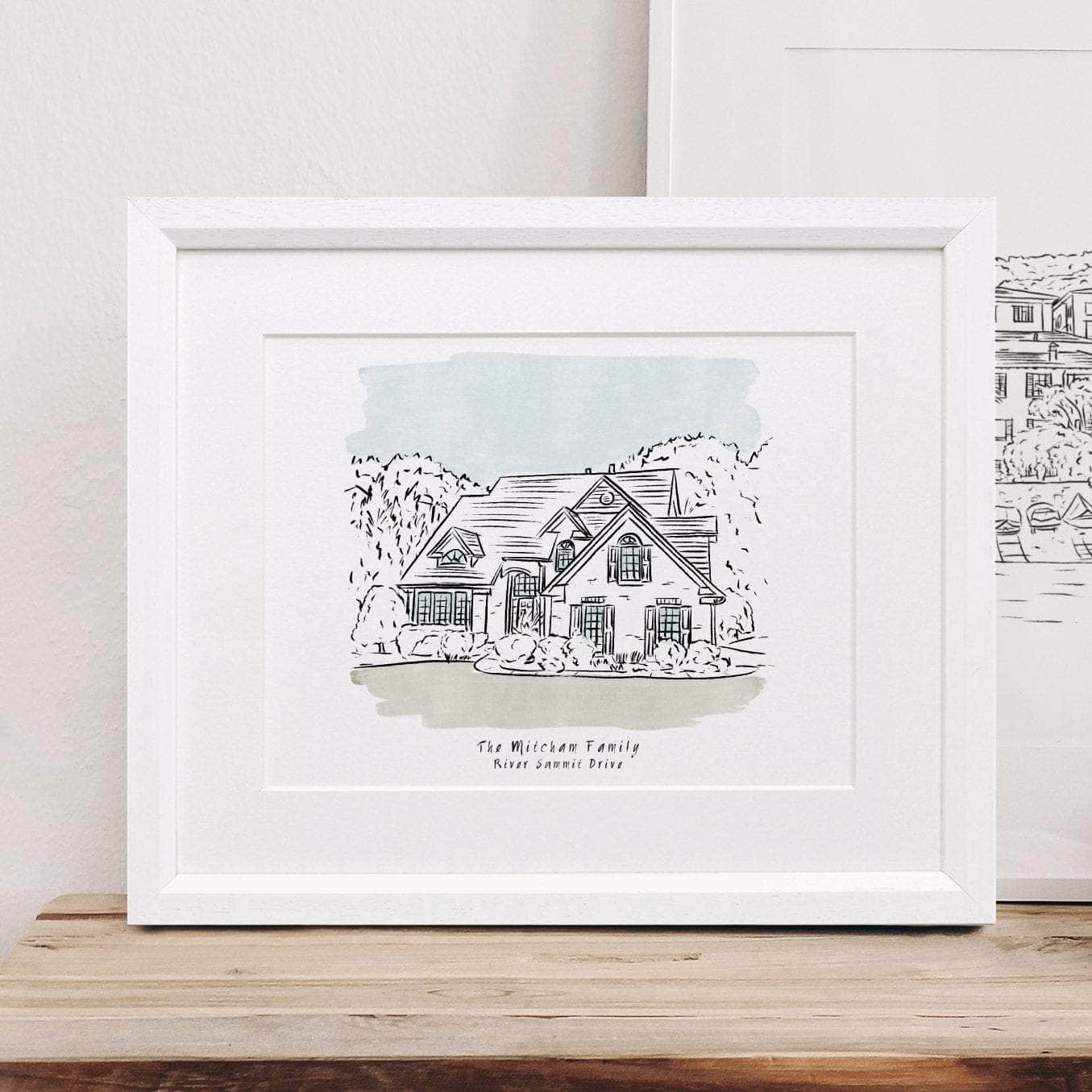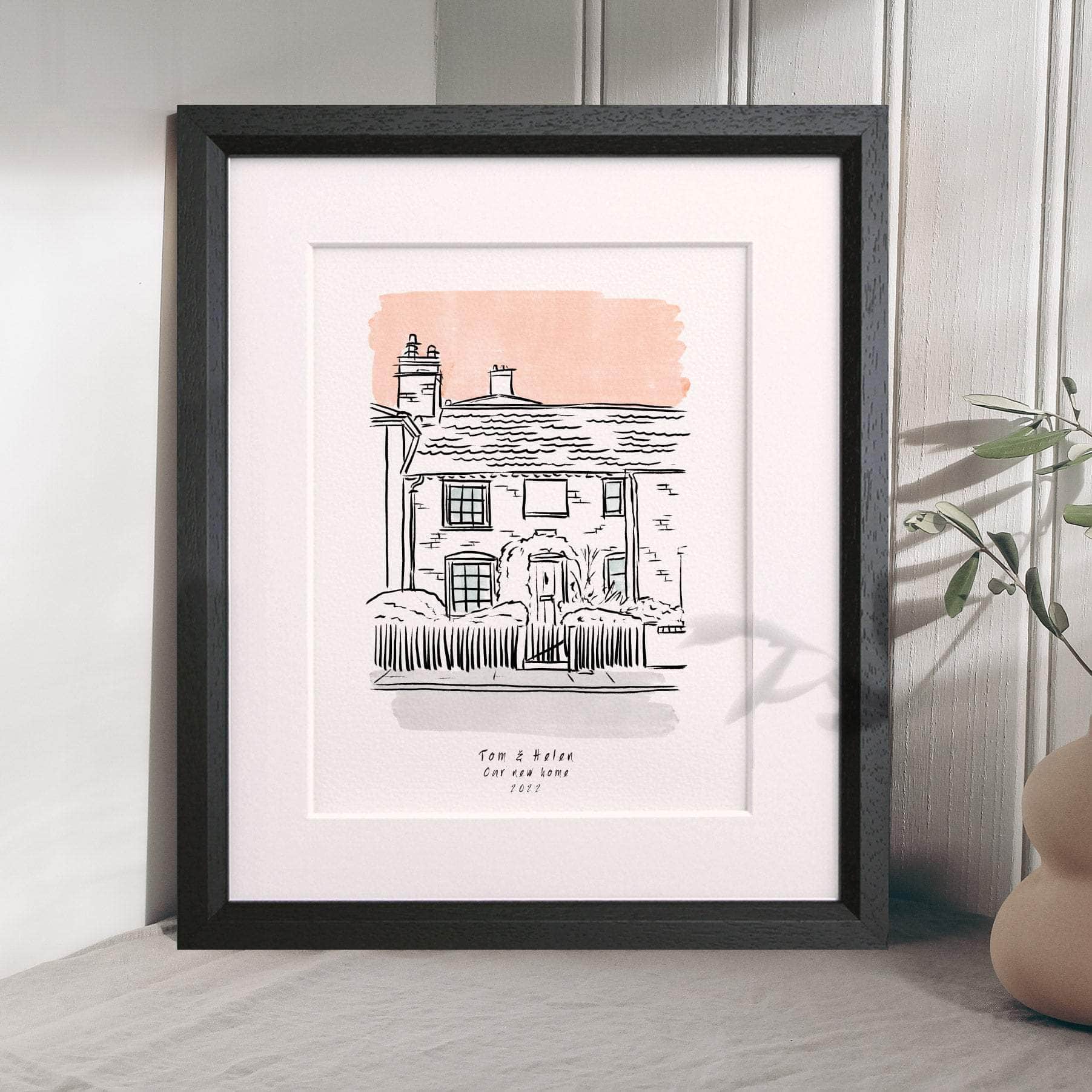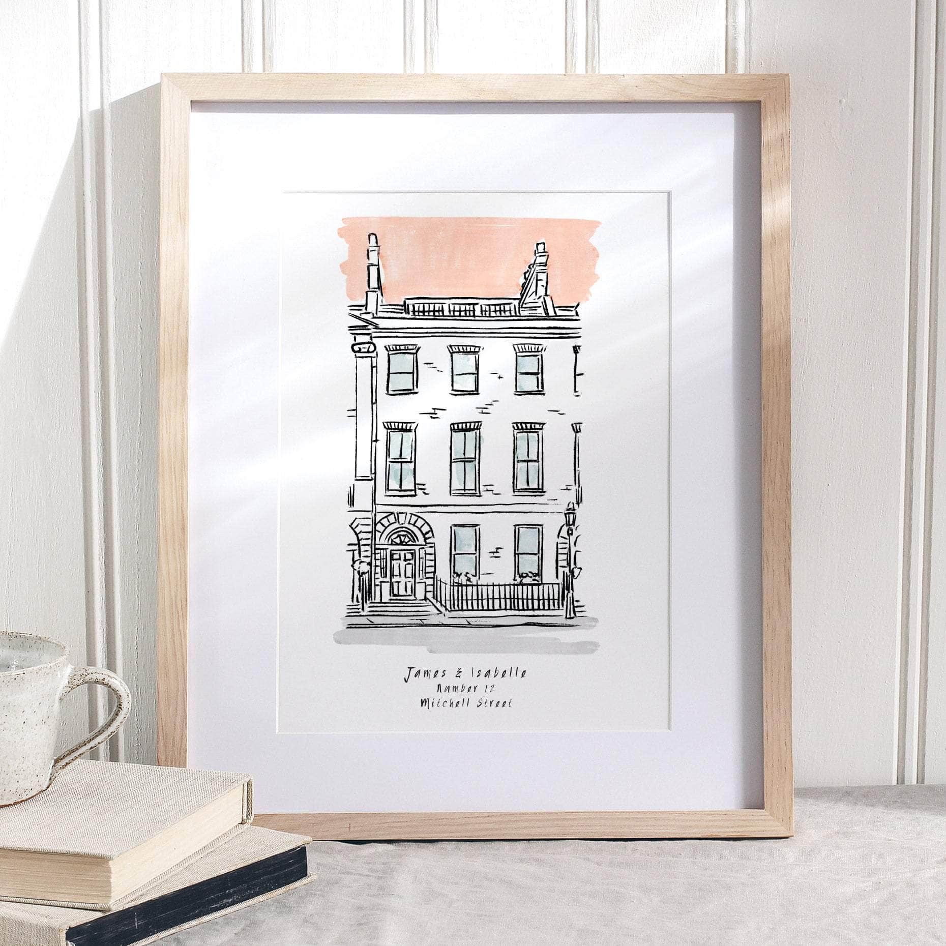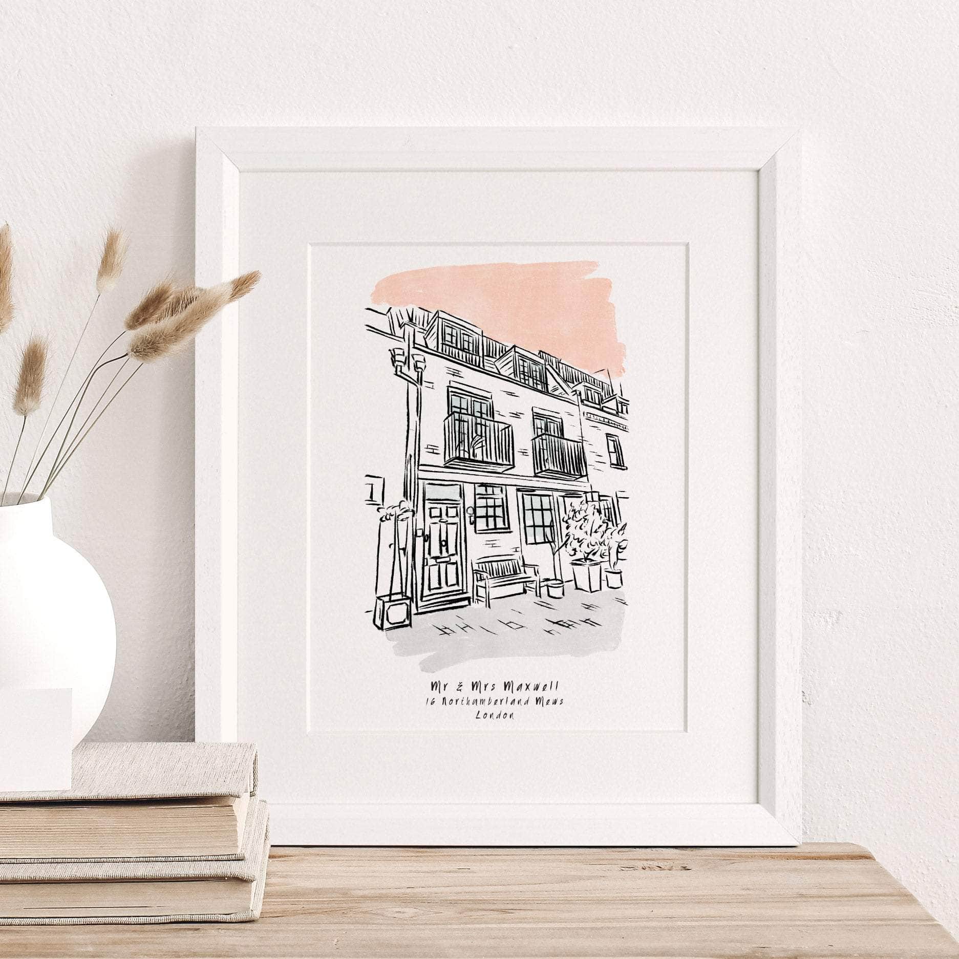 We can draw a variety of buildings anything from townhouses, flats, cottages, villas… the choice is yours. We use thicker brushes on these portraits, creating a more loose interpretation of the building compared to our classic watercolour style. Choose your sky colour, either contemporary coral or traditional blue. We add sage or grey for the ground, and pale blue for windows, while the building and gardens are left white. Personalised with your choice of text in a hand-painted font.