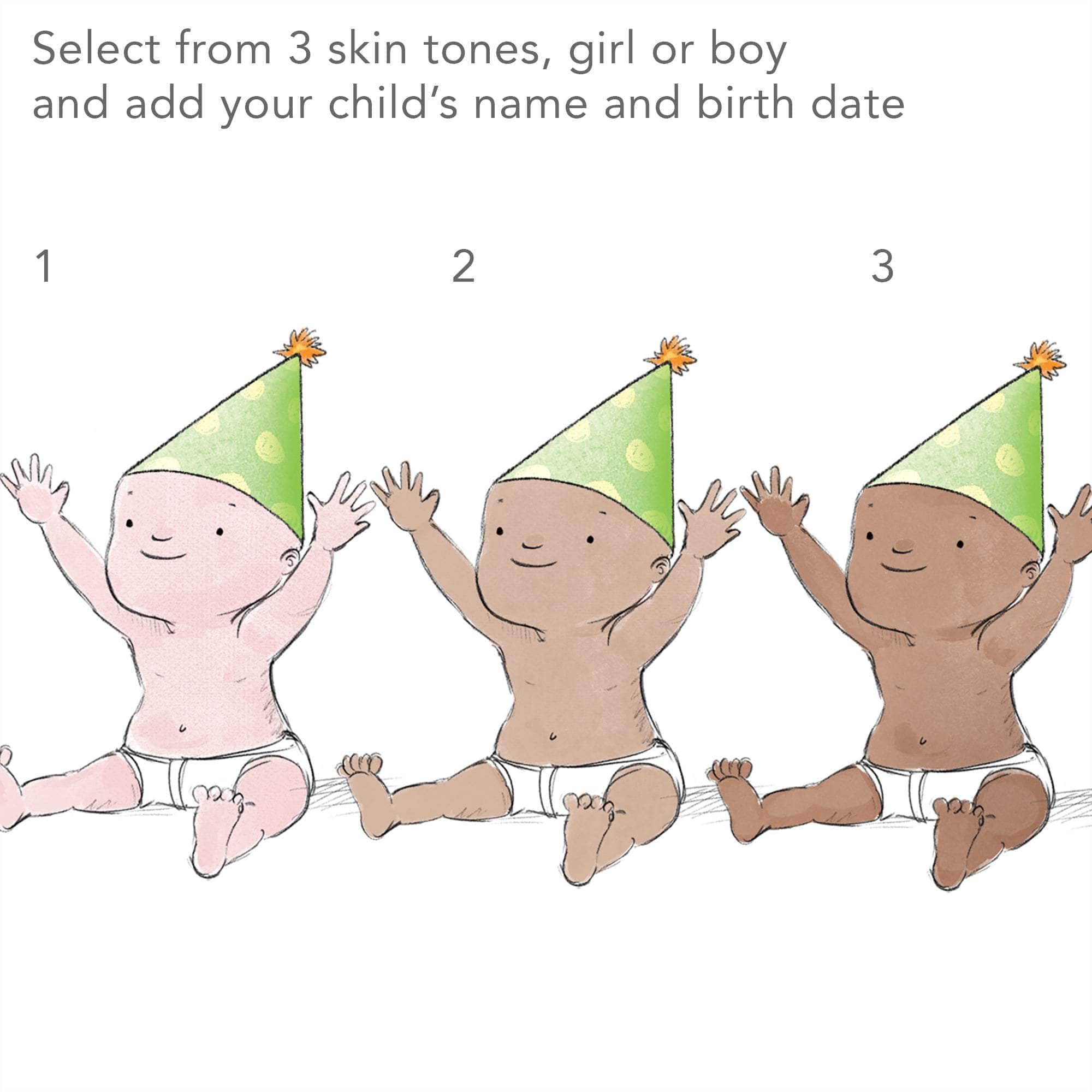 Personalised throughout, choose a suitable skin tone from our range of 3 characters. The baby wears a hat and romper suit throughout, so it's suitable for little girls and boys.. A beautiful keepsake to commemorate baby's first birthday.