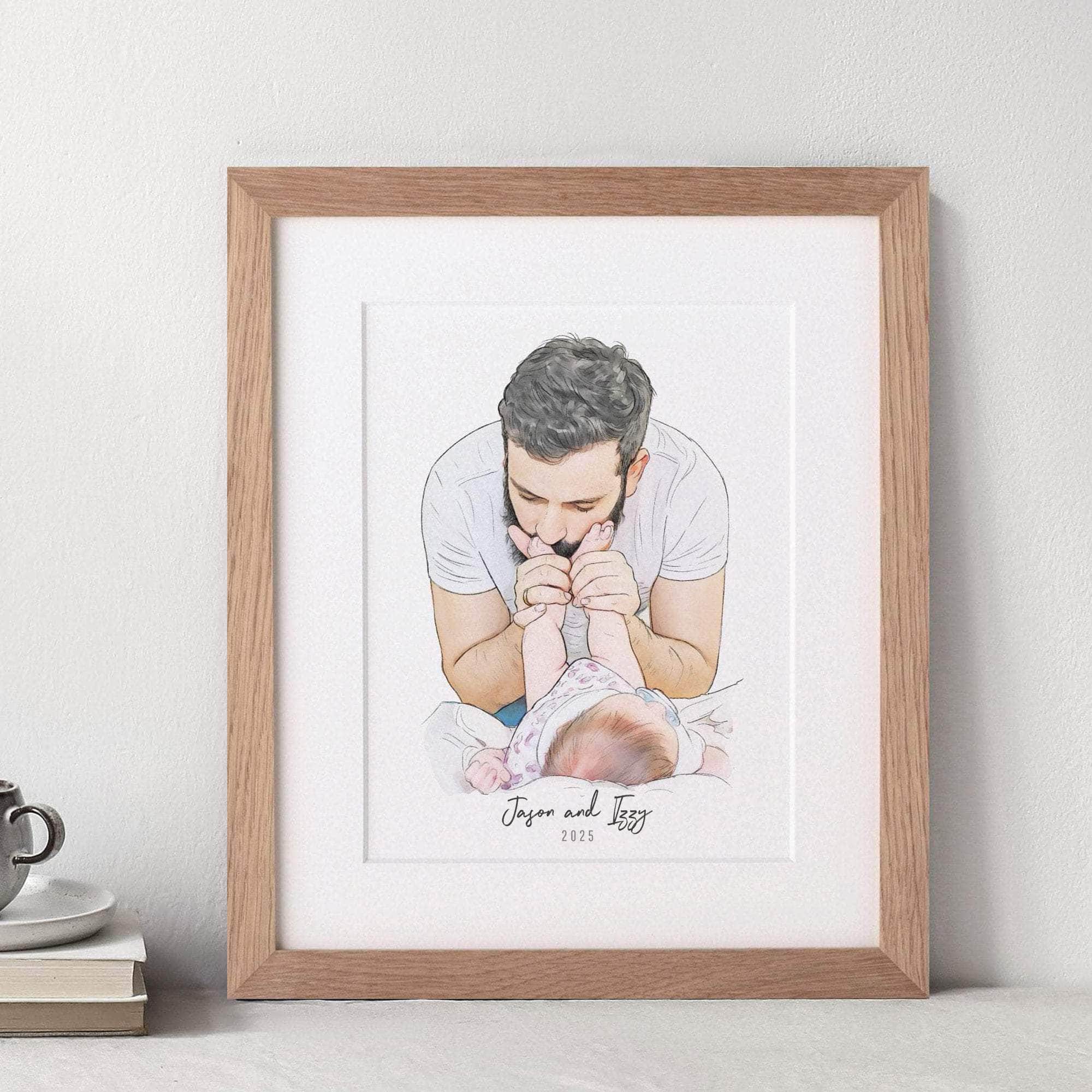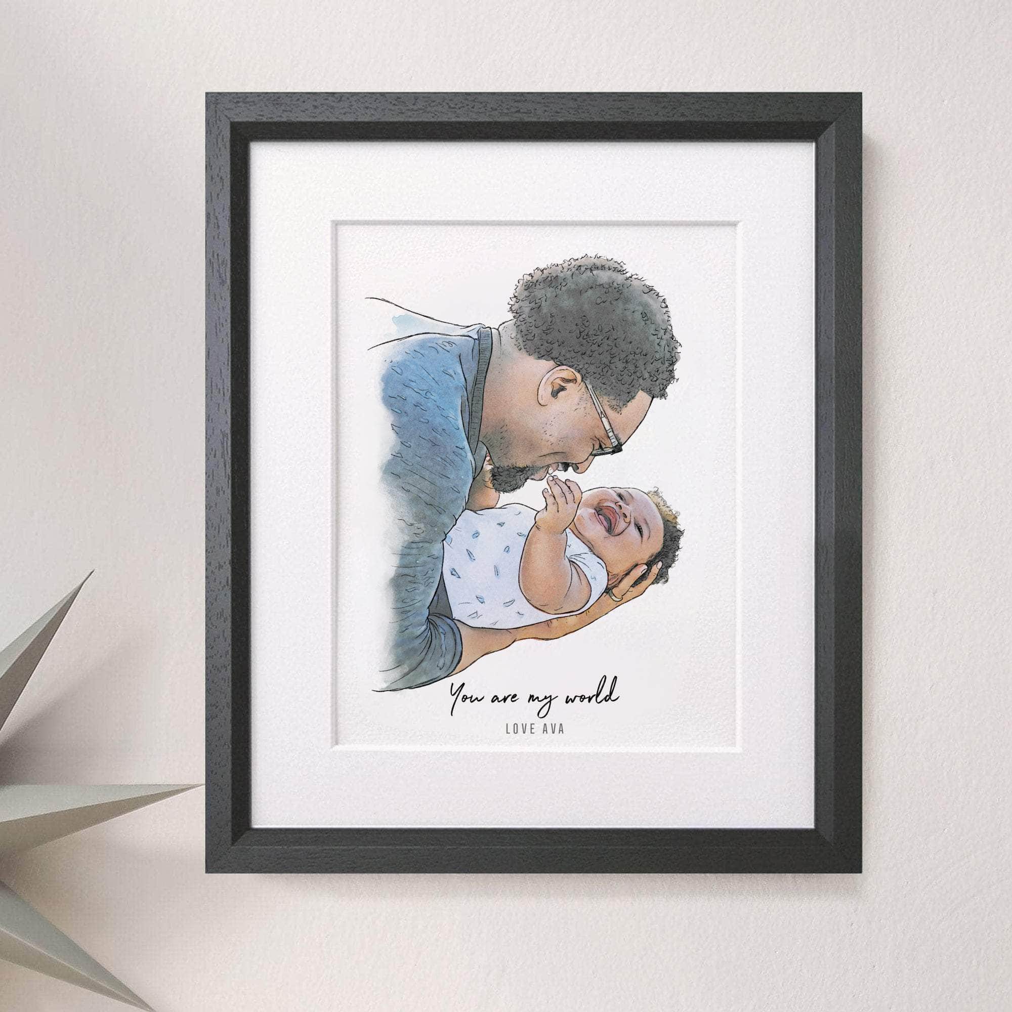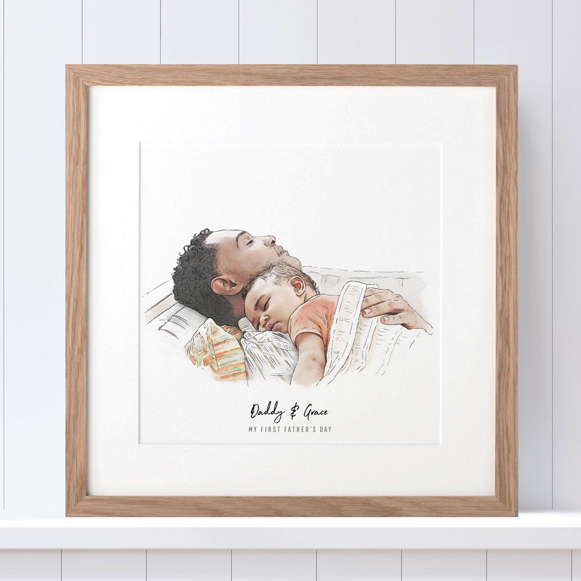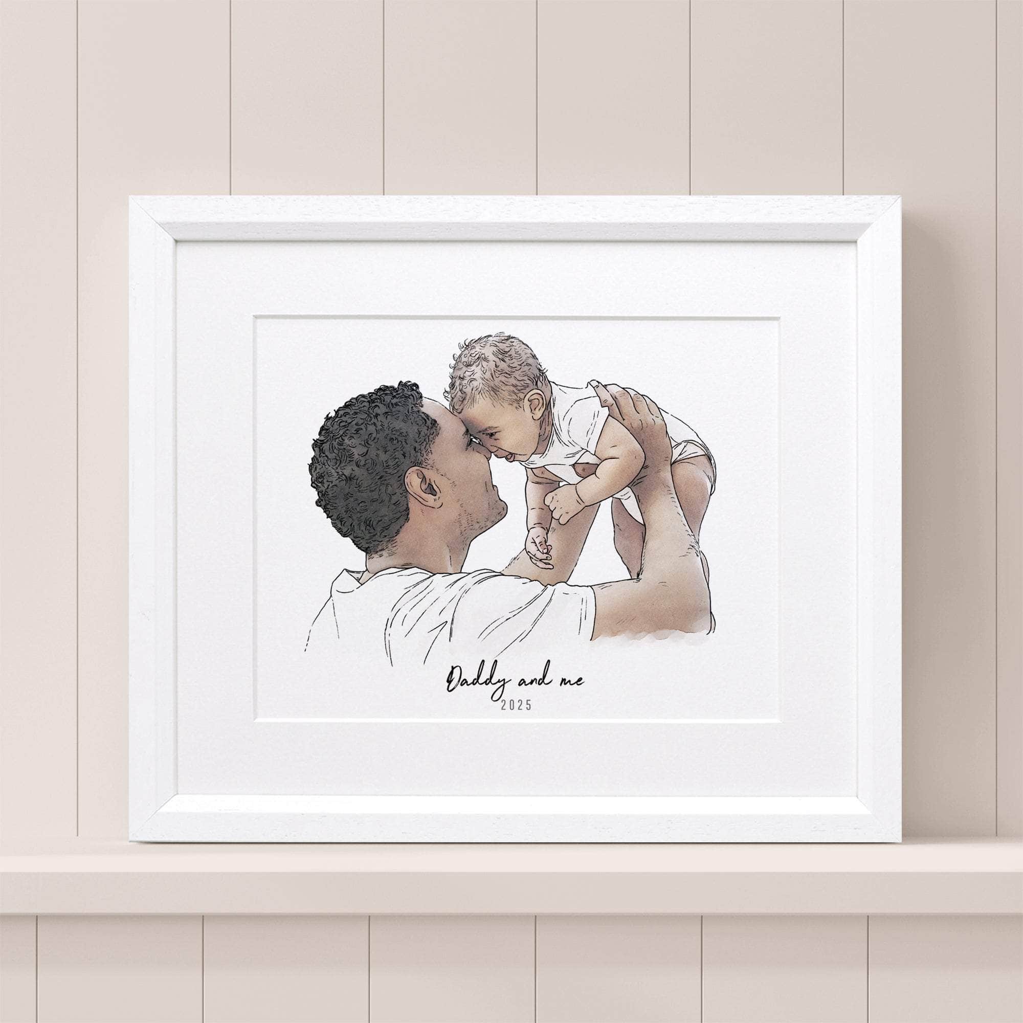 A hand-drawn watercolour illustration of Daddy and child - a gorgeous birthday gift for a new Dad or for his first Father's Day.