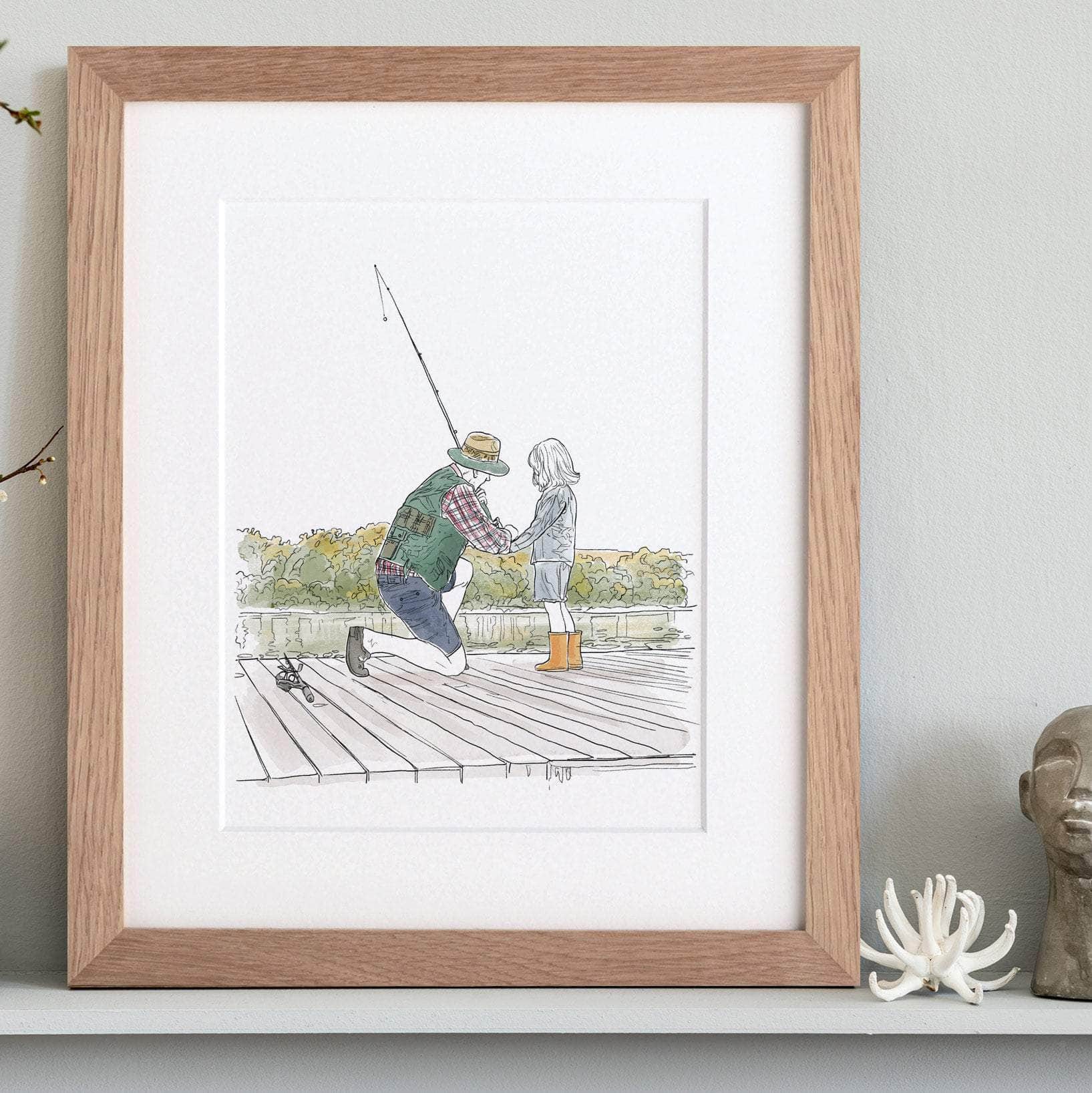 Our portraits are drawn in a freehand, flowing line style, capturing the subject's outline from the photograph's perspective, with clothing highlighted in watercolour. You also have the option to include full watercolour, where the artist will enhance the entire subject with watercolour details. Background details are omitted unless specifically requested as an option. The final illustration is digitally printed for a vibrant, polished look.
