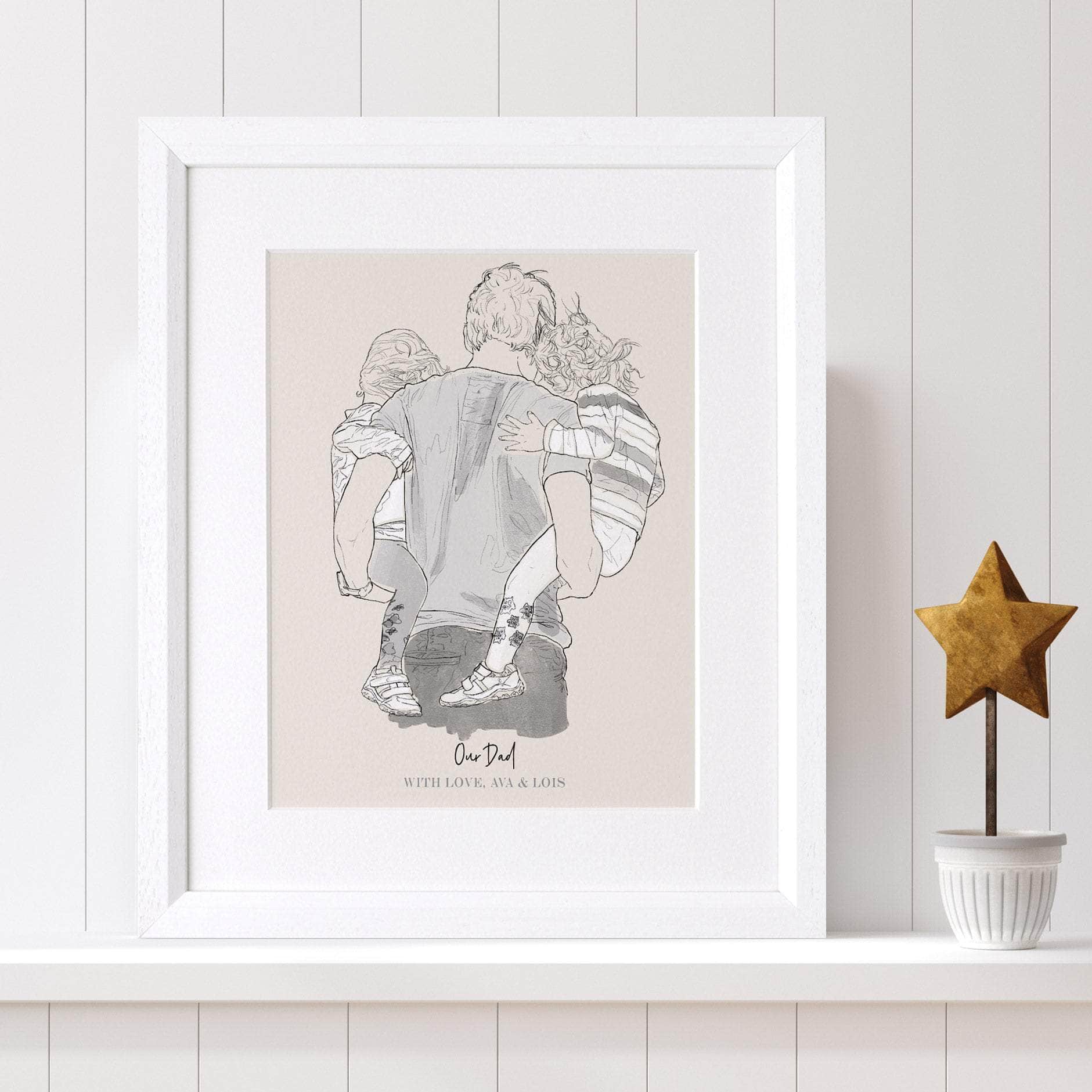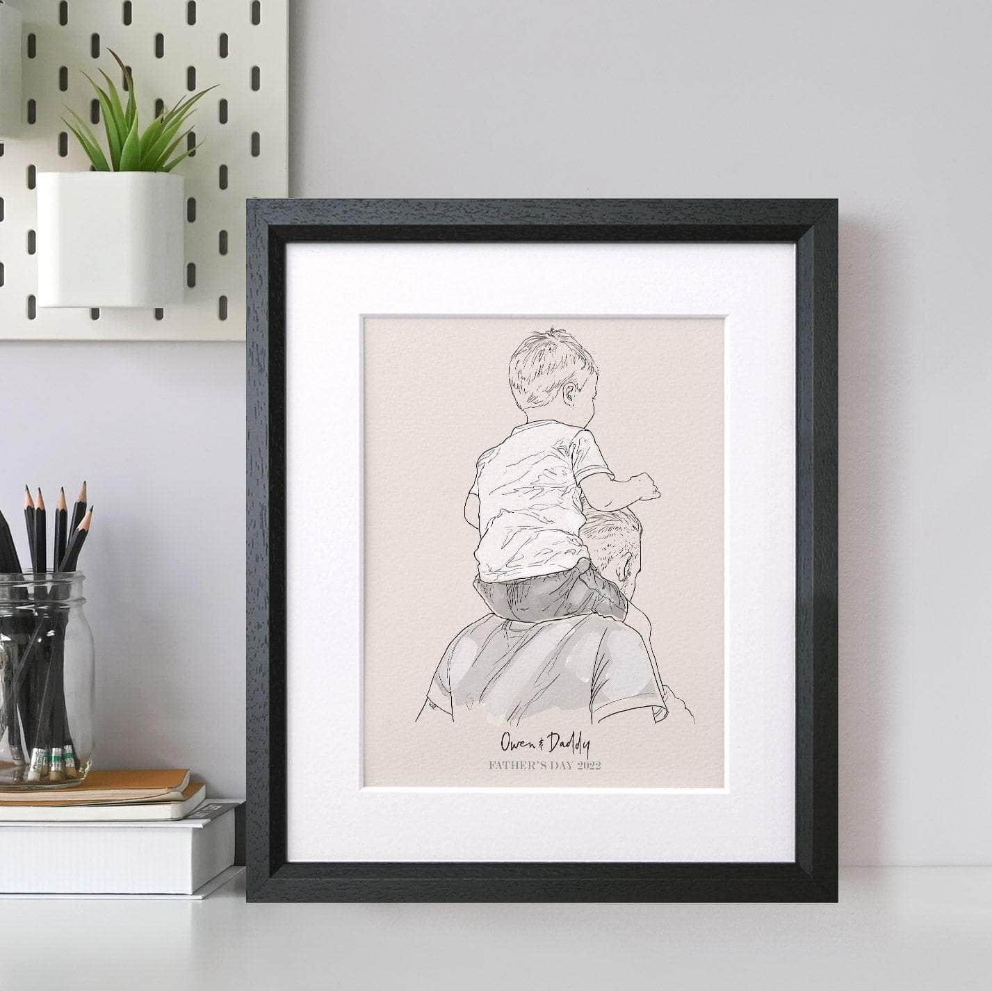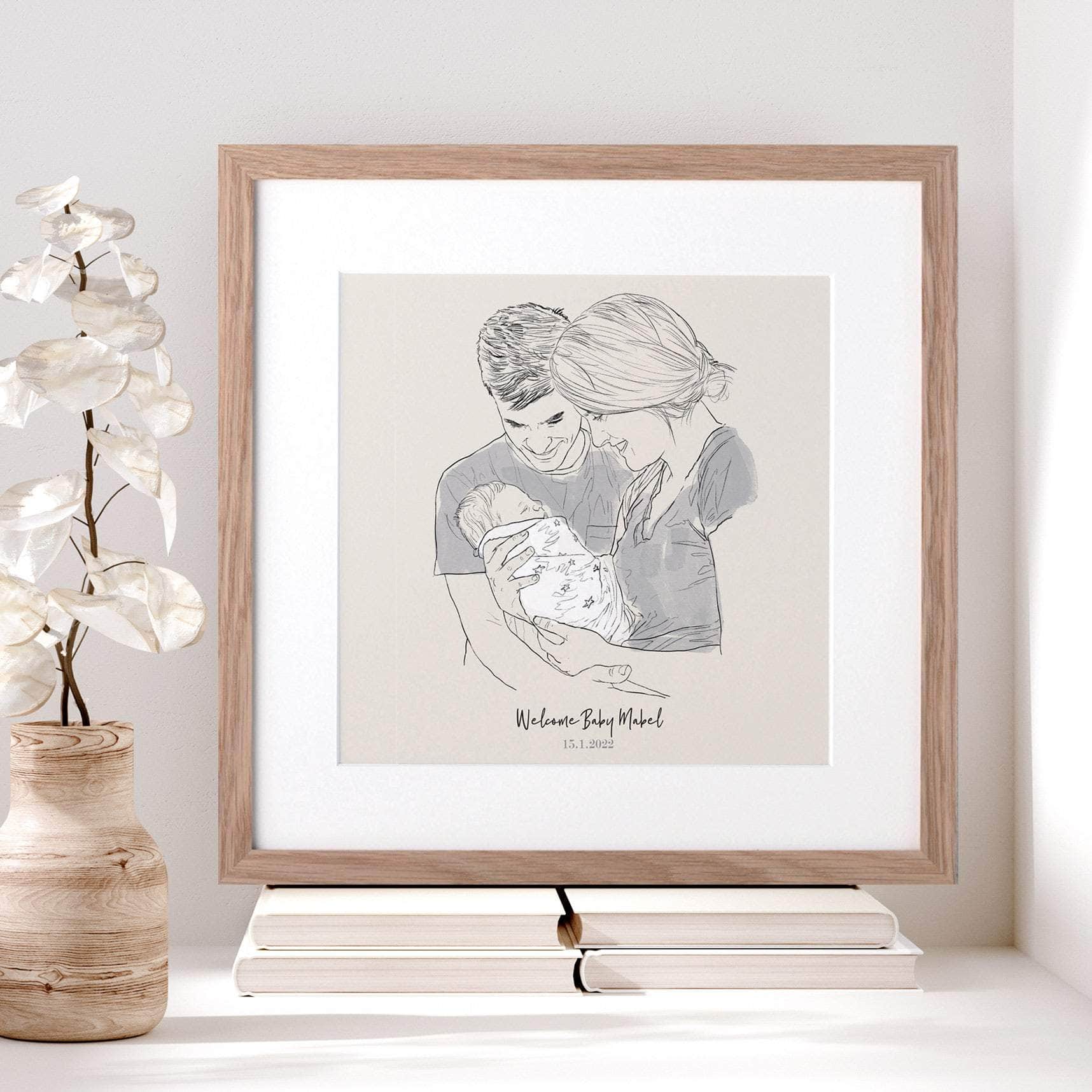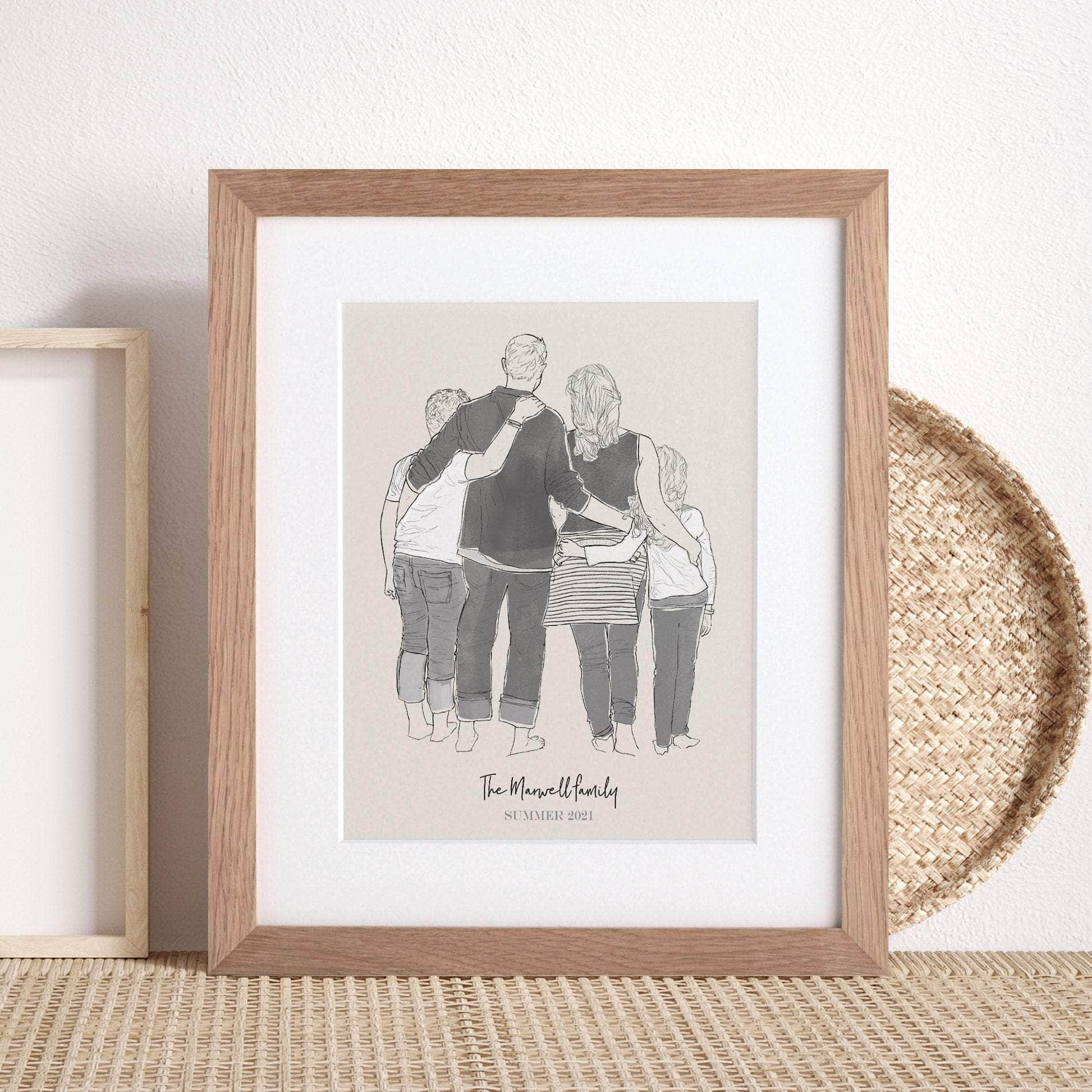 A black and white hand drawn watercolour sketch based on your favourite family photo, printed and personalised with your choice of text below.