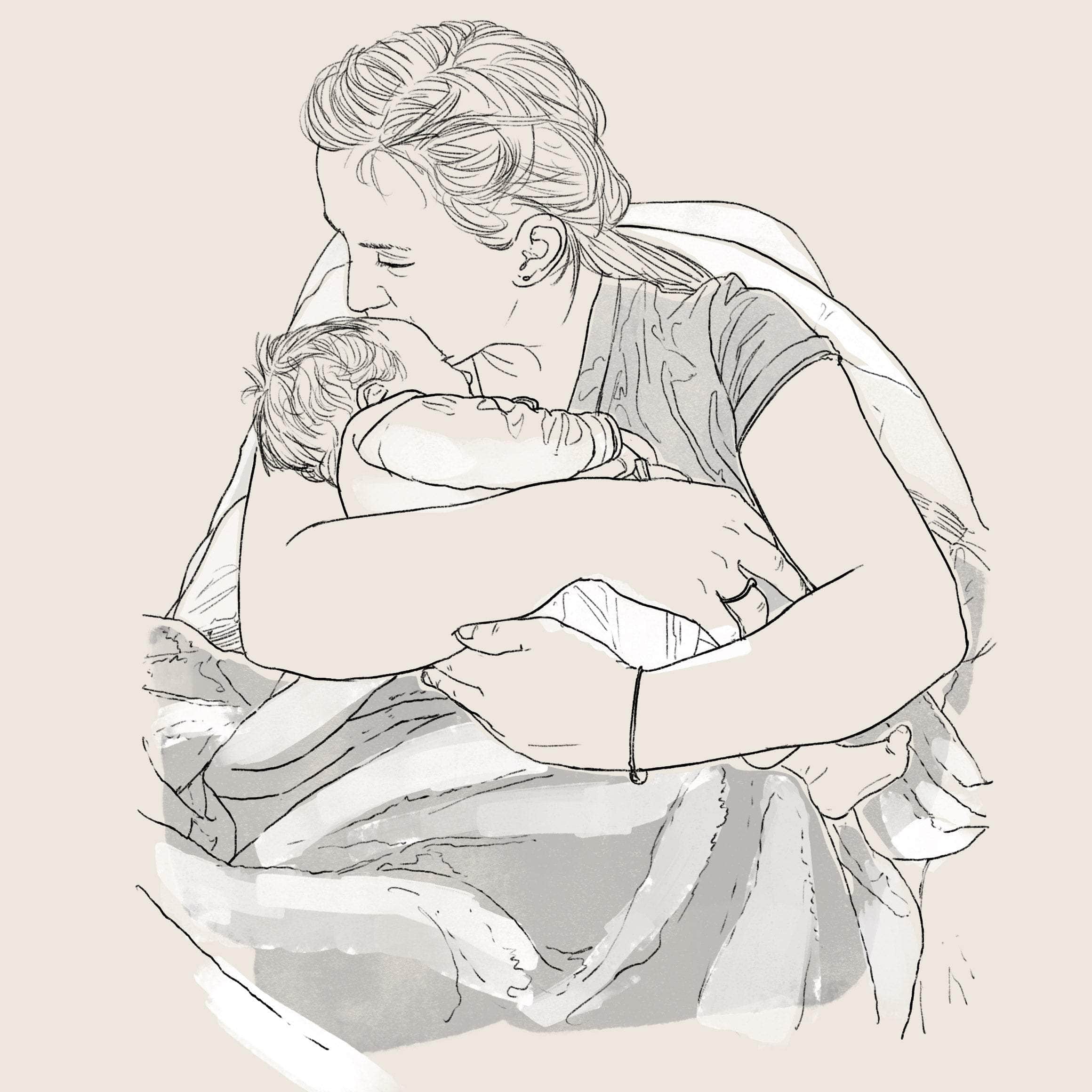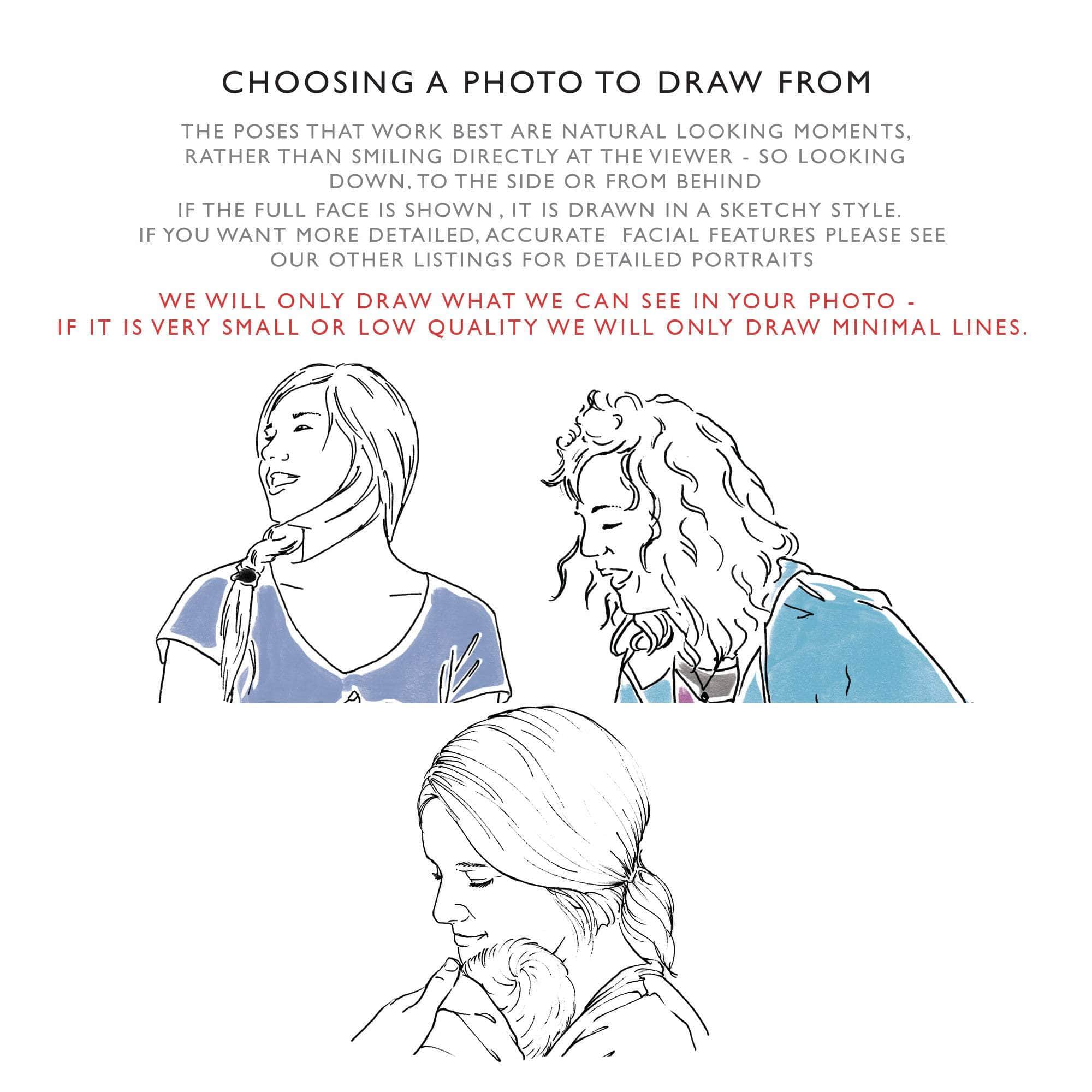 This is a sketch rather than a detailed drawing - what we draw will depend on the quality of your photo and what we can see. The poses that work best are natural looking moments, rather than smiling directly at the viewer - so looking down, to the side or from behind.