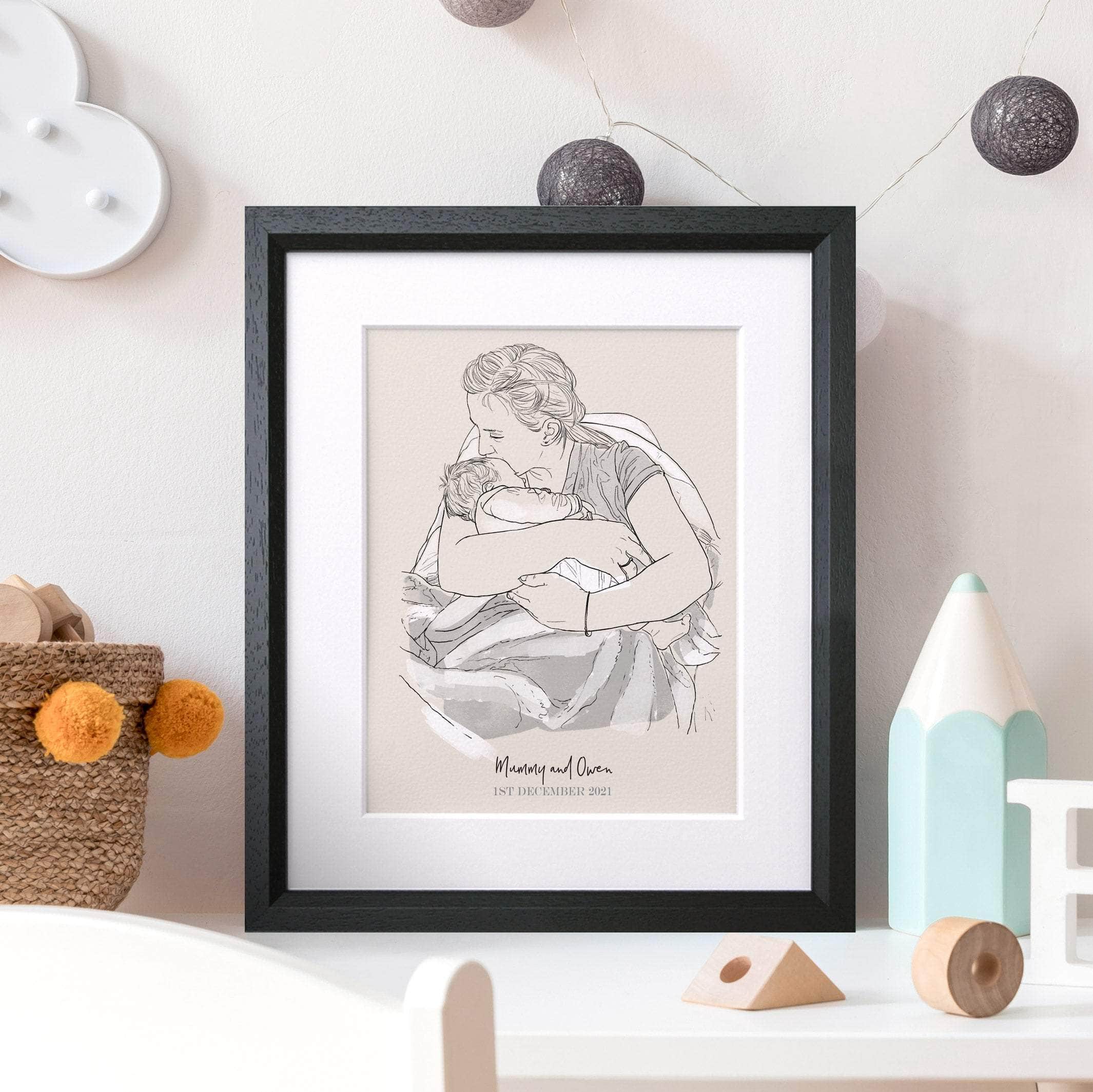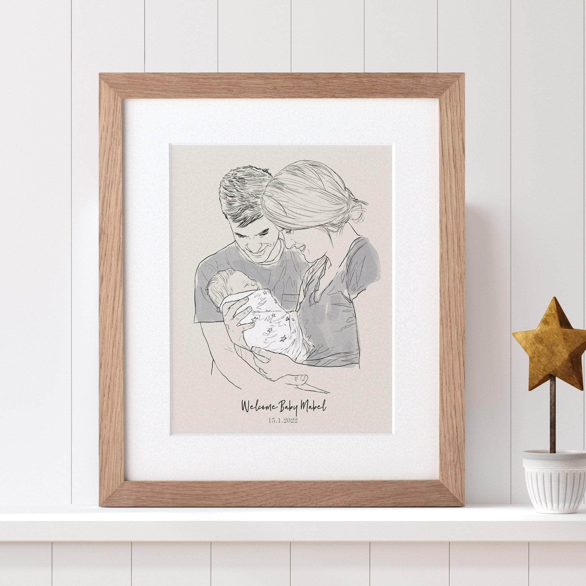 A black and white hand drawn watercolour sketch based on your photo, printed and personalised with your choice of text below. A beautiful family portrait - the perfect gift for new parents.