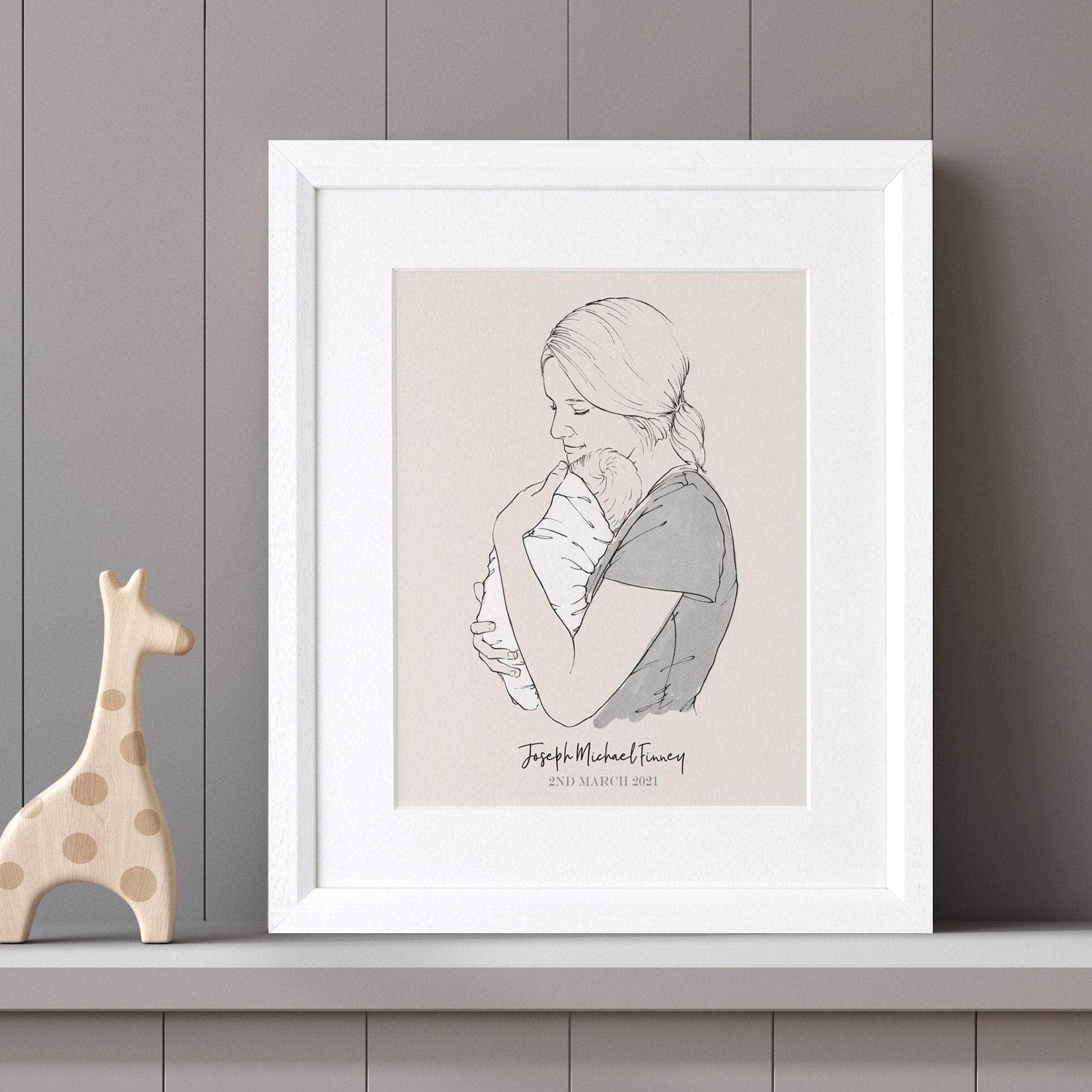 Monochrome New Parent And Baby Personalised Line Drawing