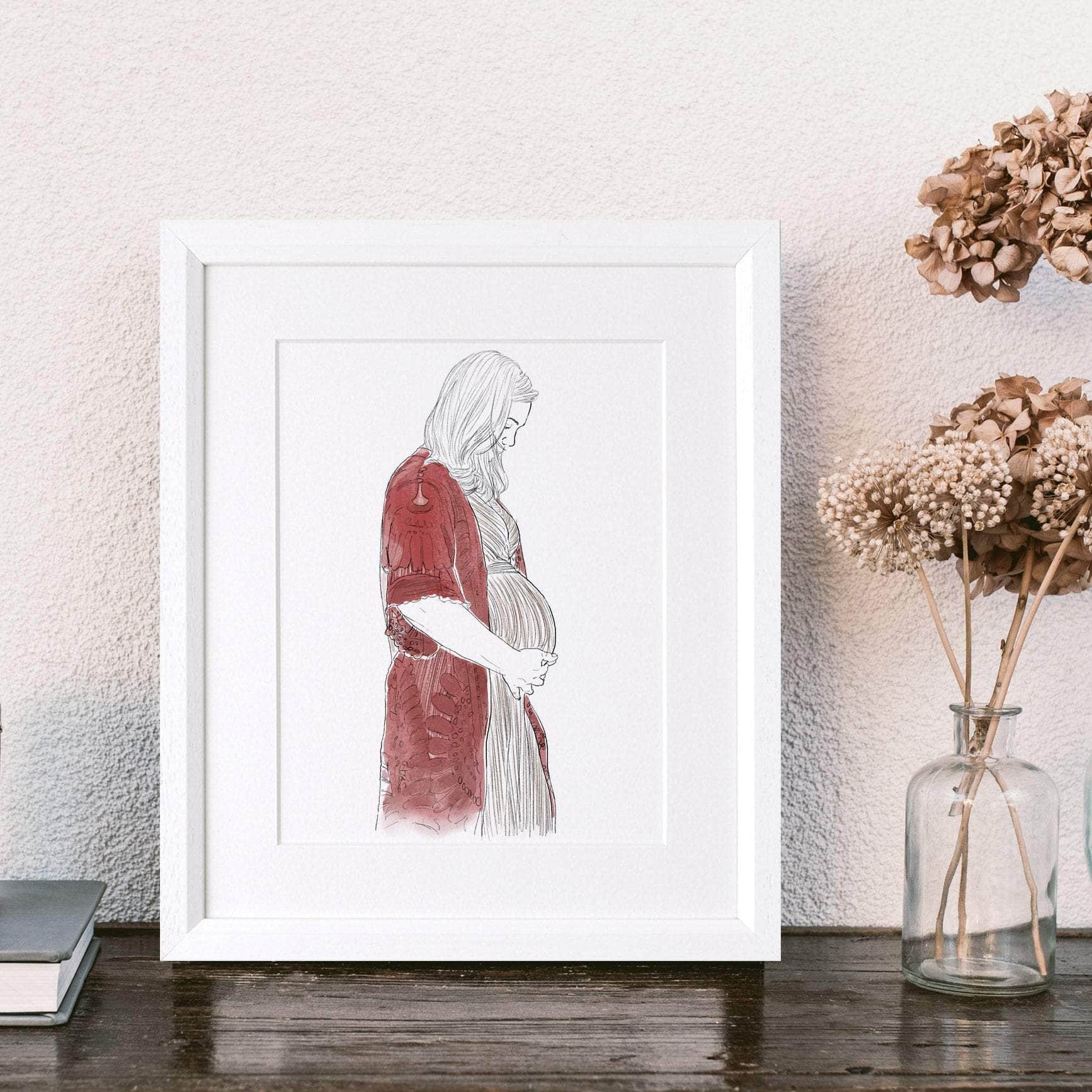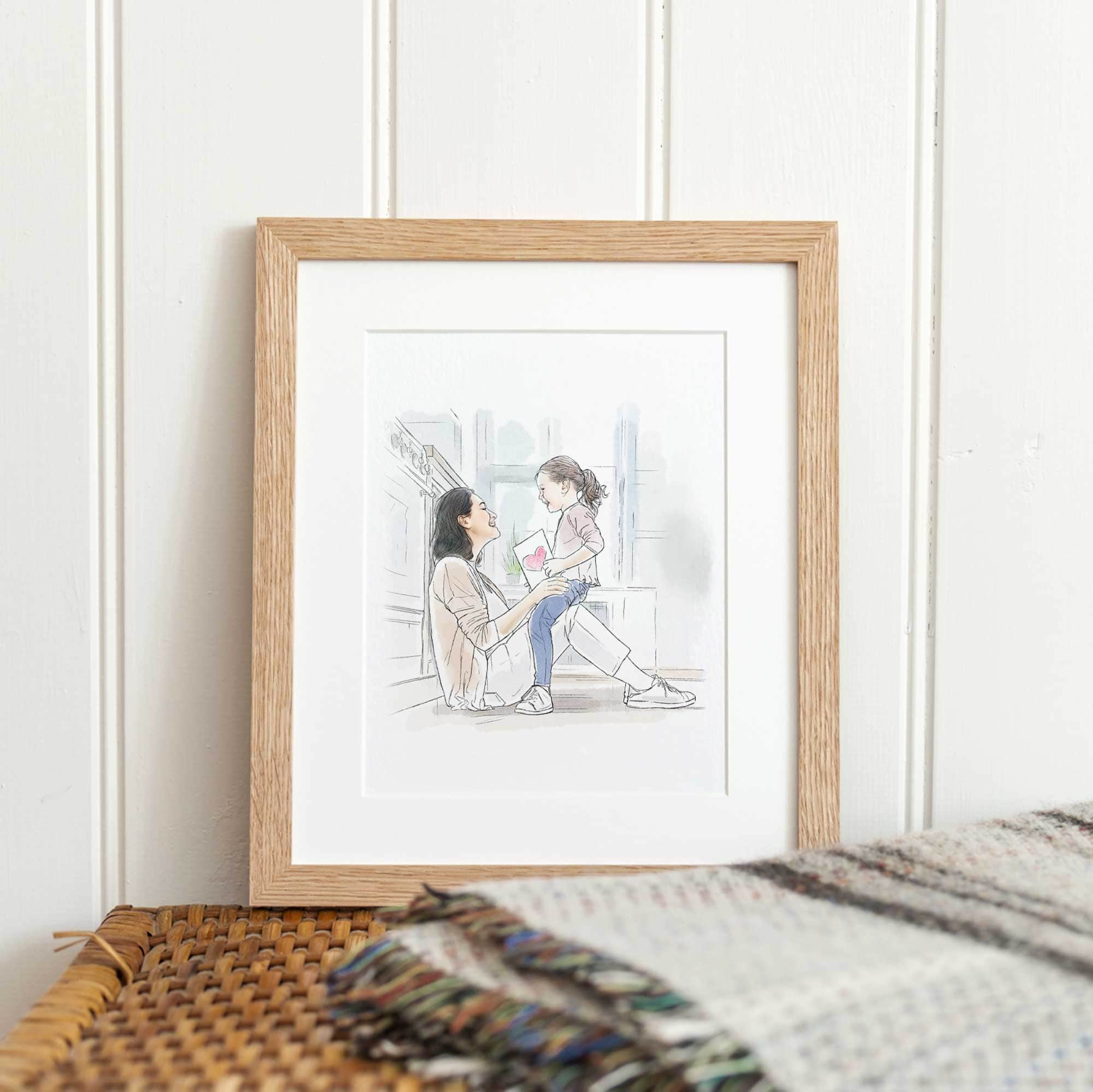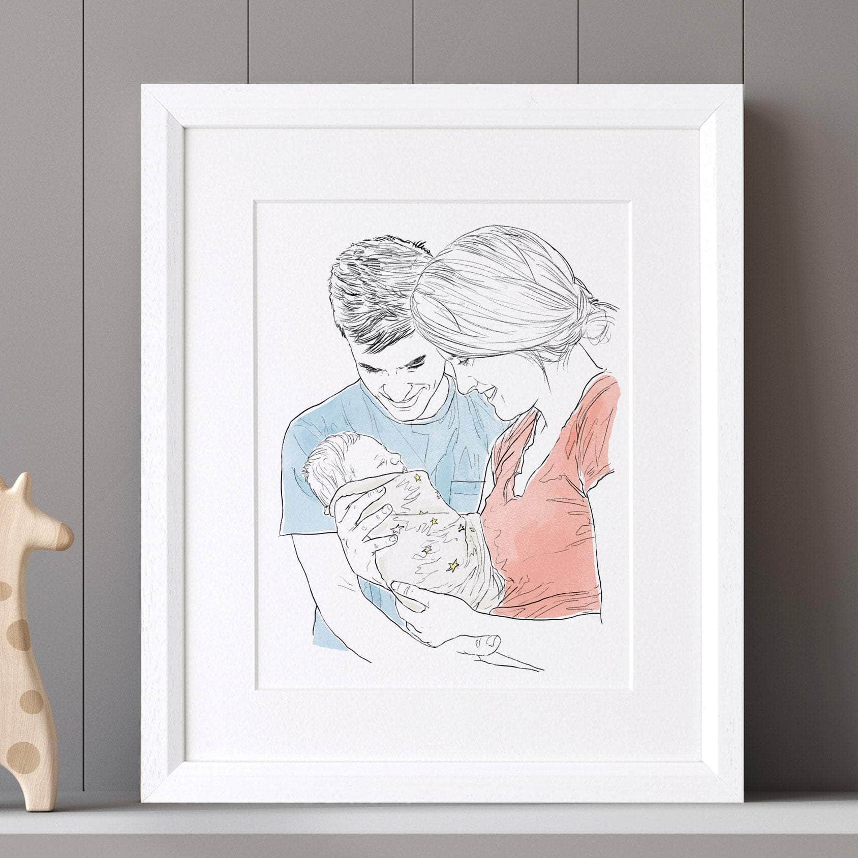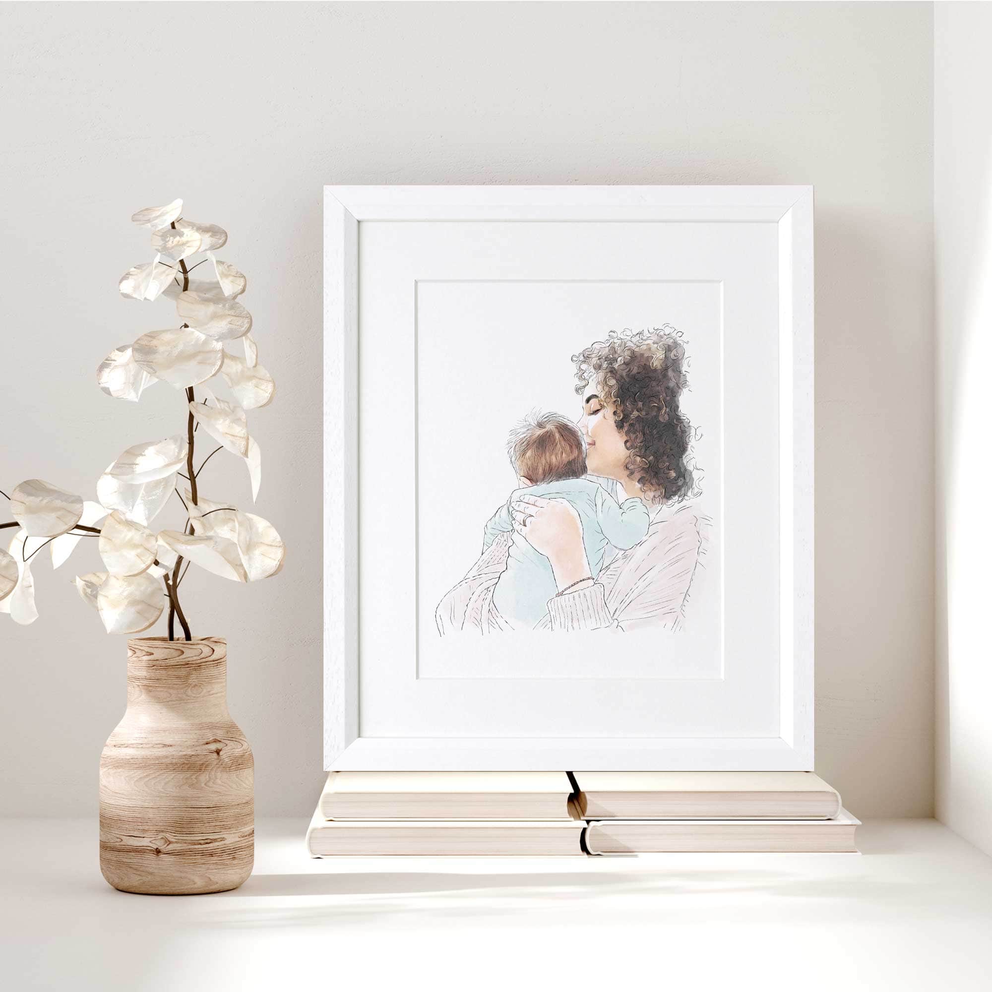 A personalised watercolour sketch based on a favourite photograph, hand-drawn by artists working in Devon. A special keepsake for a first Mother's Day and celebrating baby's arrival for new parents.