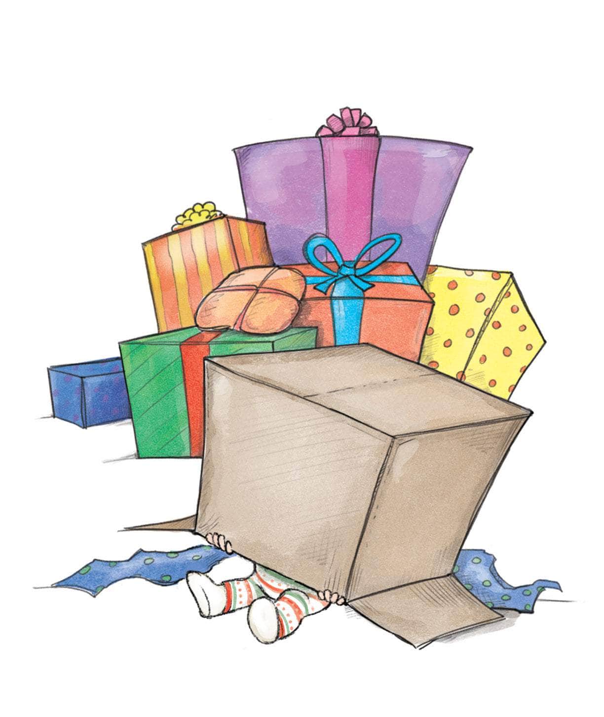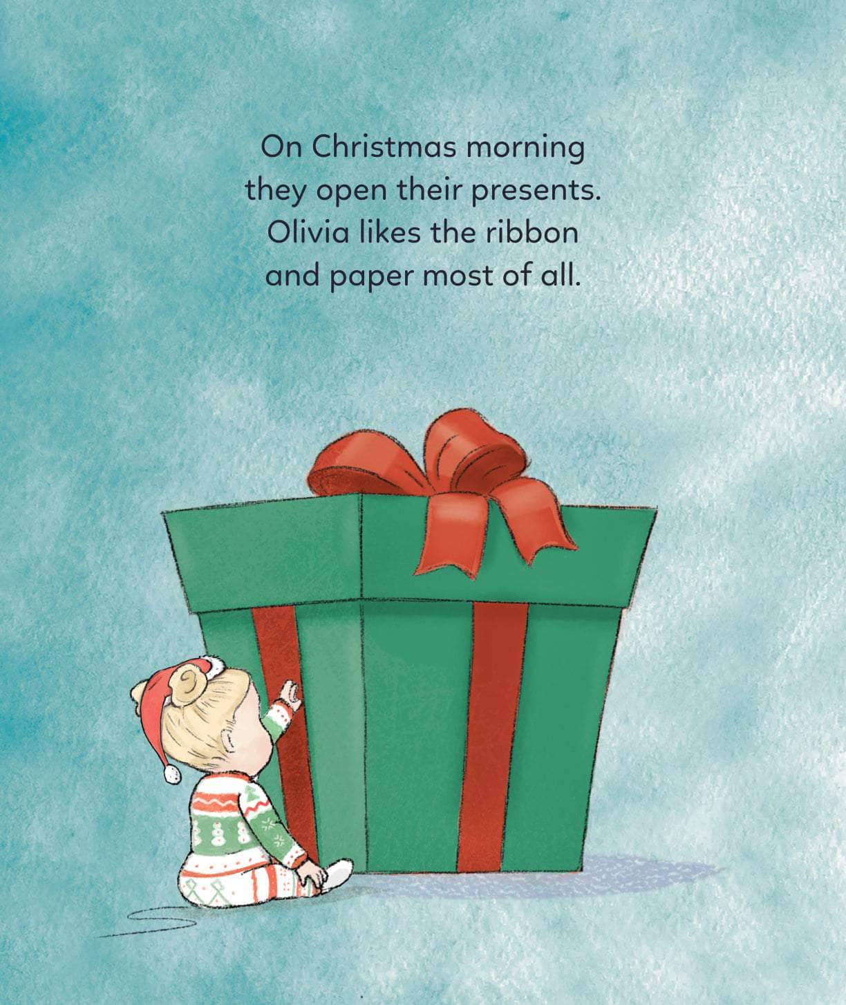On Christmas morning they open their presents. (Child’s name) likes the ribbon and paper most of all.