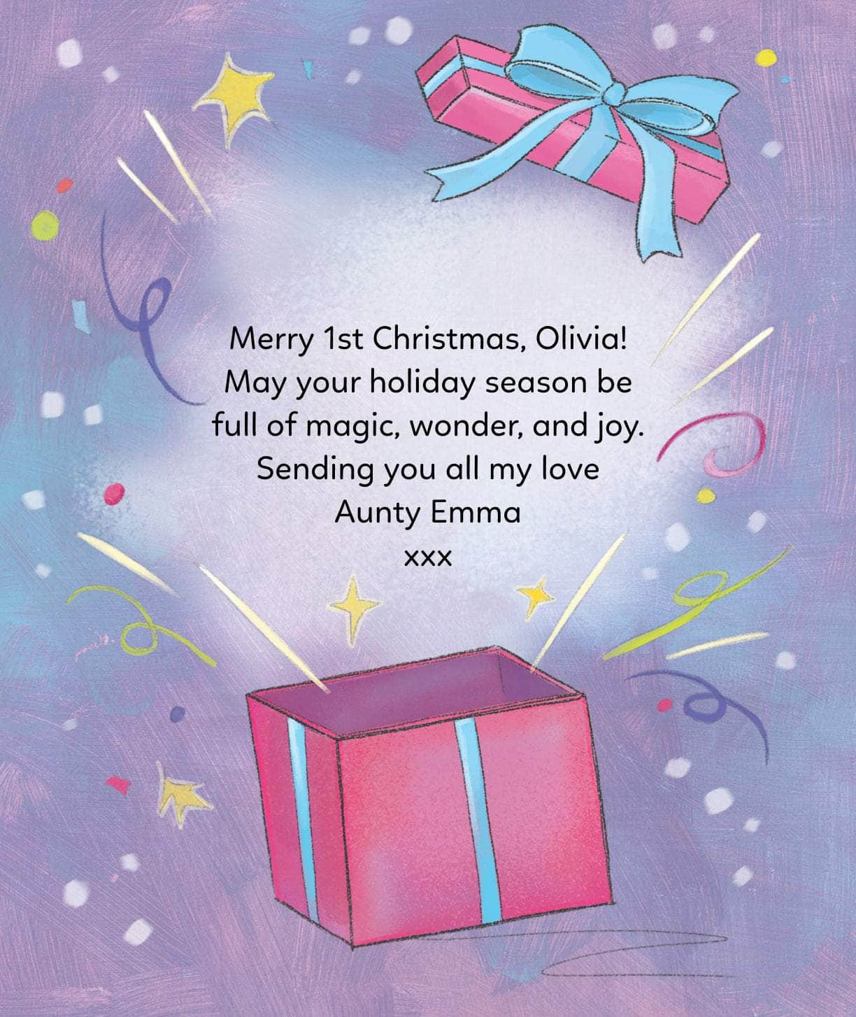 Treat a little one to a special gift to celebrate their first Christmas, with our beautifully illustrated First Christmas children's book. It features the child's name throughout for an extra-special touch and is sure to become one of their favourite stories!