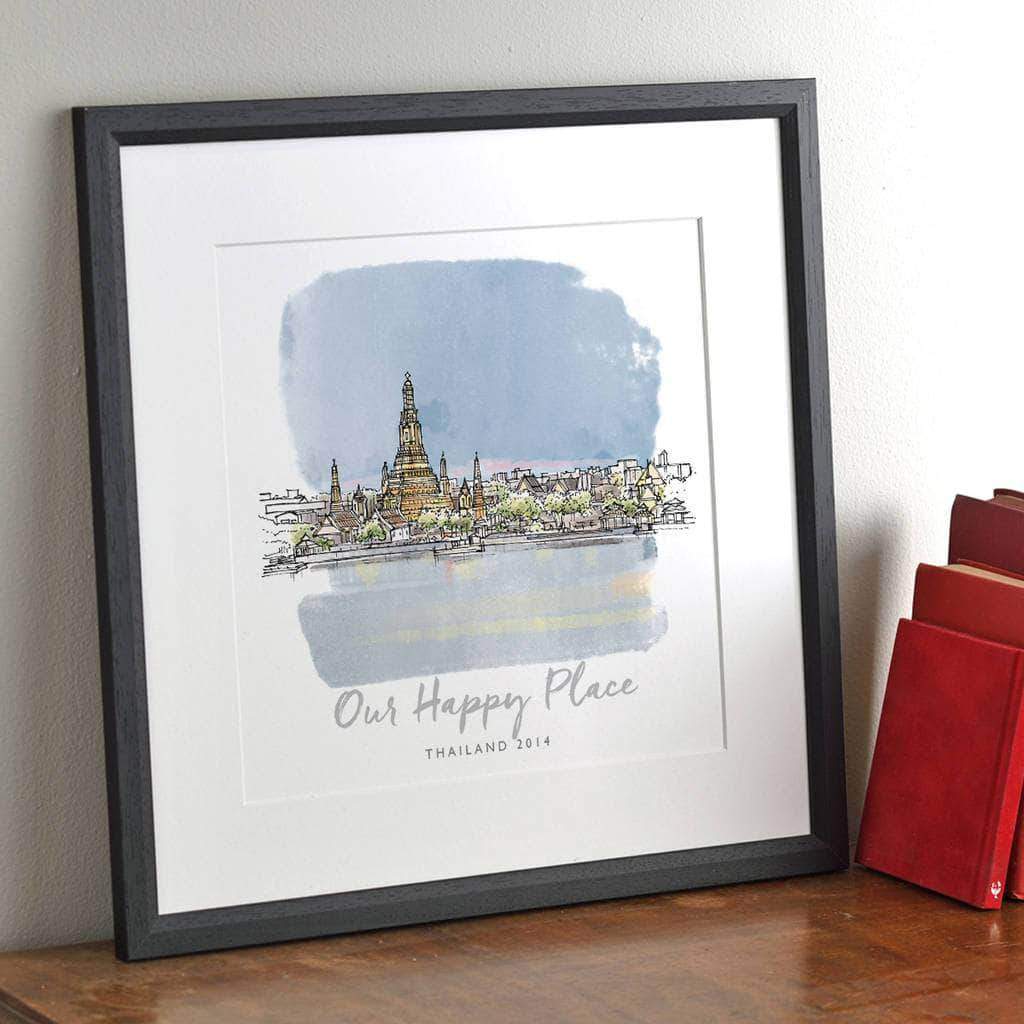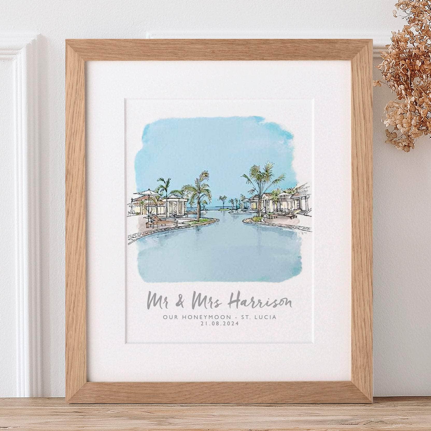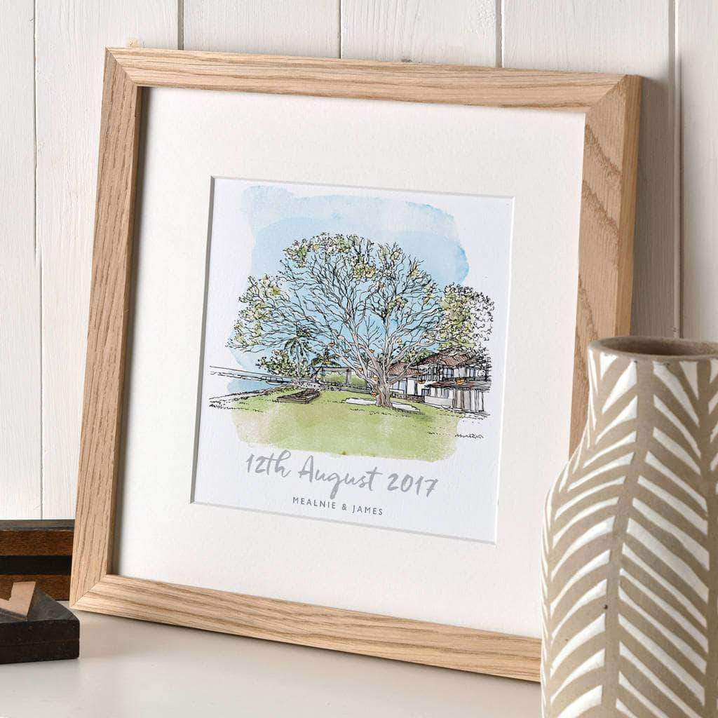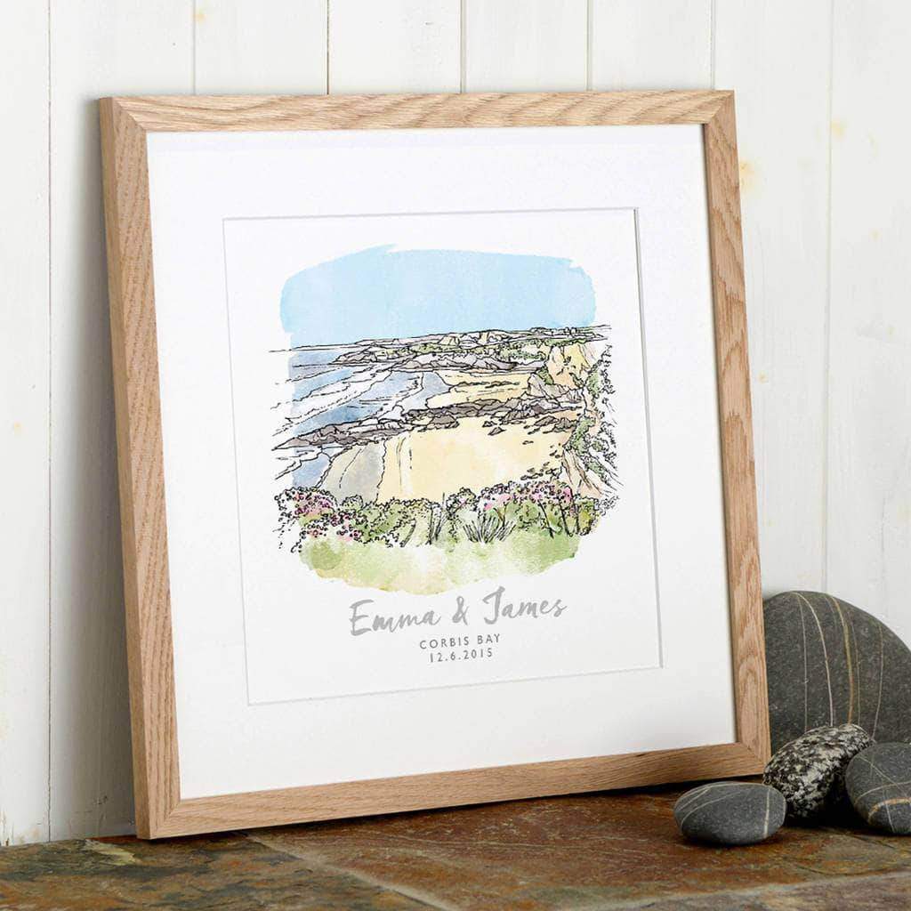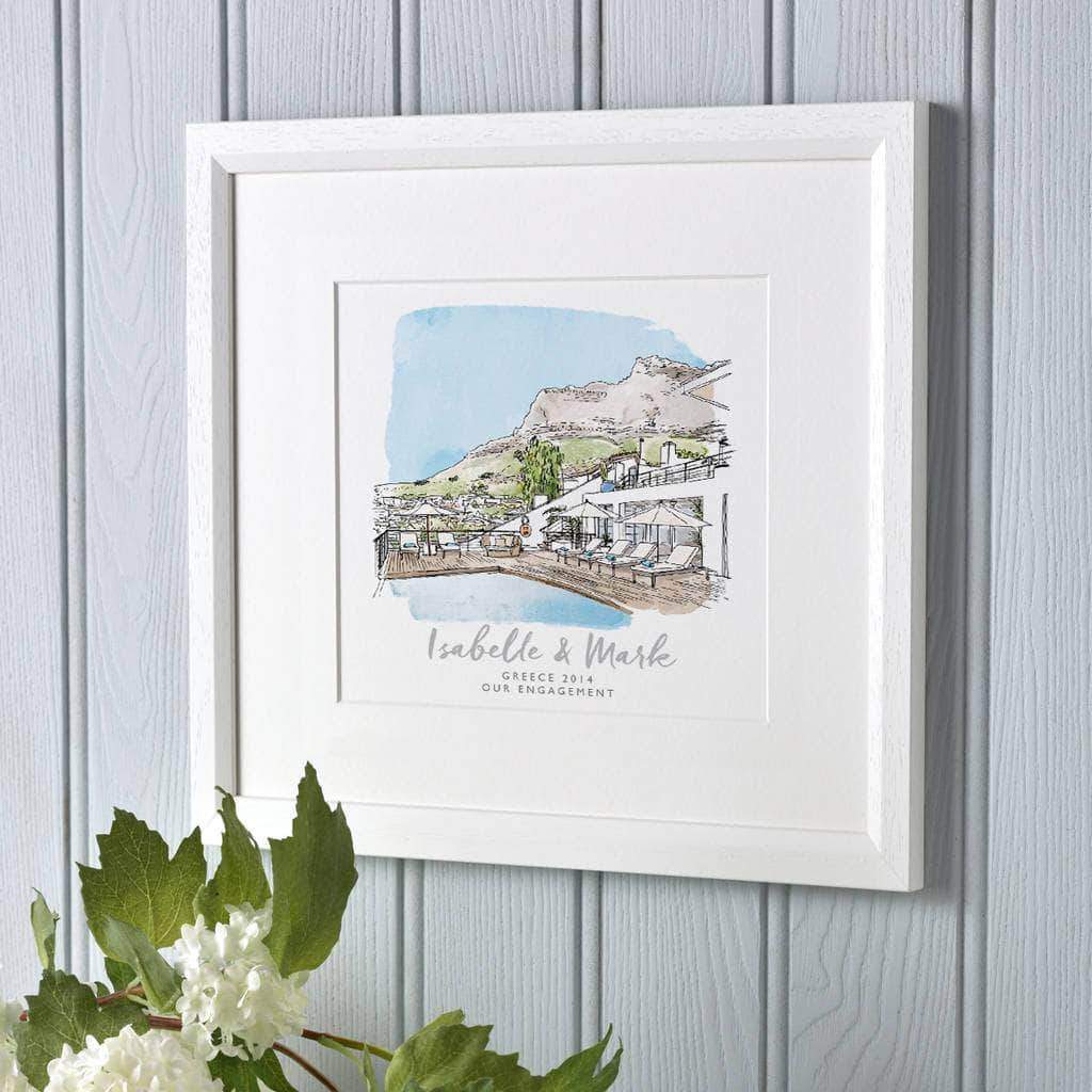 We can draw a variety of scenes eg: a holiday destination, honeymoon, where you proposed. We draw in a sketchy style to capture the outlines of the view, and colour in our painterly watercolour style. The illustration is personalised with your chosen words.