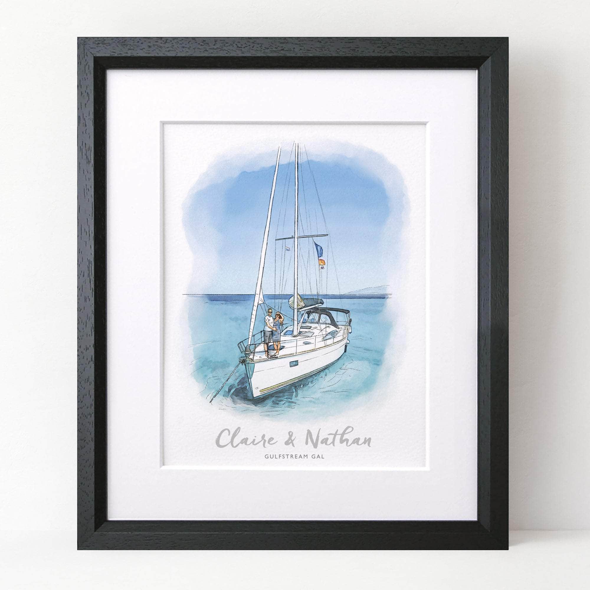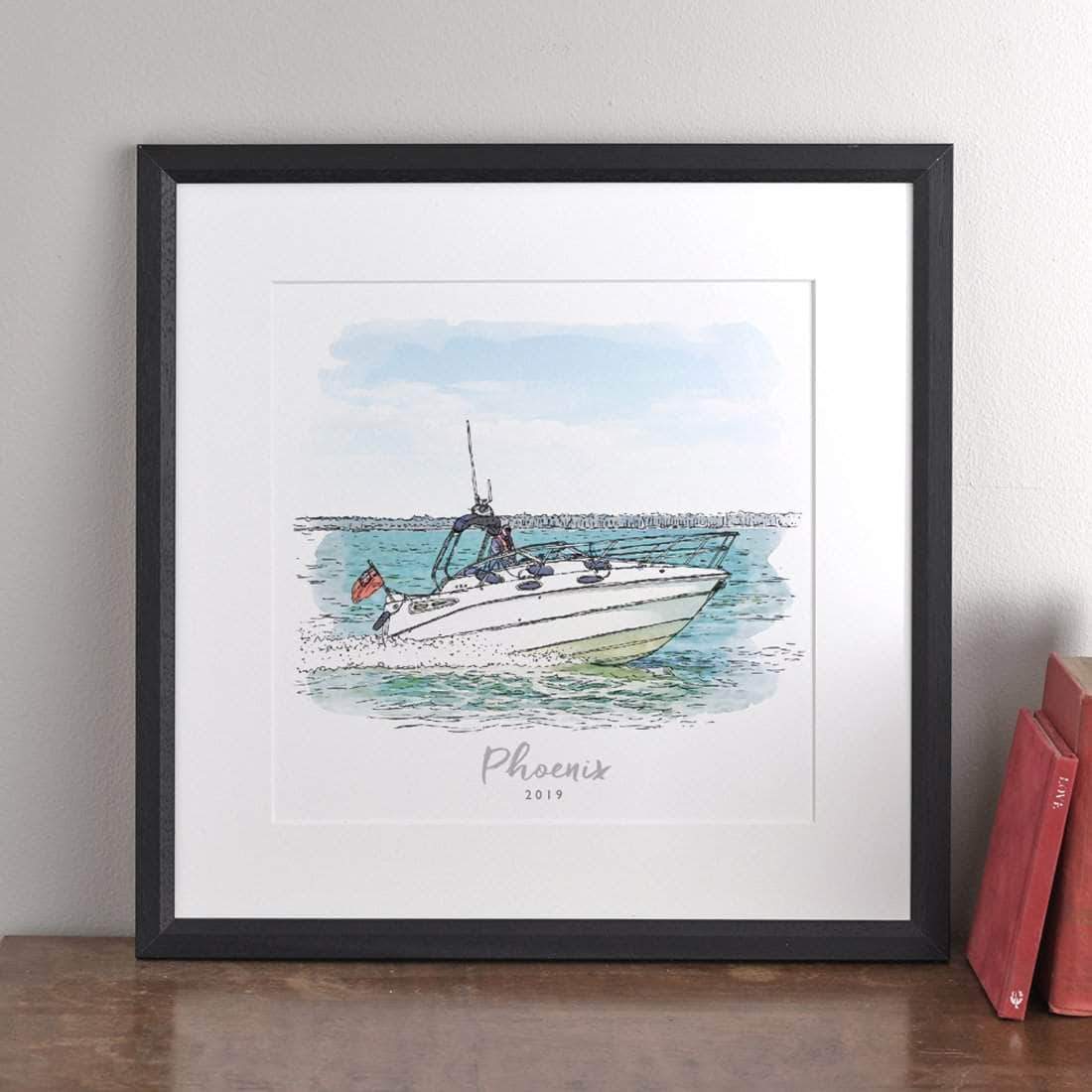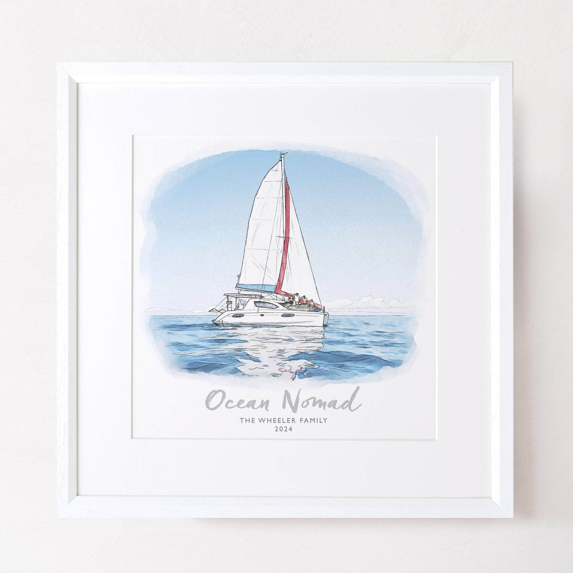 We can illustrate a variety of boats, from yachts and sailing boats to speedboats, catamarans, and canal boats! Simply provide a photo or weblink, and we'll draw your boat in situ, including any visible dock, surrounding boats, or background elements.