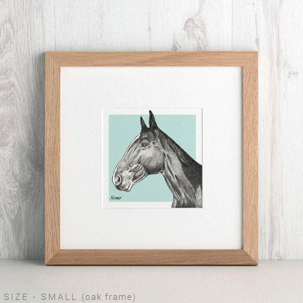 The horse is hand-drawn in a black and white outline and printed on a choice of six background colours (the pet's body is left white). This is a simplified sketch, not a detailed drawing, but we will try to capture the true character of your horse.