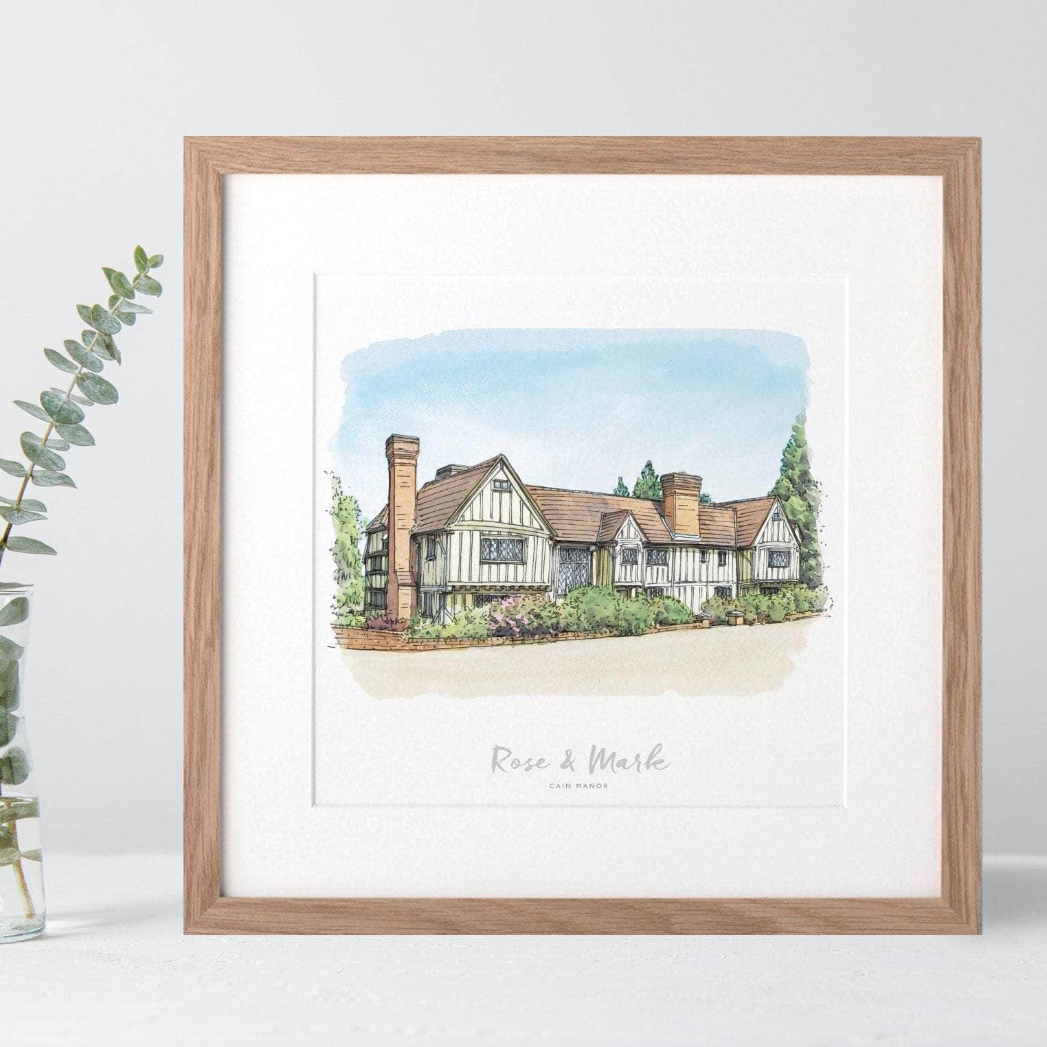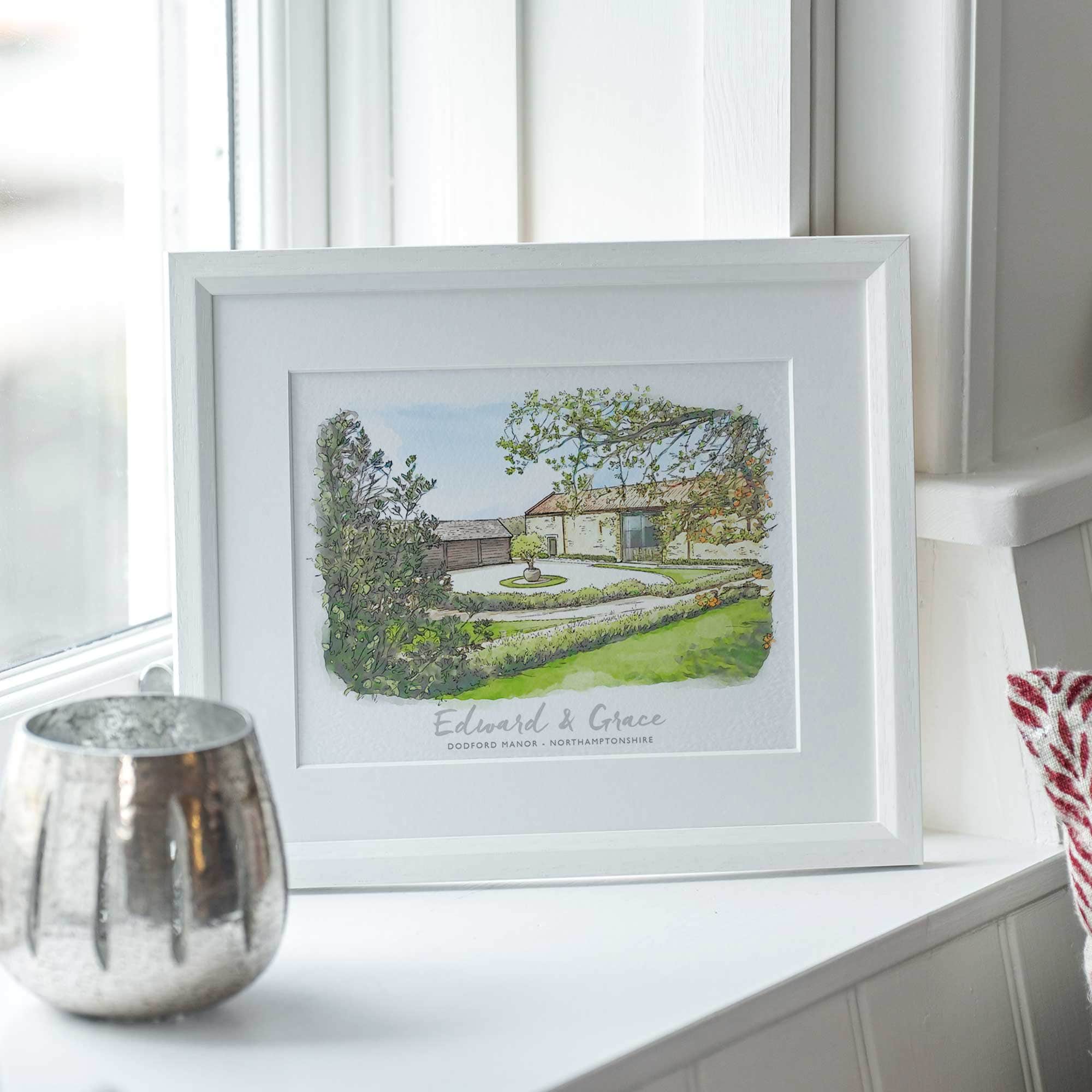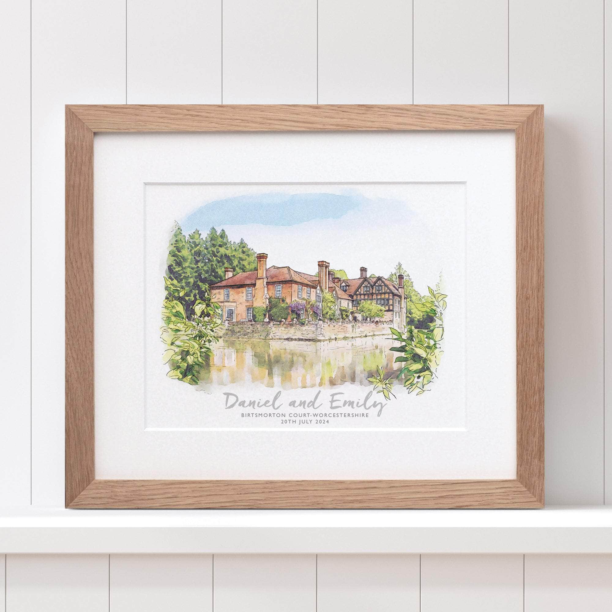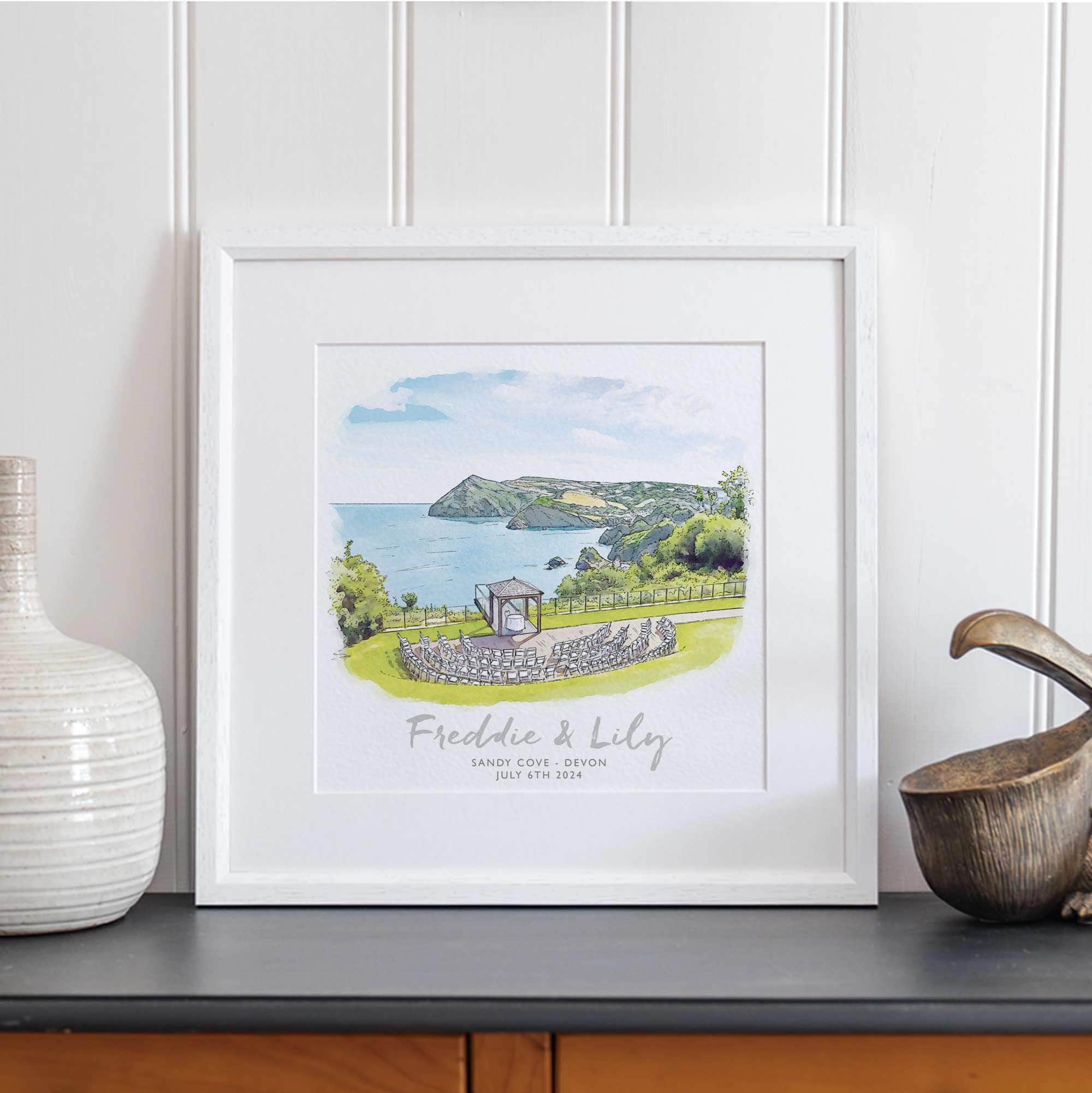 A personalised watercolour sketch of your wedding venue, hand-drawn by artists working in Devon and printed with your choice of text.