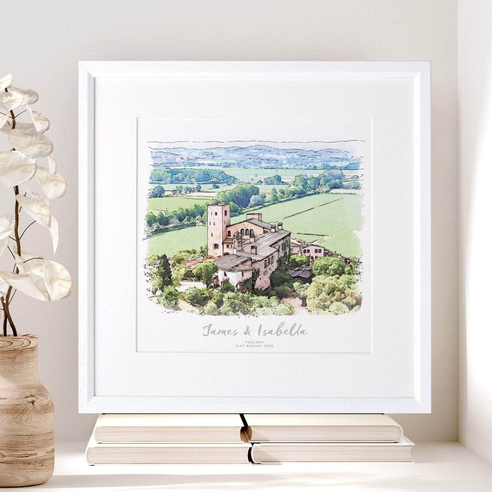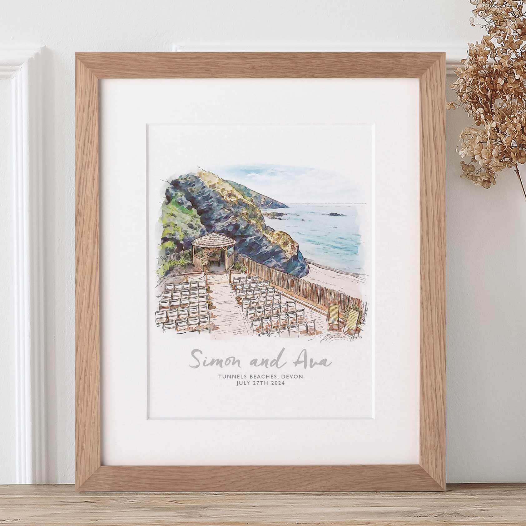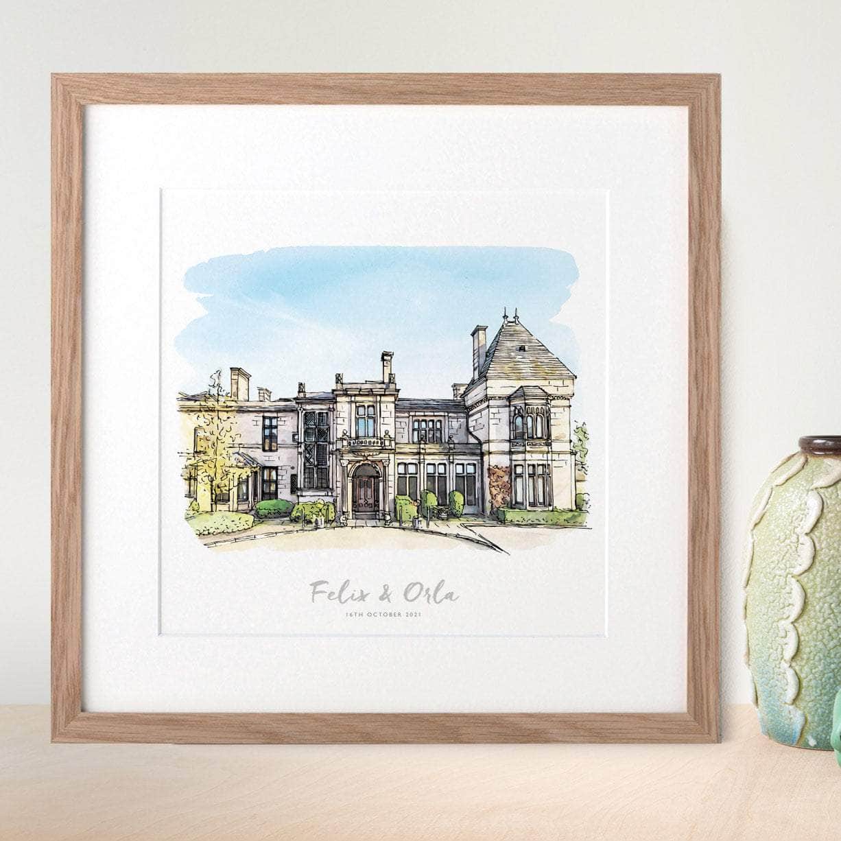A personalised watercolour sketch of your wedding venue, hand-drawn by artists working in Devon and printed with your choice of text.