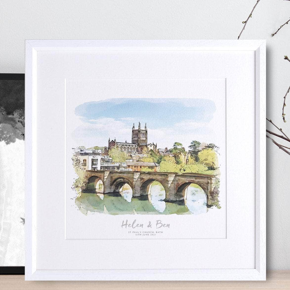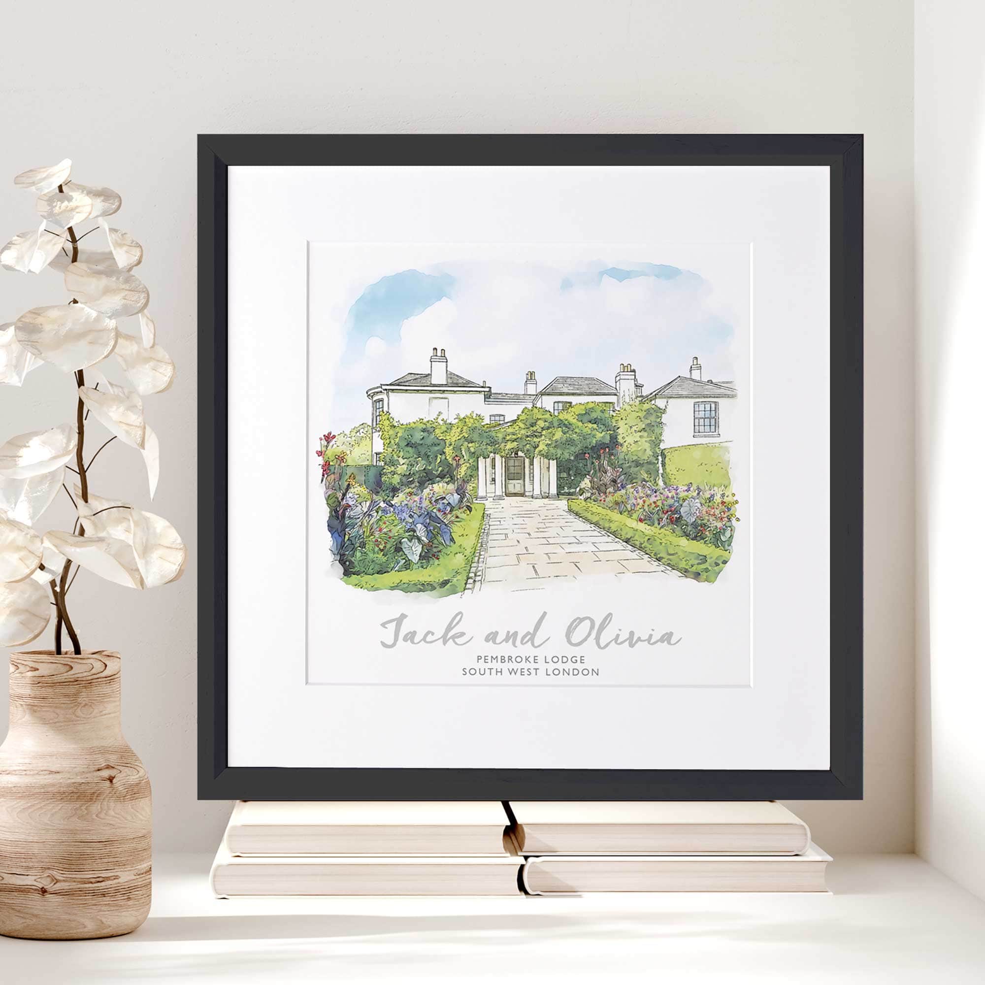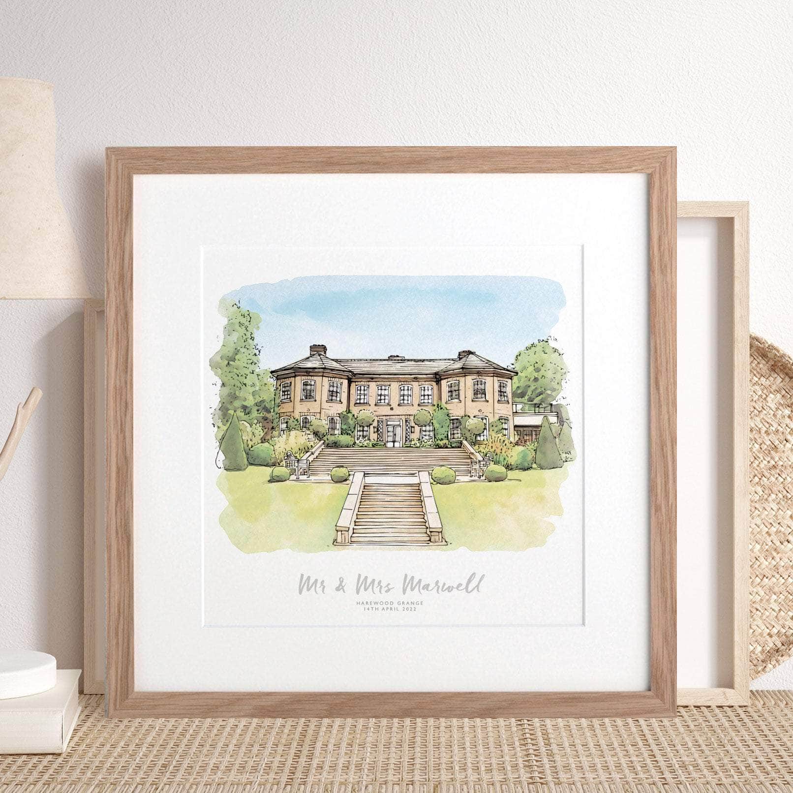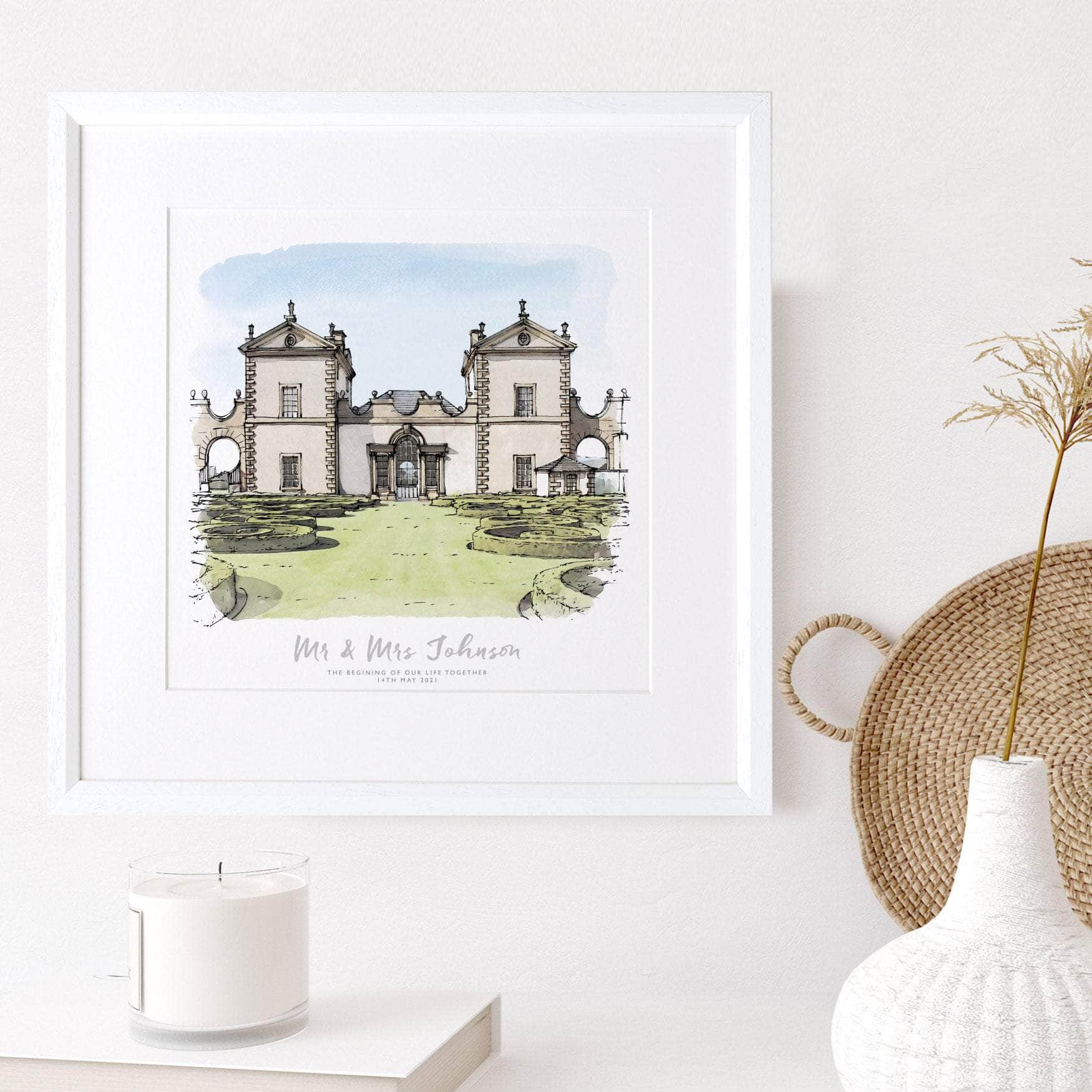 A personalised watercolour sketch of your wedding venue, hand-drawn by artists working in Devon and printed with your choice of text.
