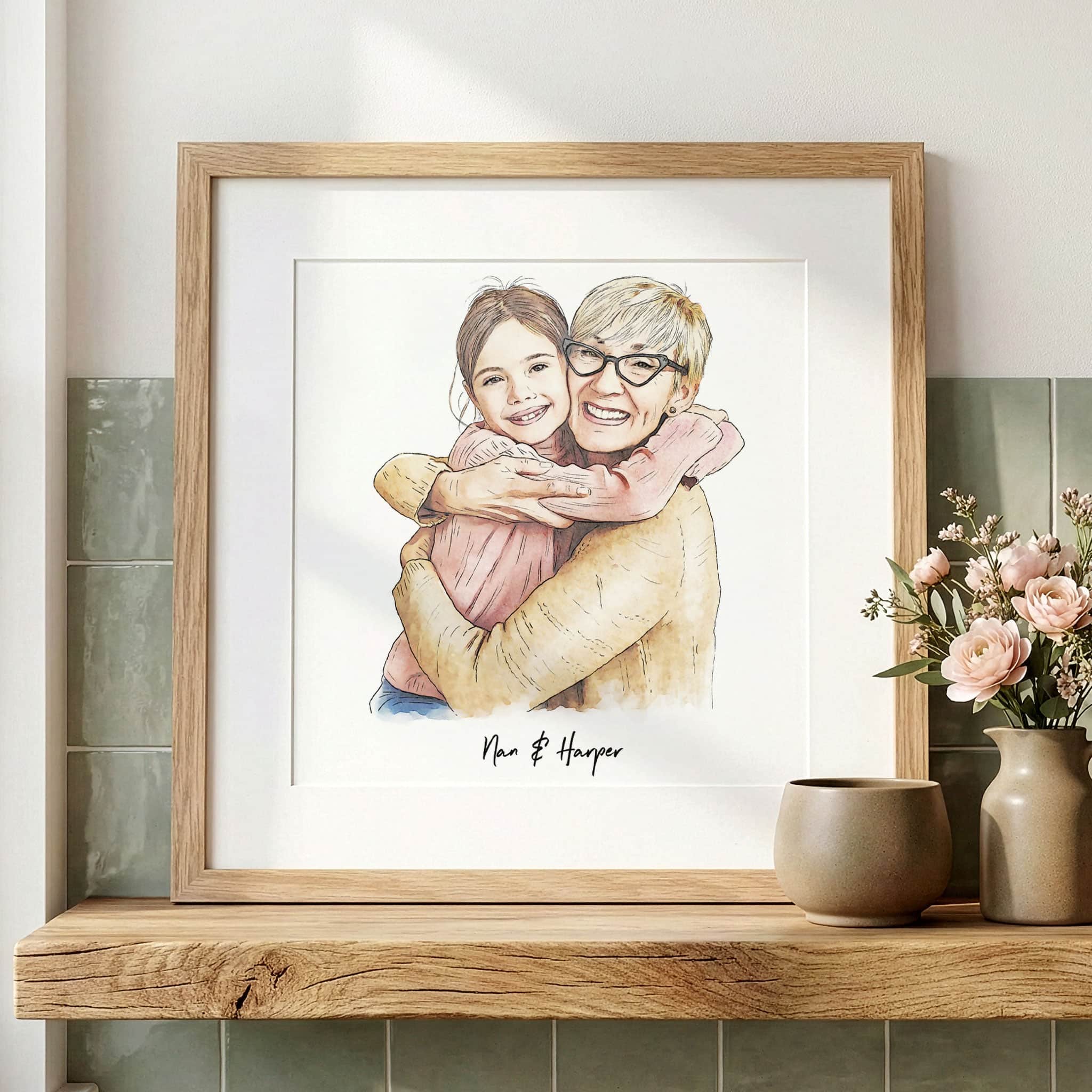Hand-drawn, black and white line drawing, digitally printed with full colour watercolour where we colour hair, skin, clothes etc. Your choice of text (eg a name) is printed with a message and date below in contemporary type (enter NA if not needed).
