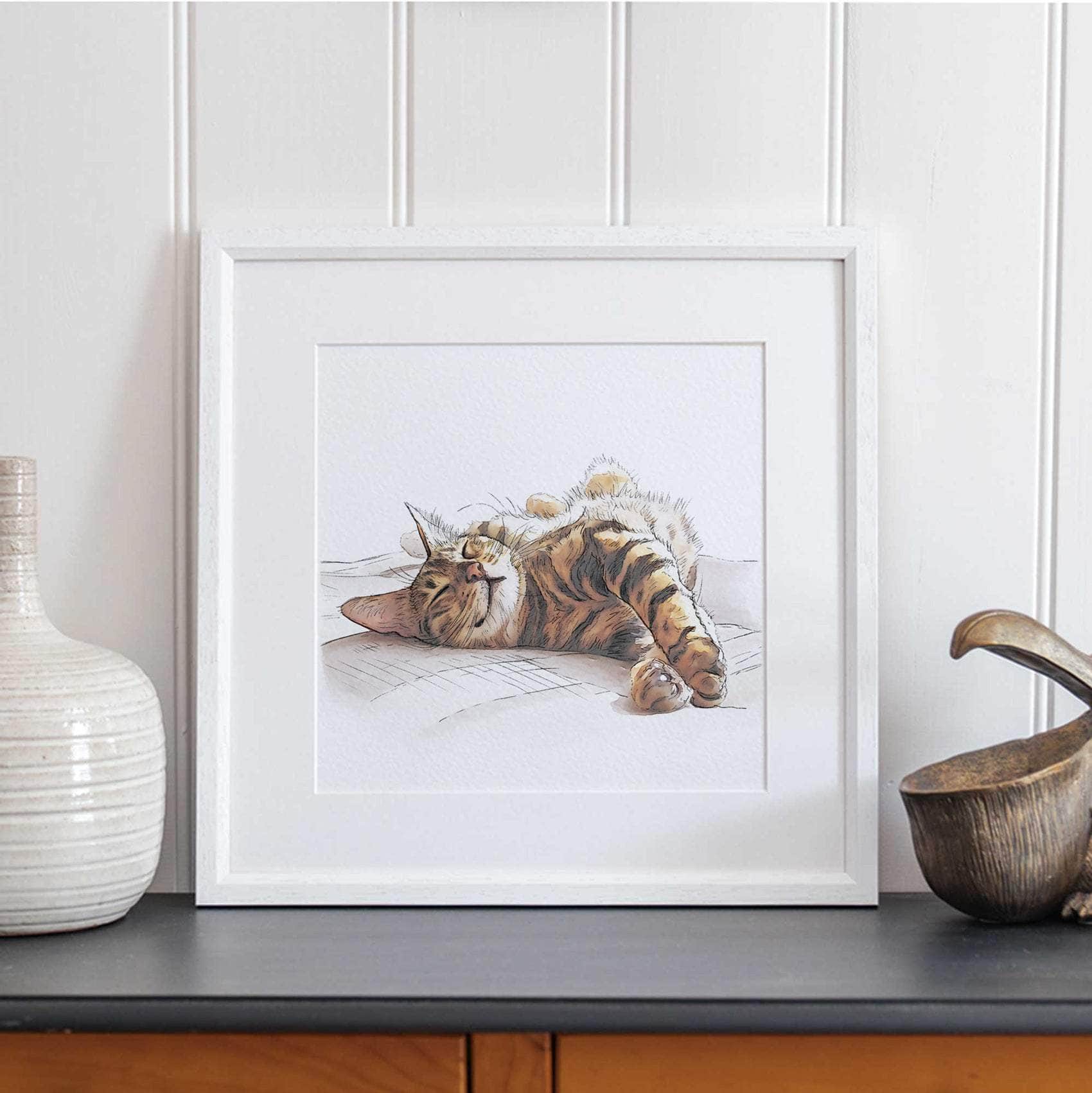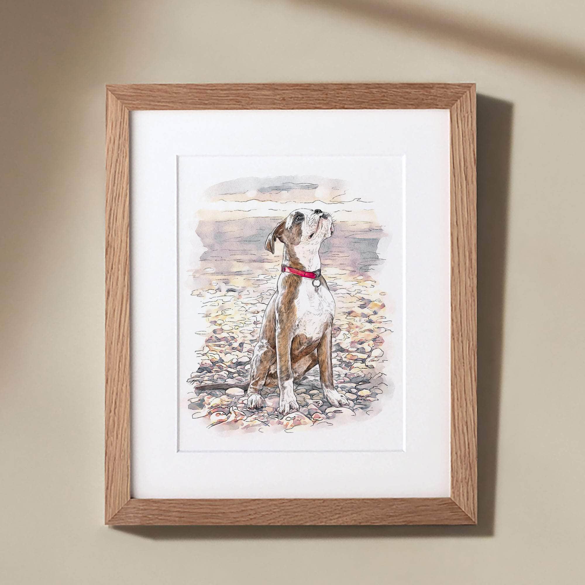 We sketch from a photograph provided by you, aiming to capture your pet as closely as possible. The portrait is hand-drawn and digitally coloured in a watercolour style. We work from the perspective in the photograph and exclude any background details, focusing solely on your pet. The final illustration is digitally printed.