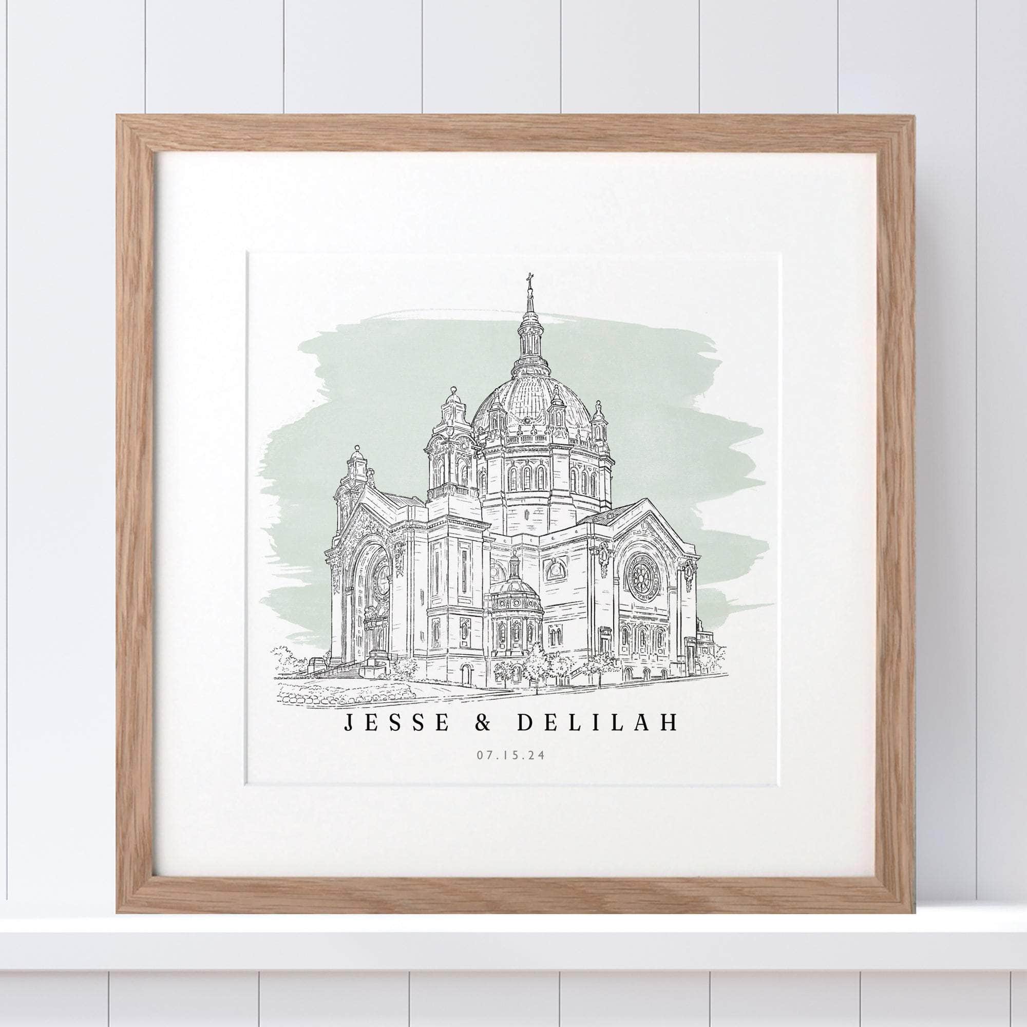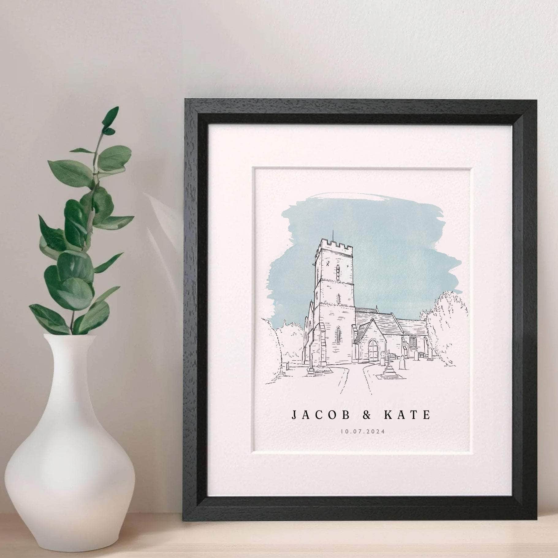 We can draw a variety of buildings, from churches and cathedrals, to stately homes, barns and castles. The wedding venue portrait is personalised with your names and wedding details in a hand font below. This stylish illustration makes the perfect wedding gift.