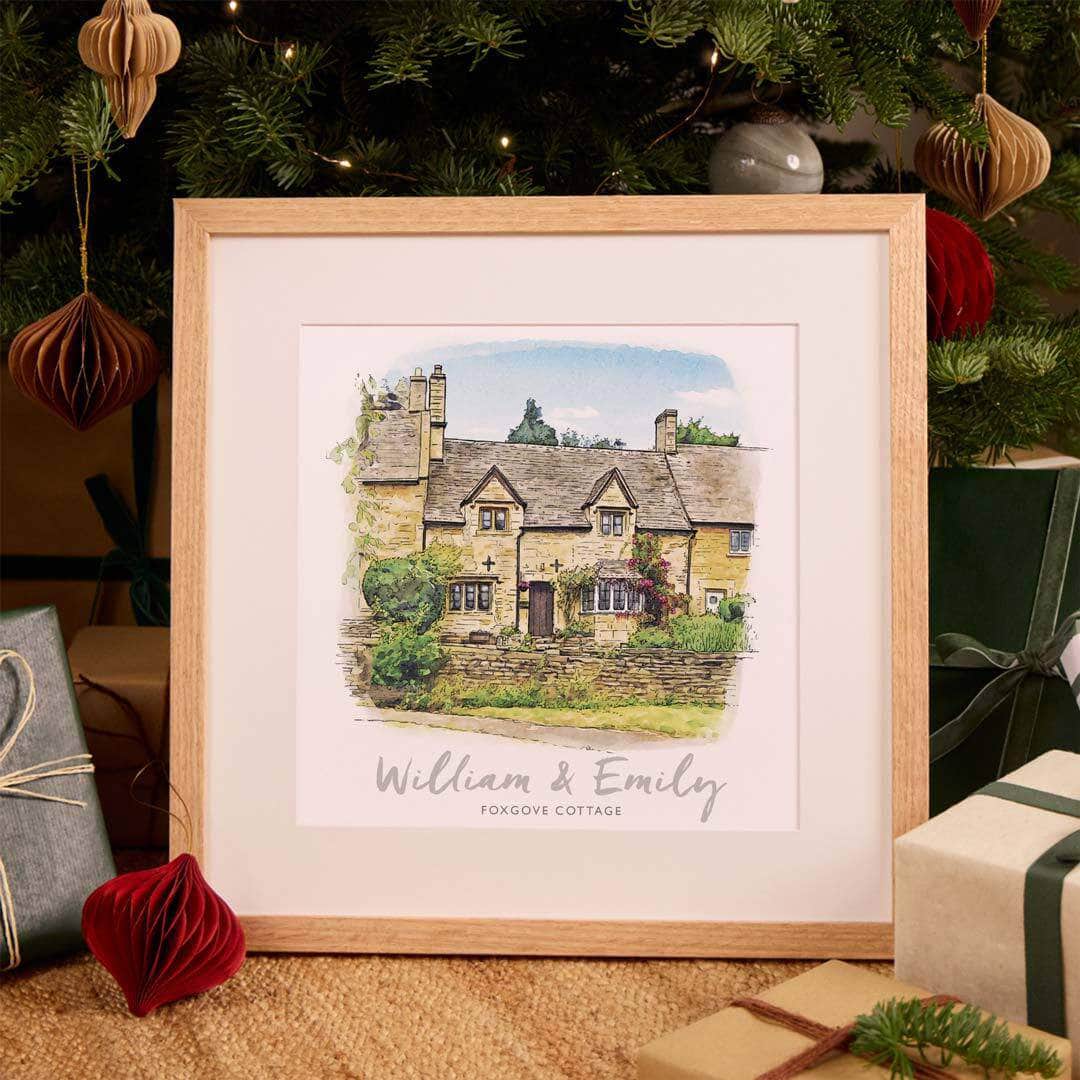 A personalised watercolour sketch of your house, hand-drawn by artists working in Devon and printed with your choice of text.