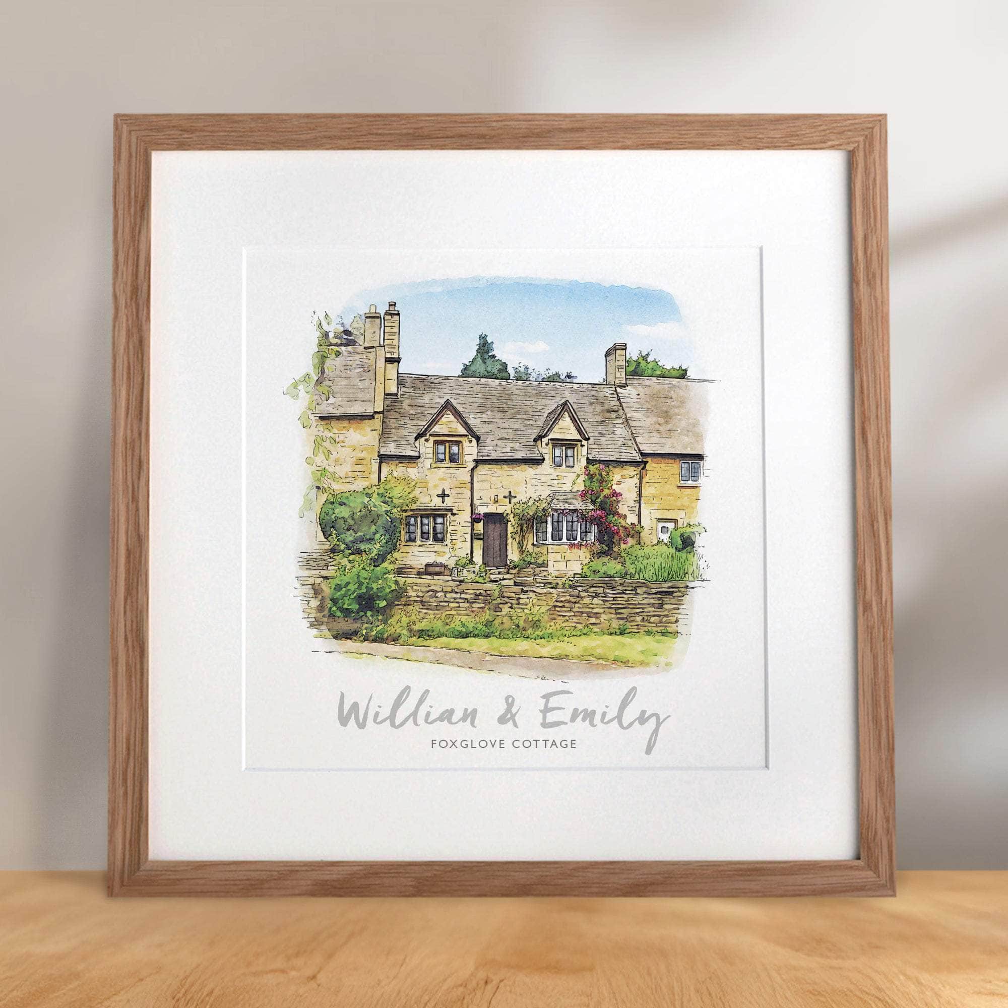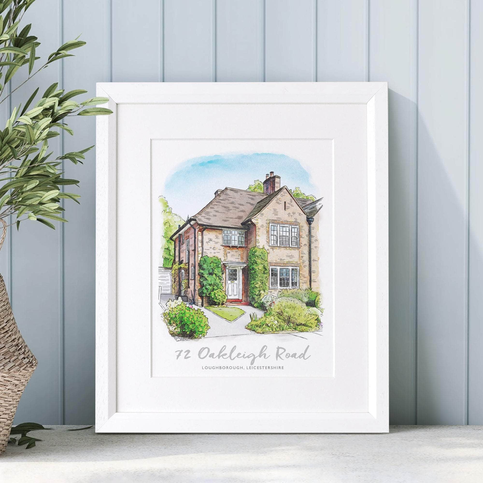 We can draw a variety of buildings or scenes - from flats, houses and bungalows, to farms, holiday homes and favourite views. We draw in a sketchy style to capture the home, and colour in our painterly watercolour style. The illustration is personalised with your chosen words and digitally printed.