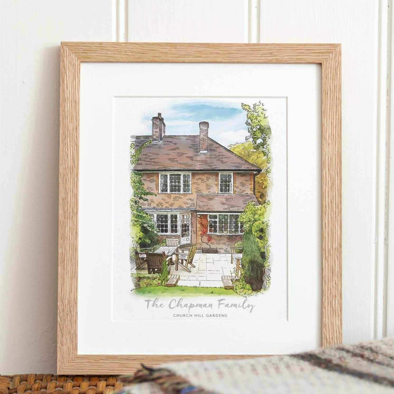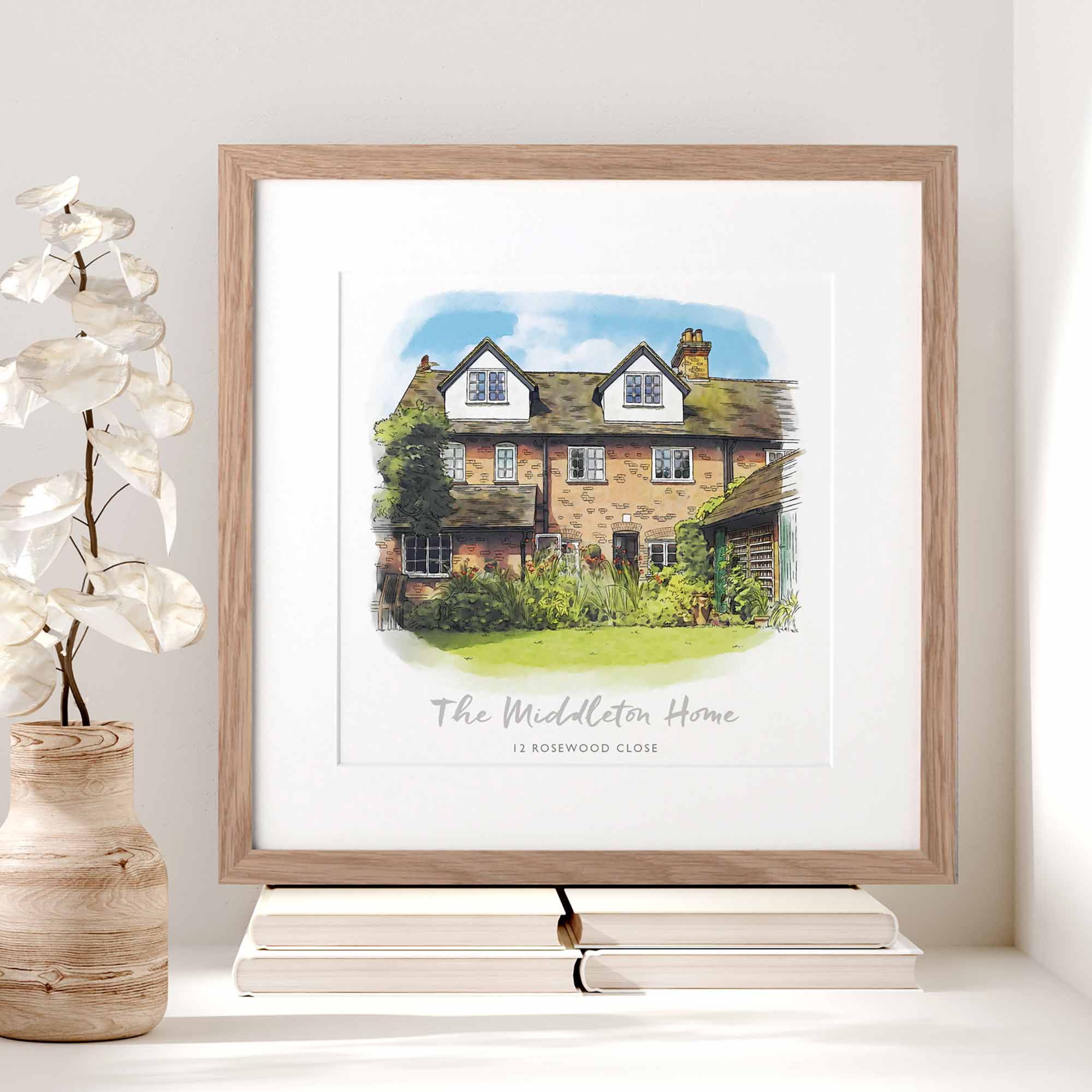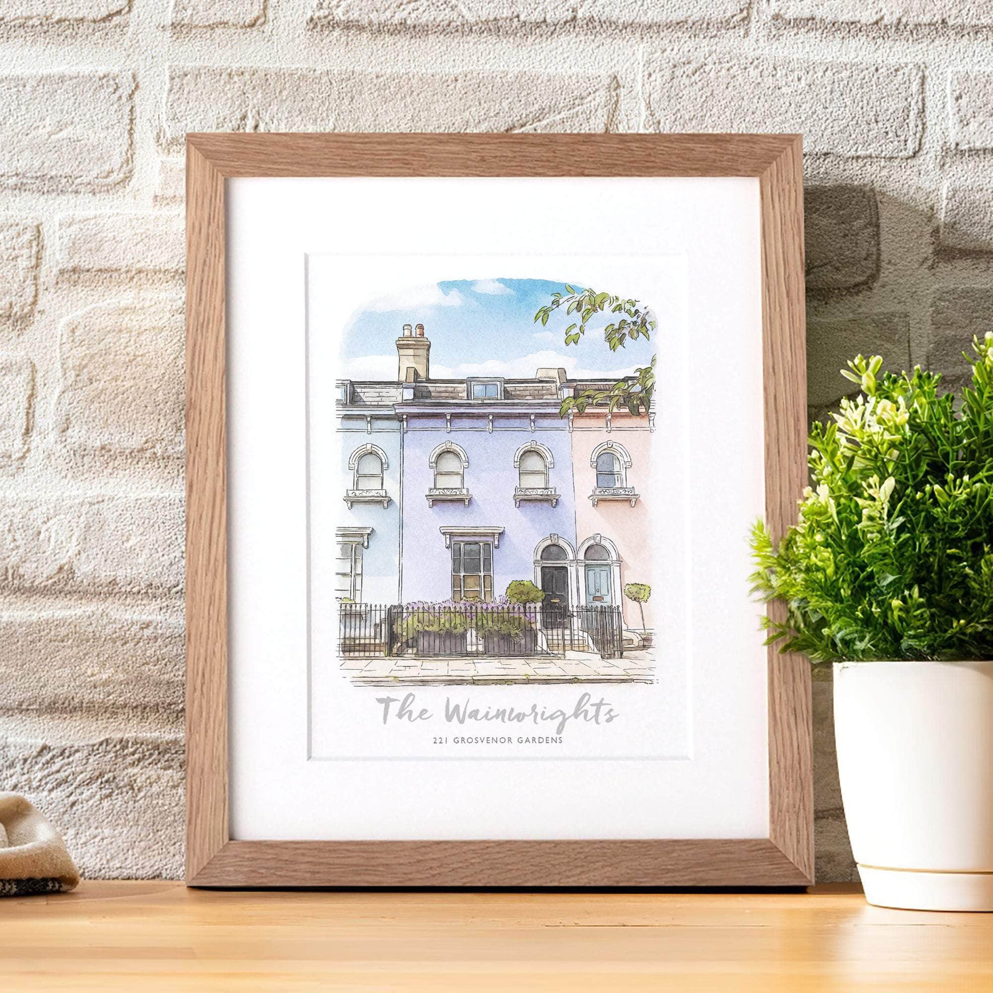 Hand-drawn, digitally coloured in watercolour style and printed to order on 200gsm acid free, fine grain artists paper. We won't include people, cars, dustbins, satellite dishes etc, but let us know in your notes if you want anything else removed or added.