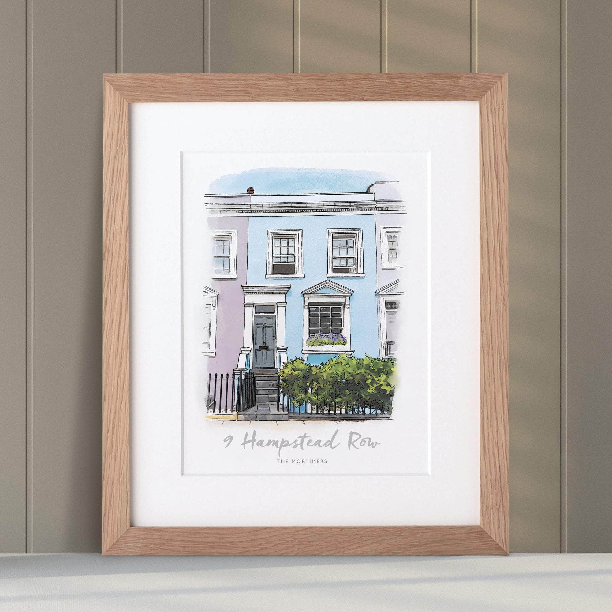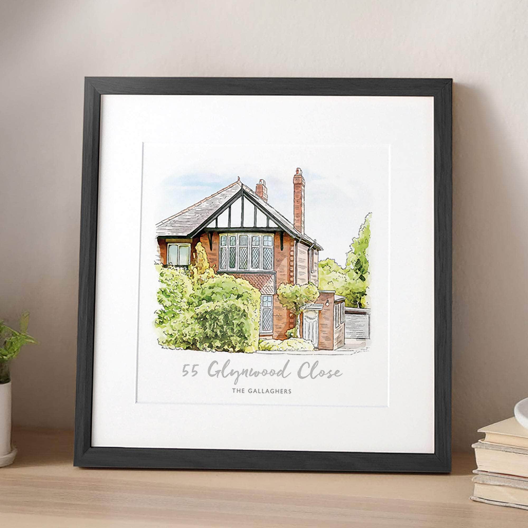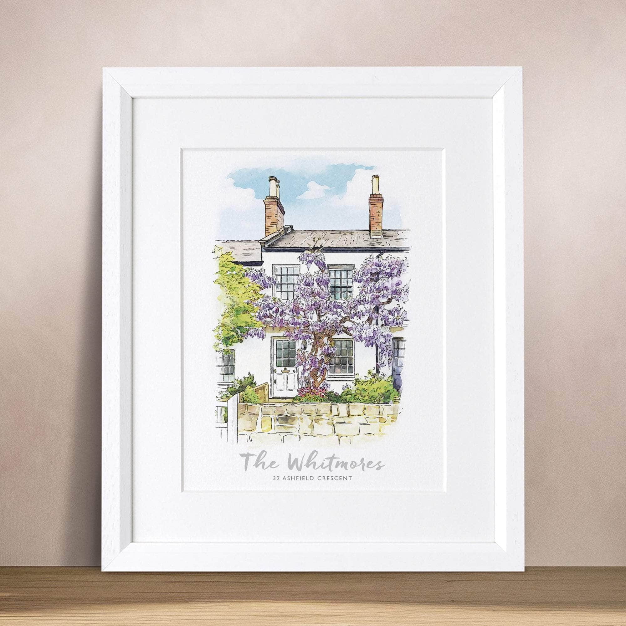 Hand-drawn, digitally coloured in watercolour style and printed to order on 200gsm acid free, fine grain artists paper. We won't include people, cars, dustbins, satellite dishes etc, but let us know in your notes if you want anything else removed or added.