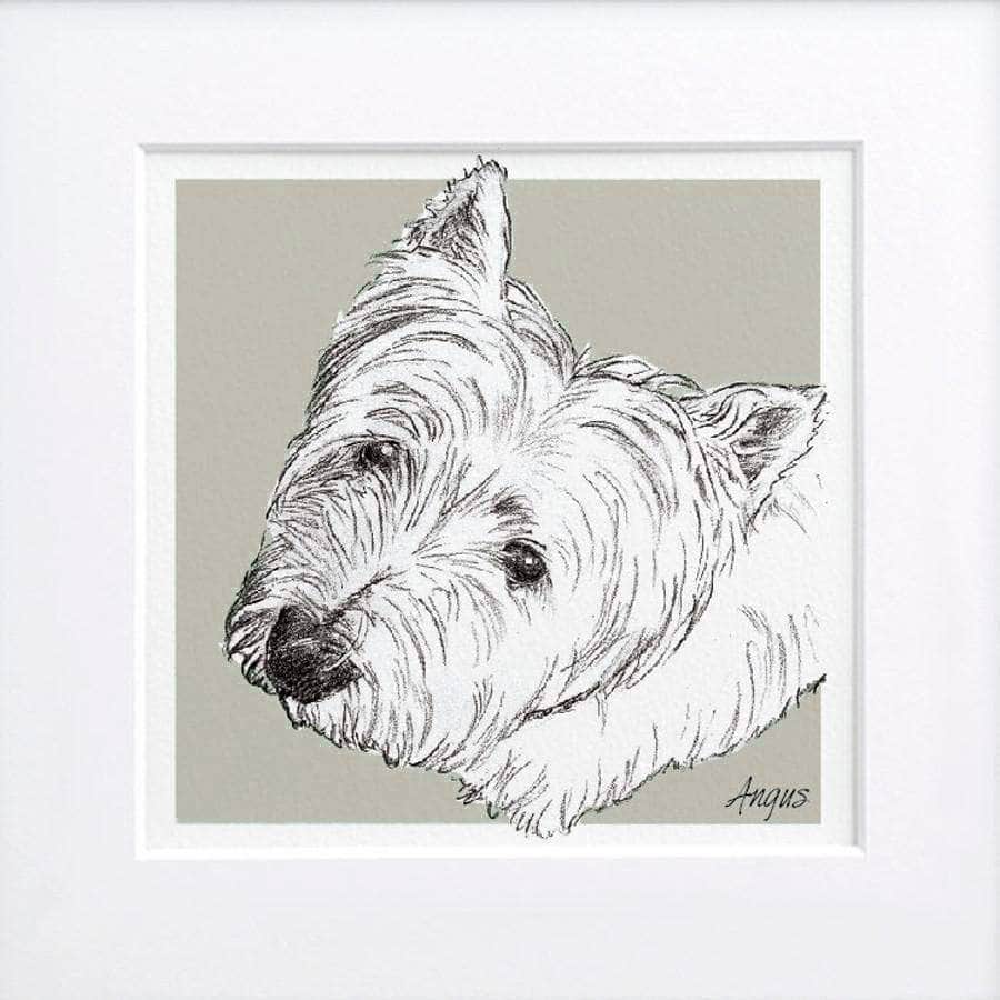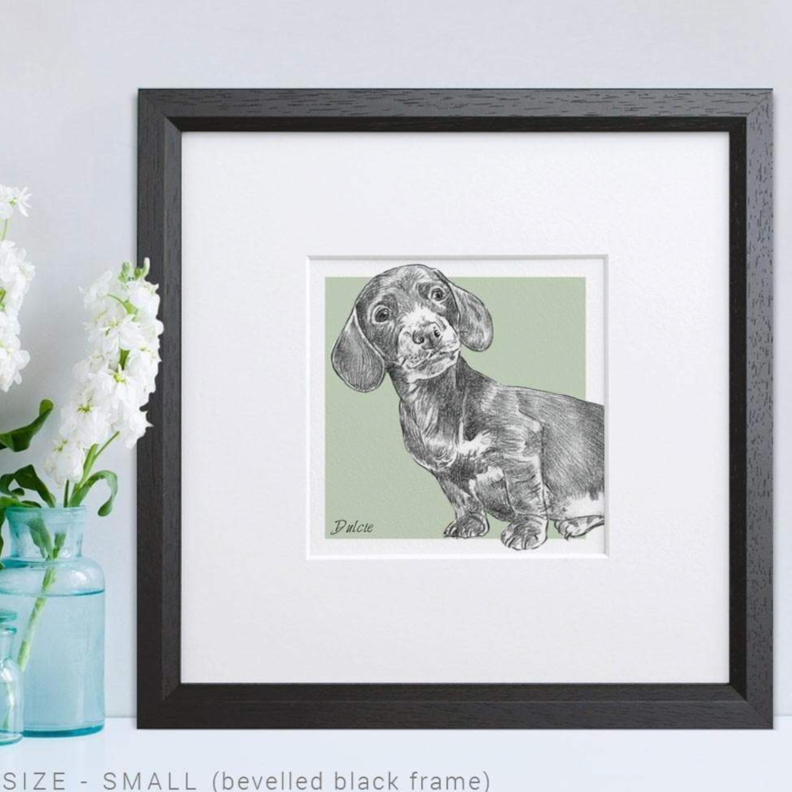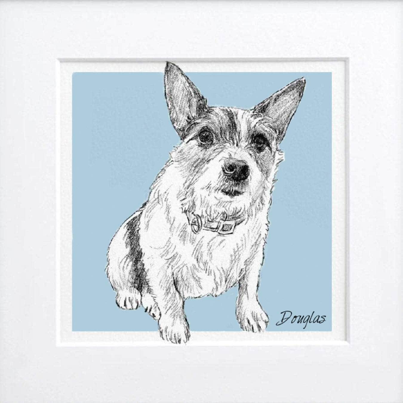 The pet is hand-drawn in a black and white outline and printed on a choice of six background colours (the pet's body is left white). This is a simplified sketch, not a detailed drawing, but we will try to capture the true character of your pet.