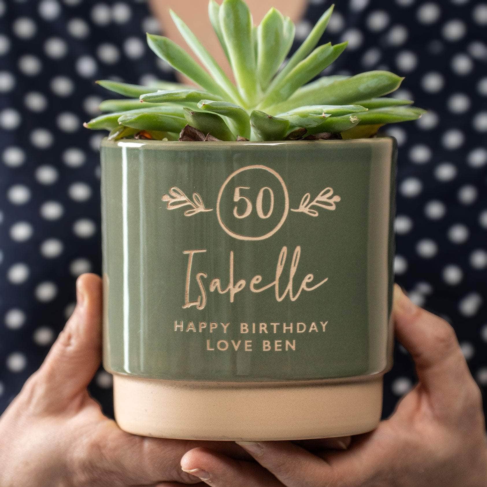 Celebrate a special birthday with our engraved indoor plant pot - personalised with the age above the name and a personal message. For a special 50th or any birthday age!
