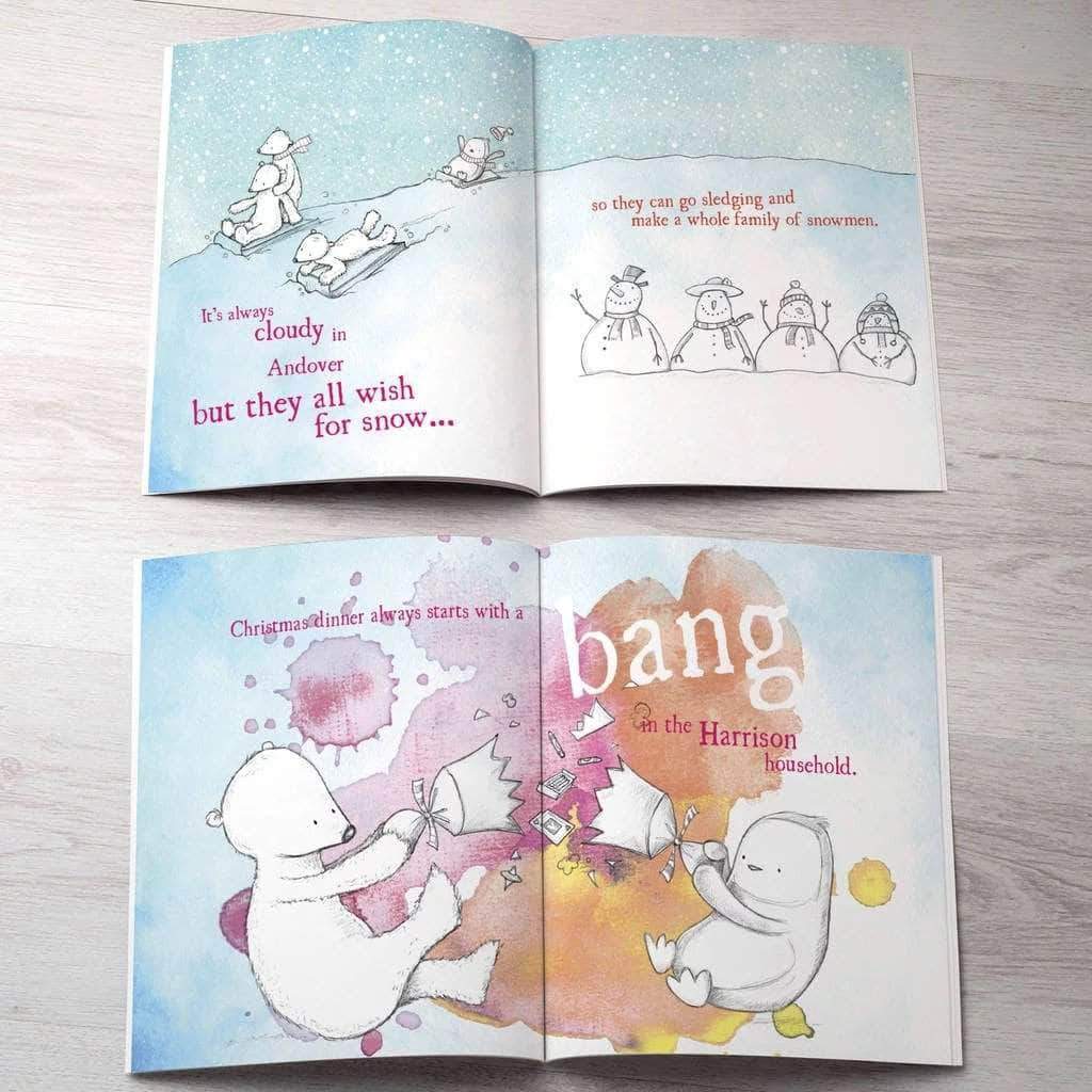 The humorous line drawings of a polar bear family celebrating Christmas are printed over vibrant watercolour backgrounds, with each page having a different theme: from decorating the tree, putting up stockings, waiting for Santa, to playing in the snow and Christmas dinner.