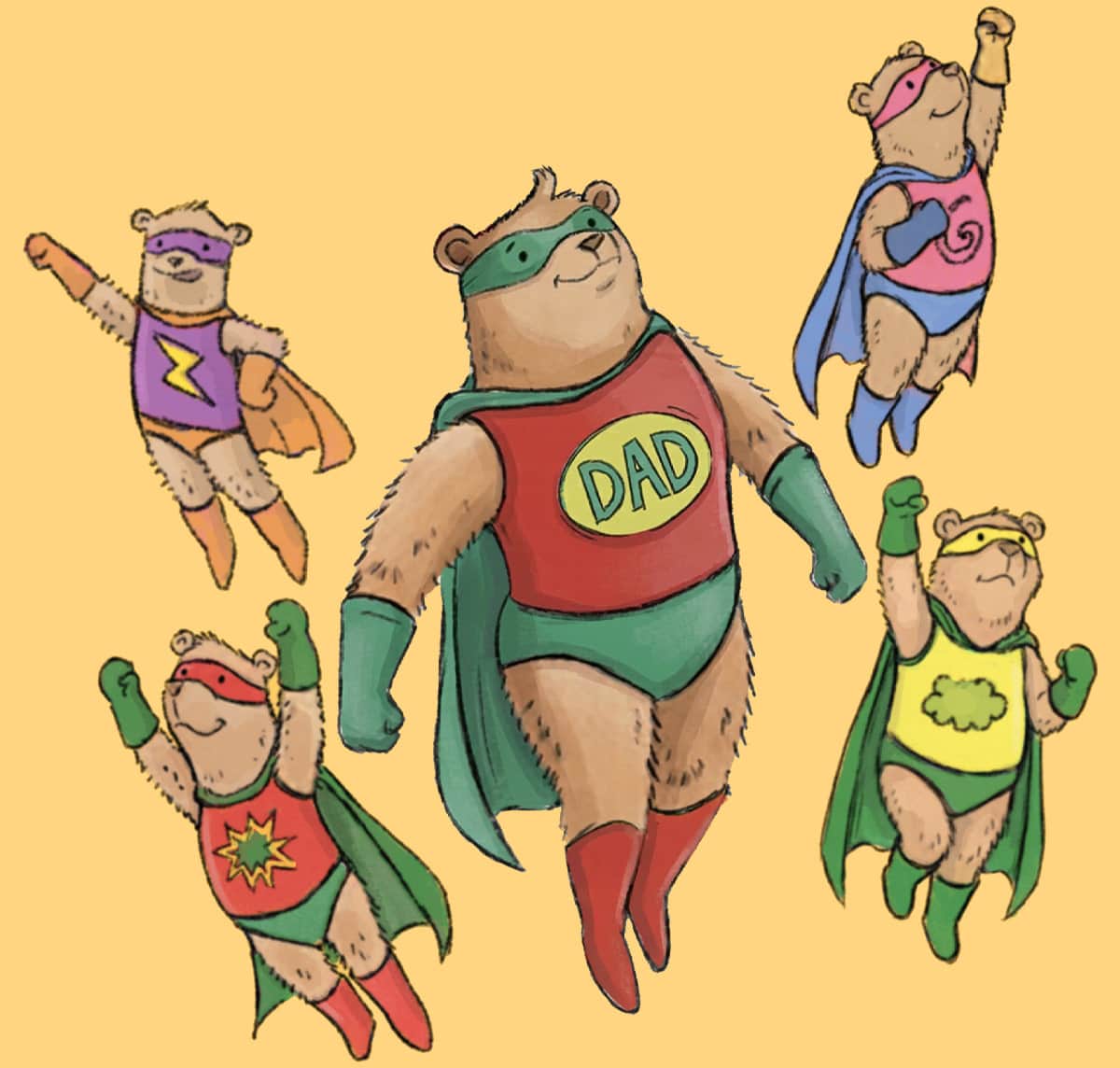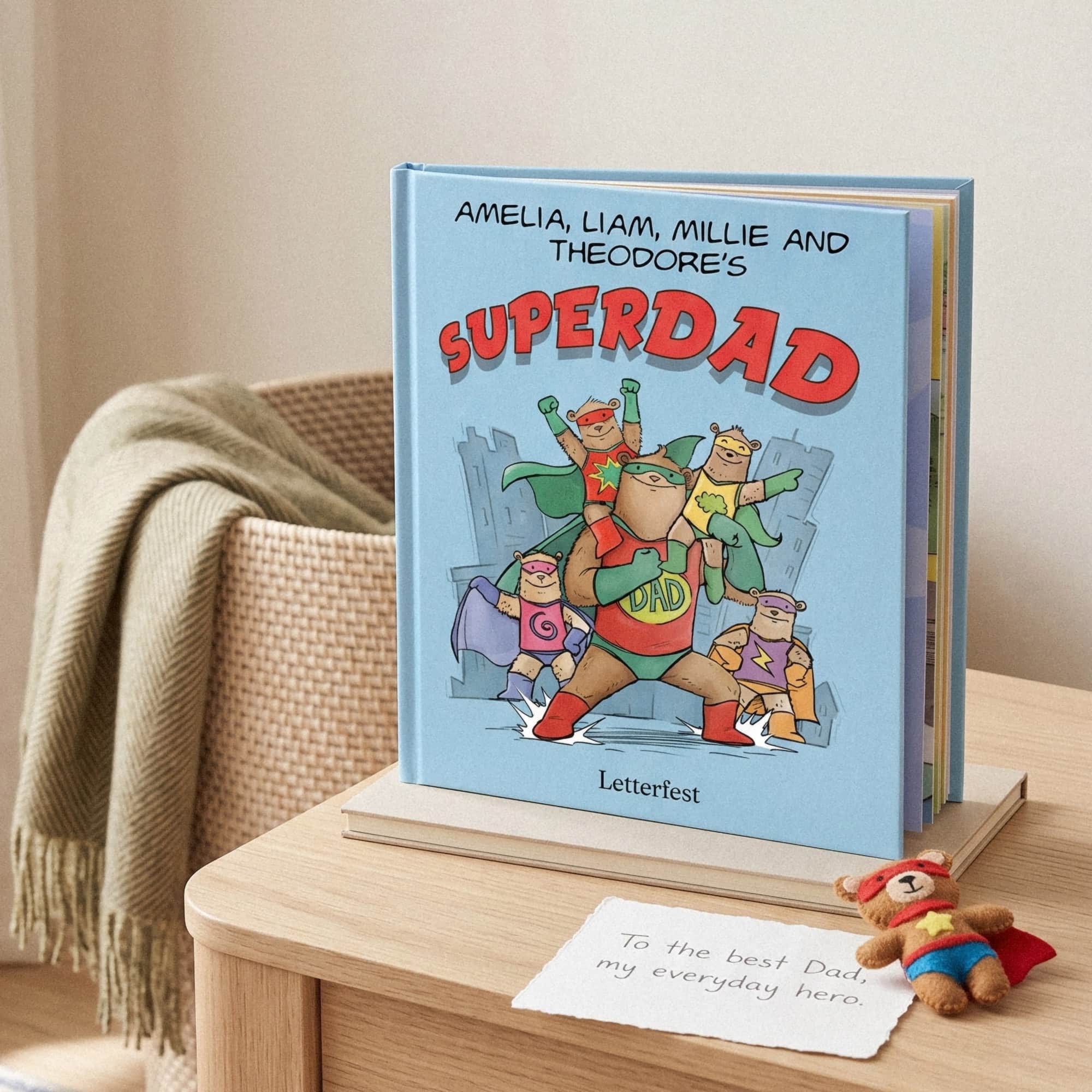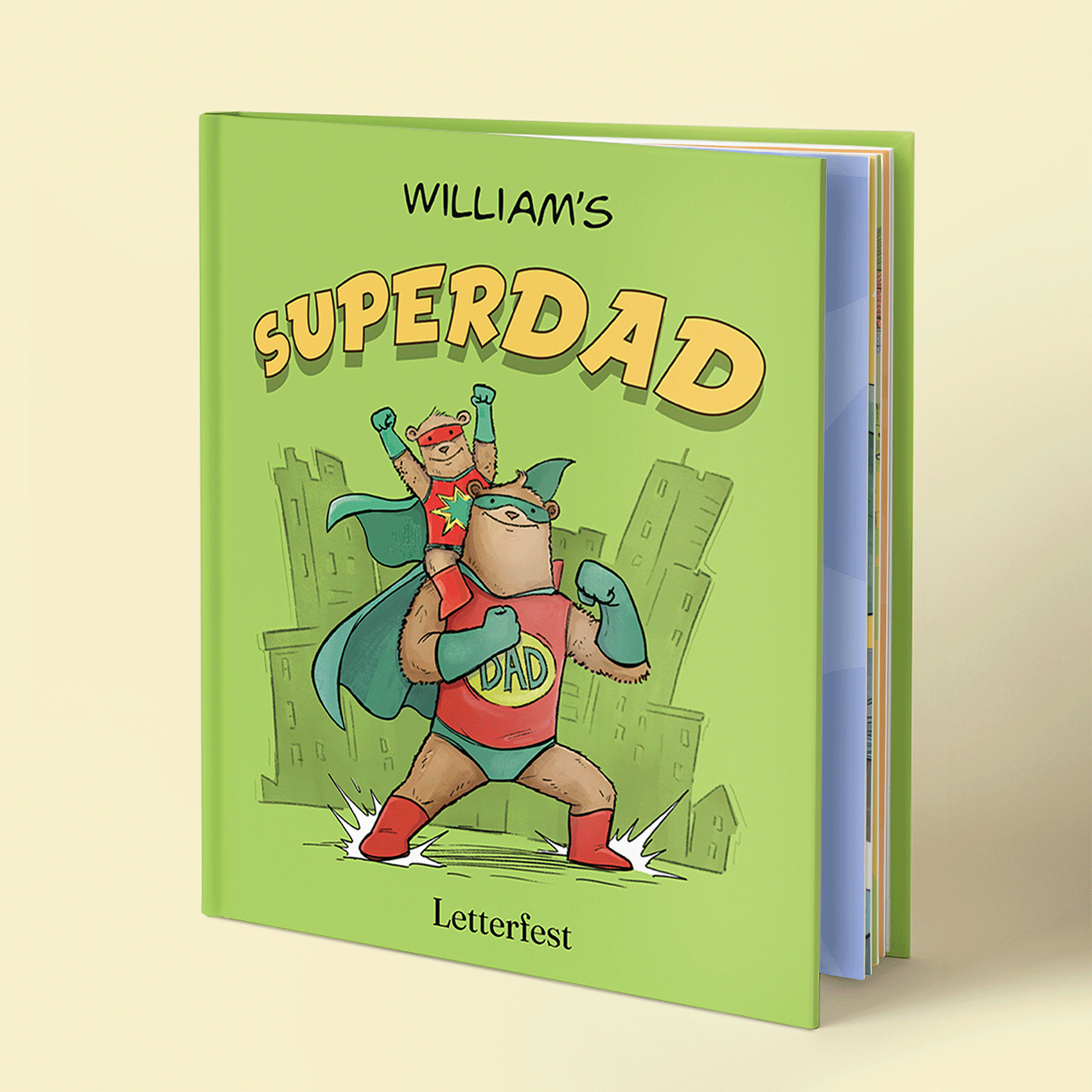 Illustrated with humorous drawings over vibrant comic inspired backgrounds. Each page has a different theme - from his secret headquarters to his super-powers and his costume. Select up to 4 children (baby bears!) to be included in the illustration as Superdad's amazing sidekicks!