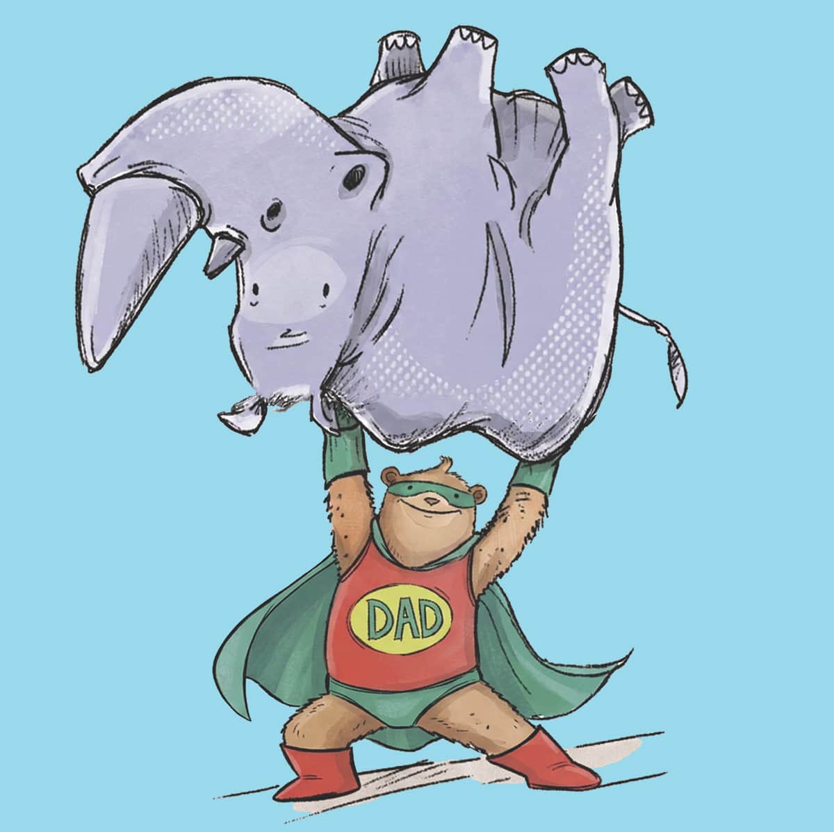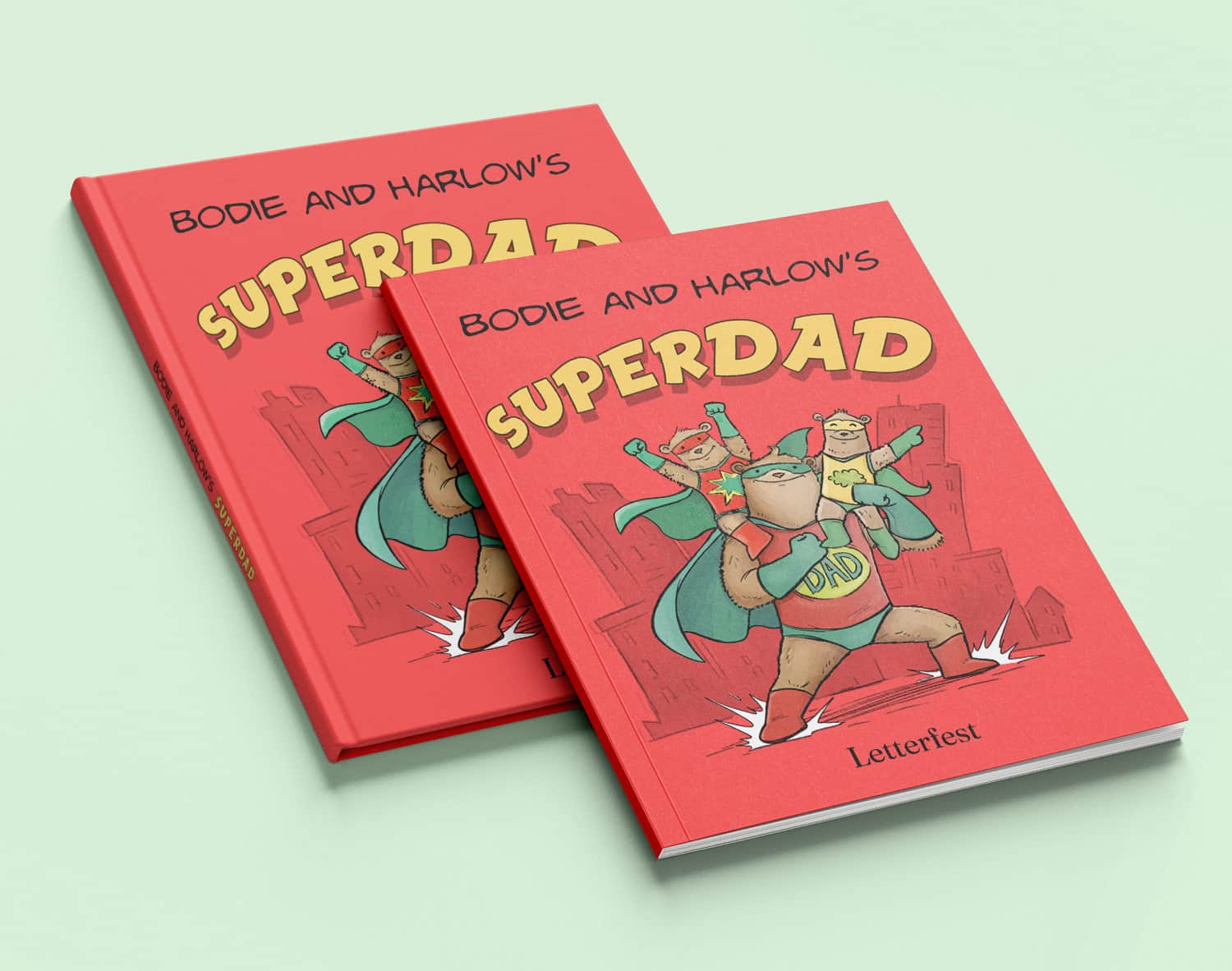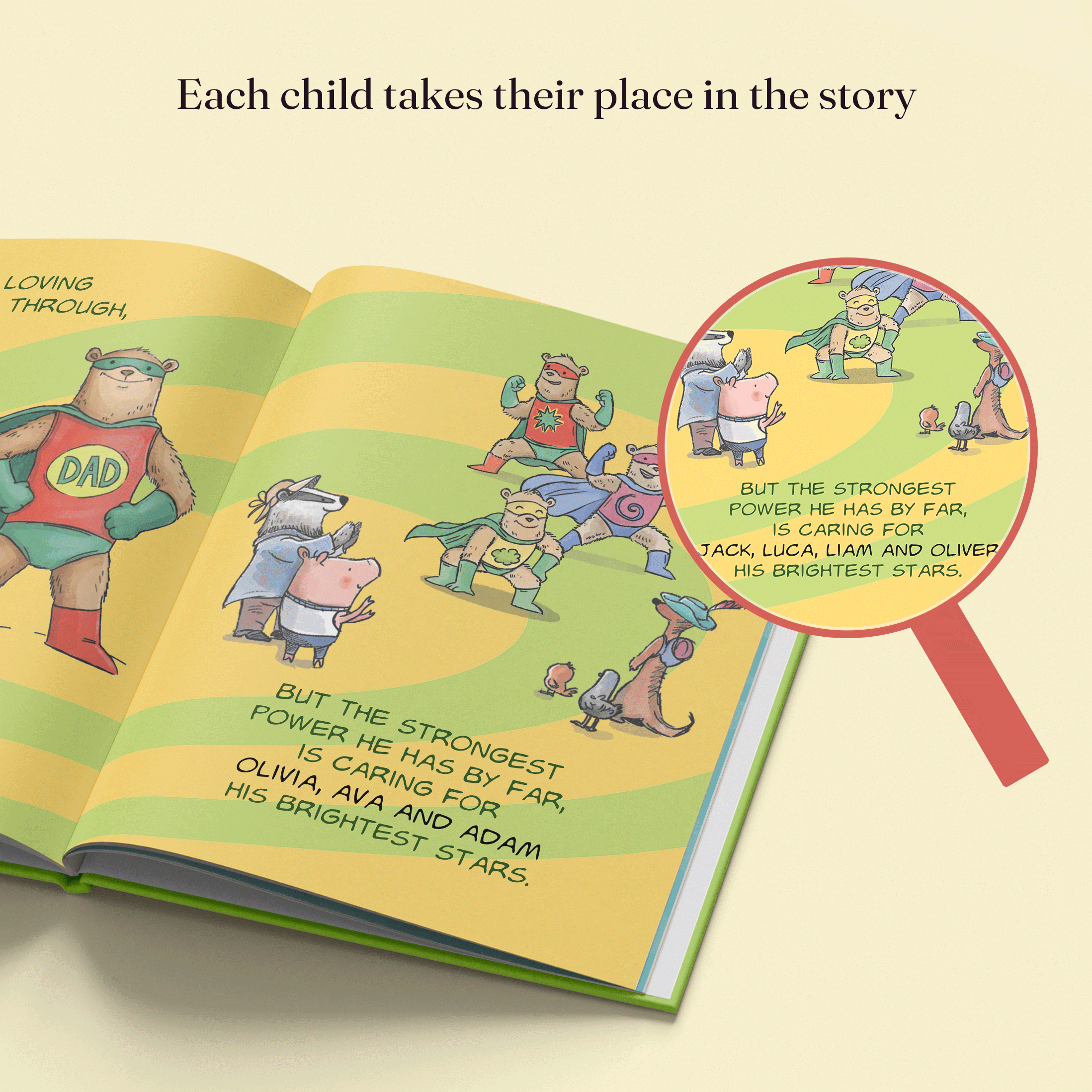 Illustrated with humorous drawings over vibrant comic inspired backgrounds. Each page has a different theme - from his secret headquarters to his super-powers and his costume. Select up to 4 children (baby bears!) to be included in the illustration as Superdad's amazing sidekicks!