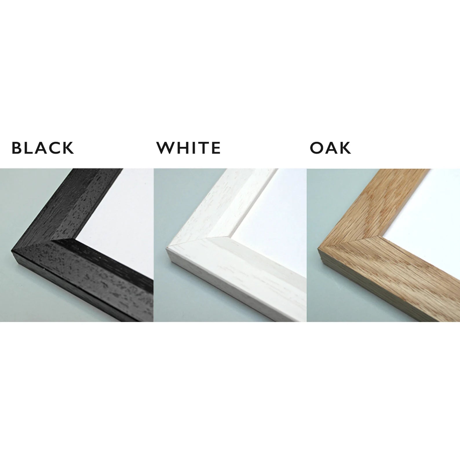 Wooden frames are also available, all handmade in the UK from solid wood in black, white or oak, and provided with integrated hanging hooks and Pilkington glass (extra large frames are glazed with high grade Quinn perspex for safe delivery.)