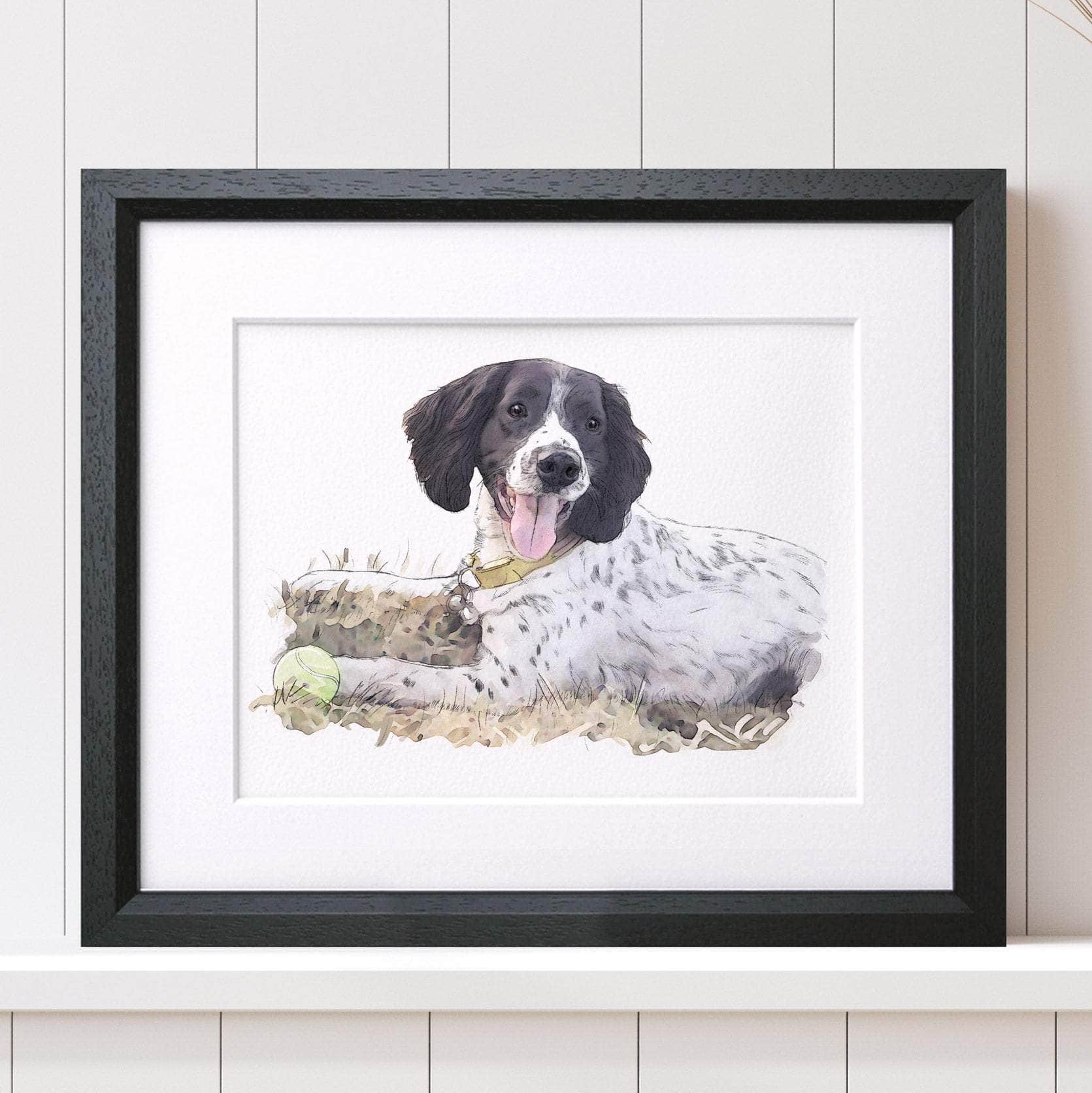 We sketch from a photograph provided by you, aiming to capture your pet as closely as possible. The portrait is hand-drawn and digitally coloured in a watercolour style. We work from the perspective in the photograph and exclude any background details, focusing solely on your pet. The final illustration is digitally printed.