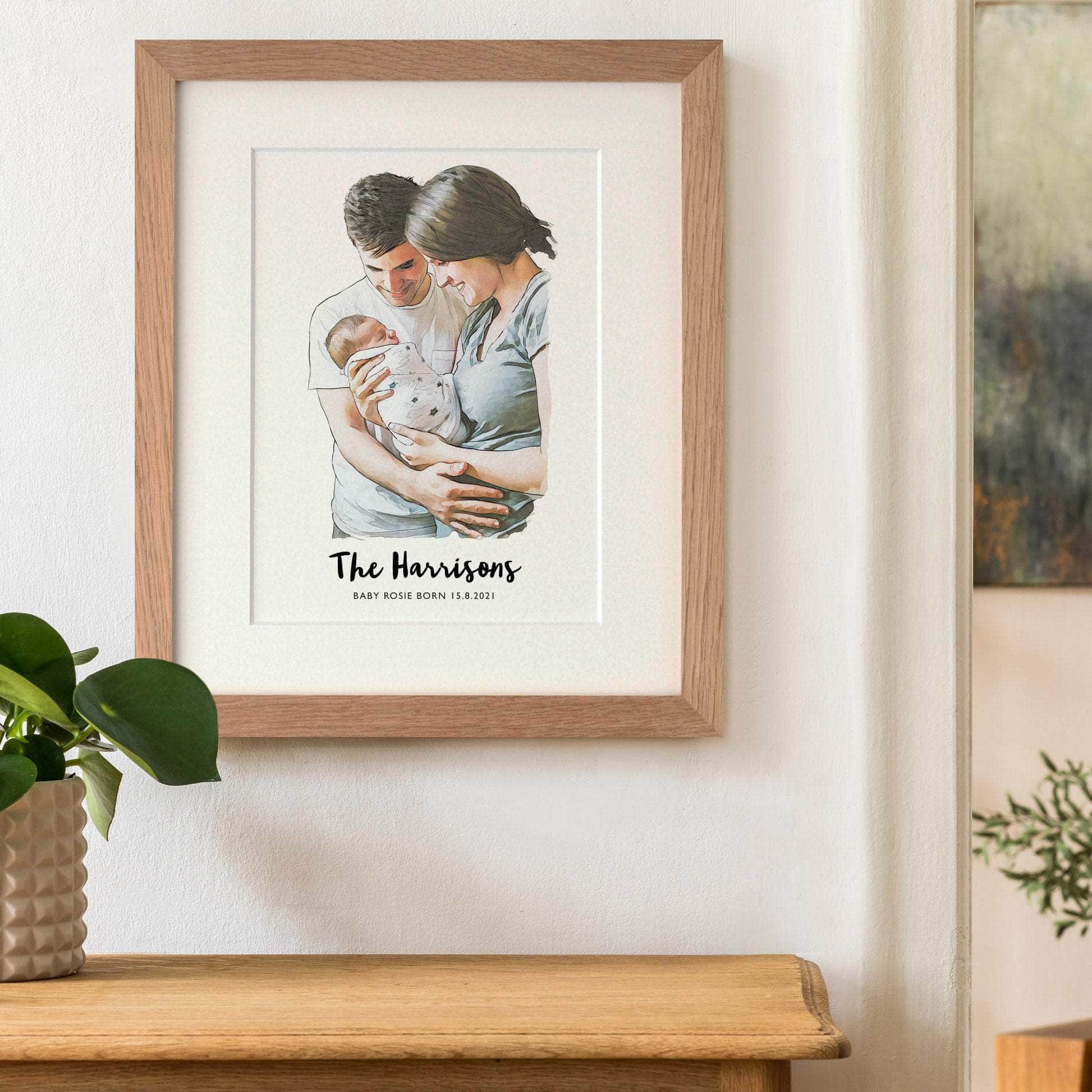 Hand-drawn, coloured and digitally printed with a full colour watercolour style where we colour hair, skin, clothes etc. Your choice of text (eg a name) is printed in hand drawn brush script with a message and date below in contemporary type (enter NA if not needed).