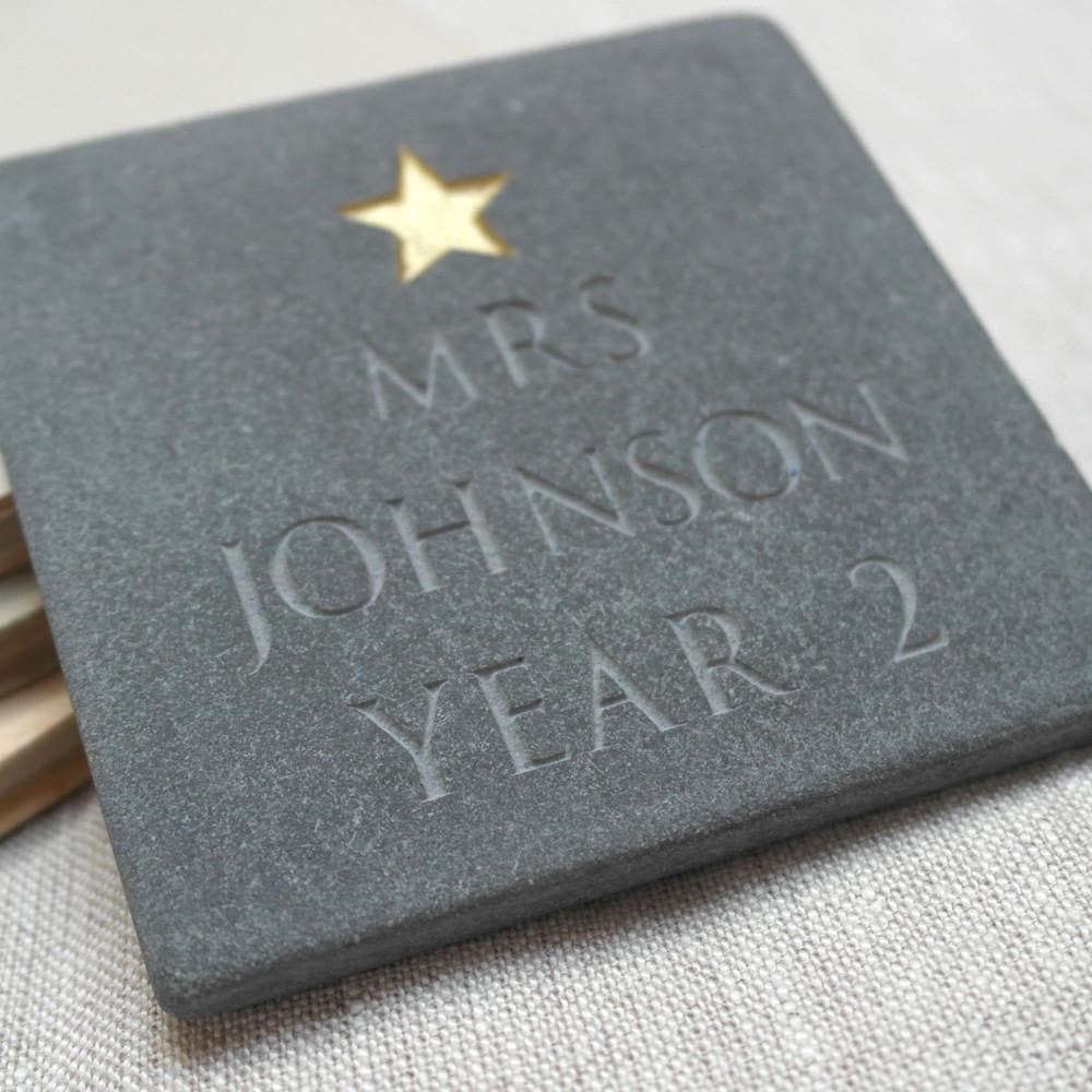 A slate stone tile engraved by hand to your requirements. We engrave a star in either natural stone, gold or silver then your choice of text over three lines - a name, their class or perhaps "Thankyou". Available in Grey Slate.