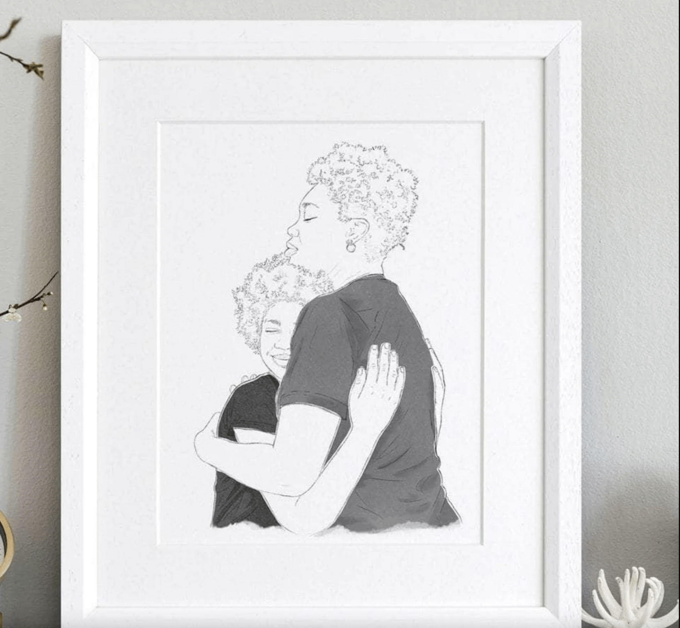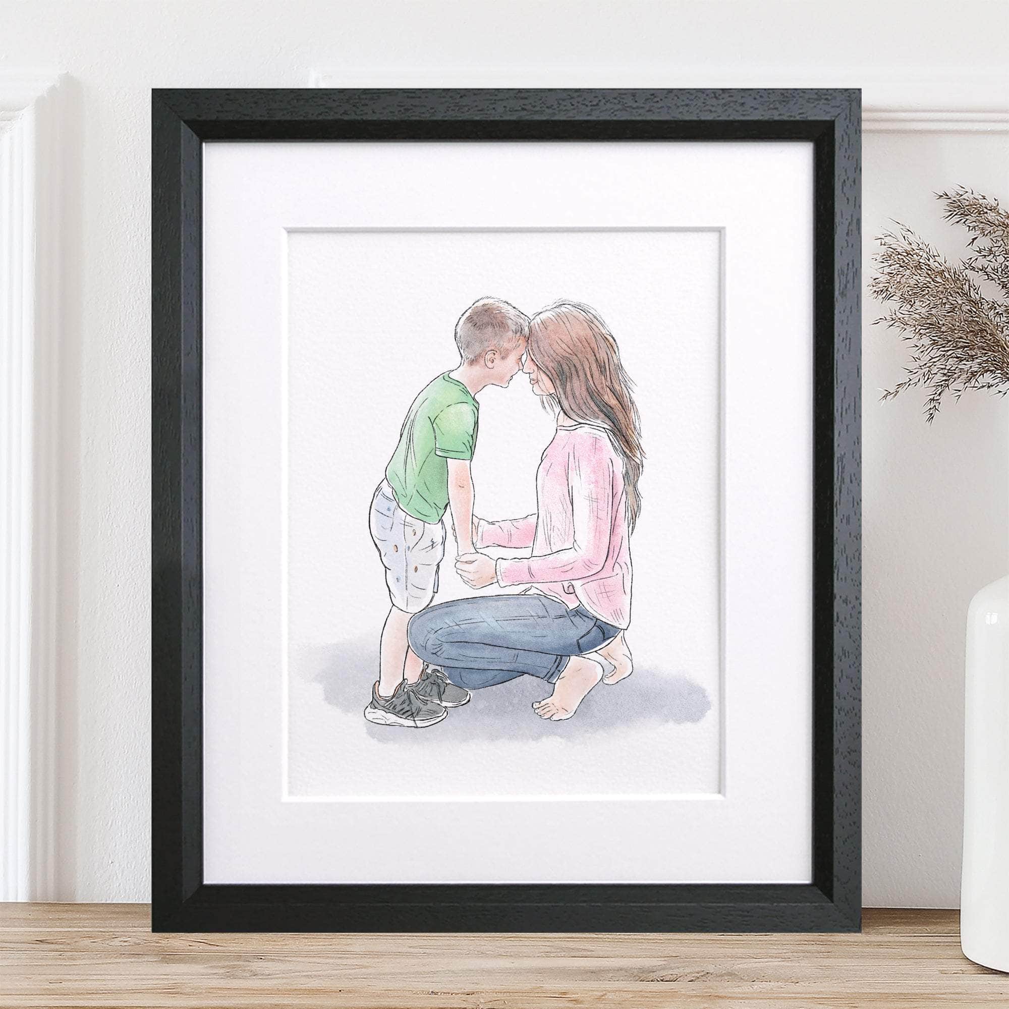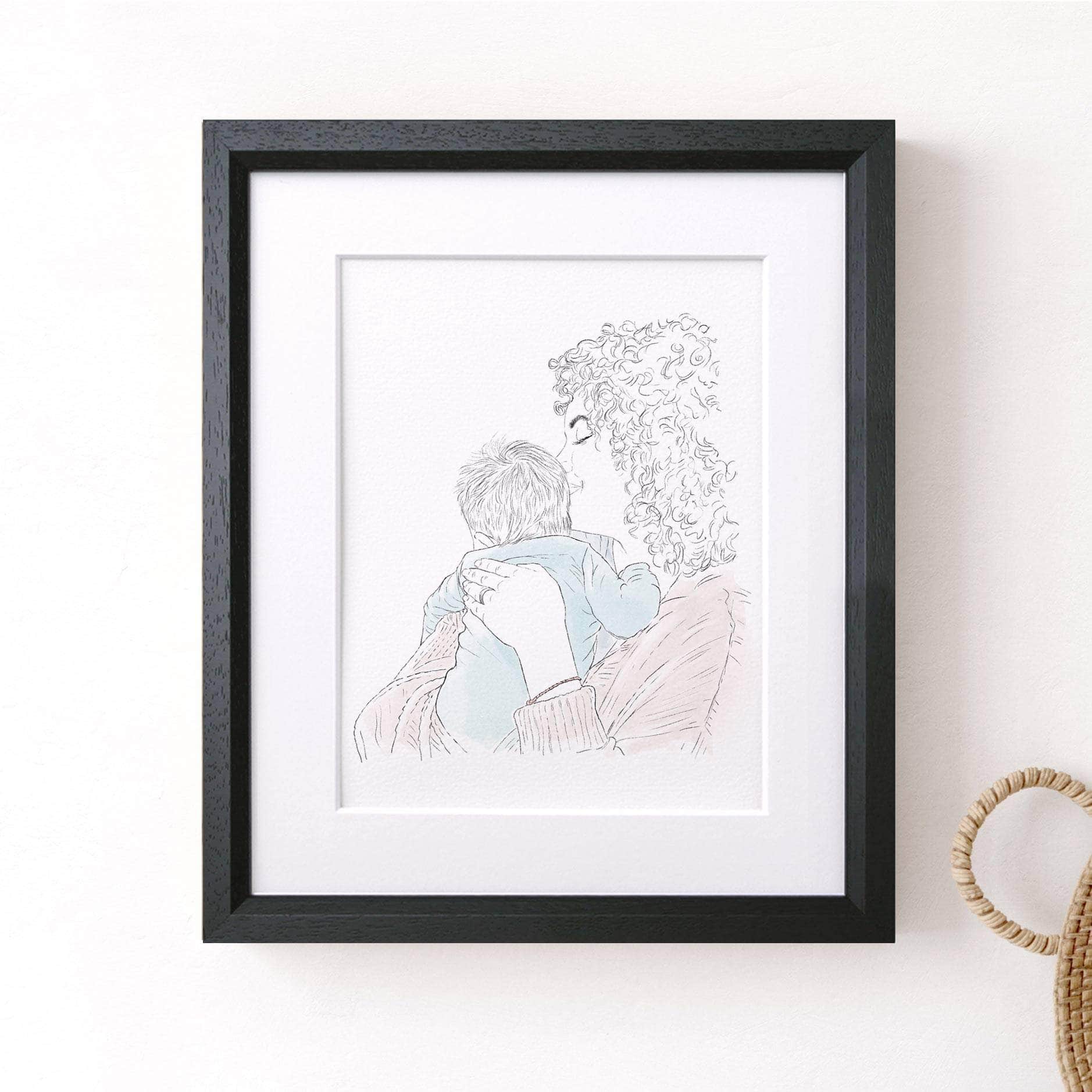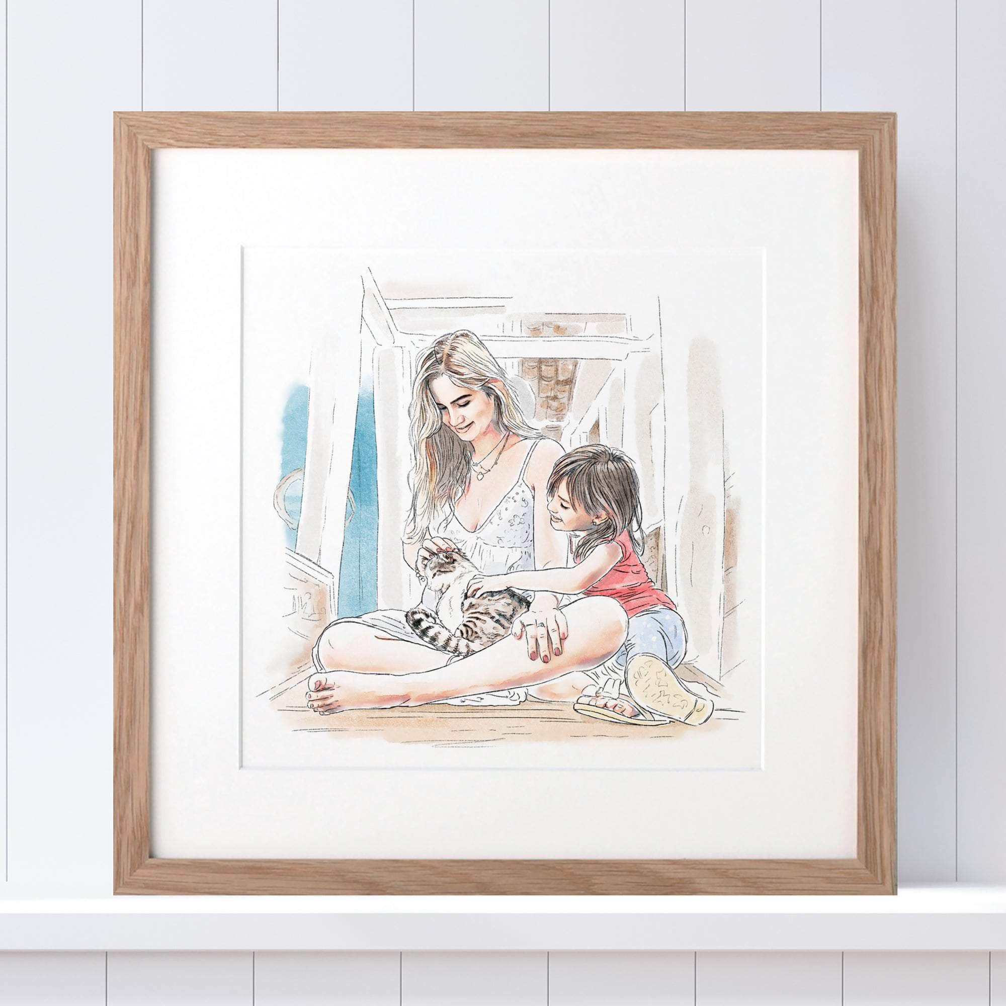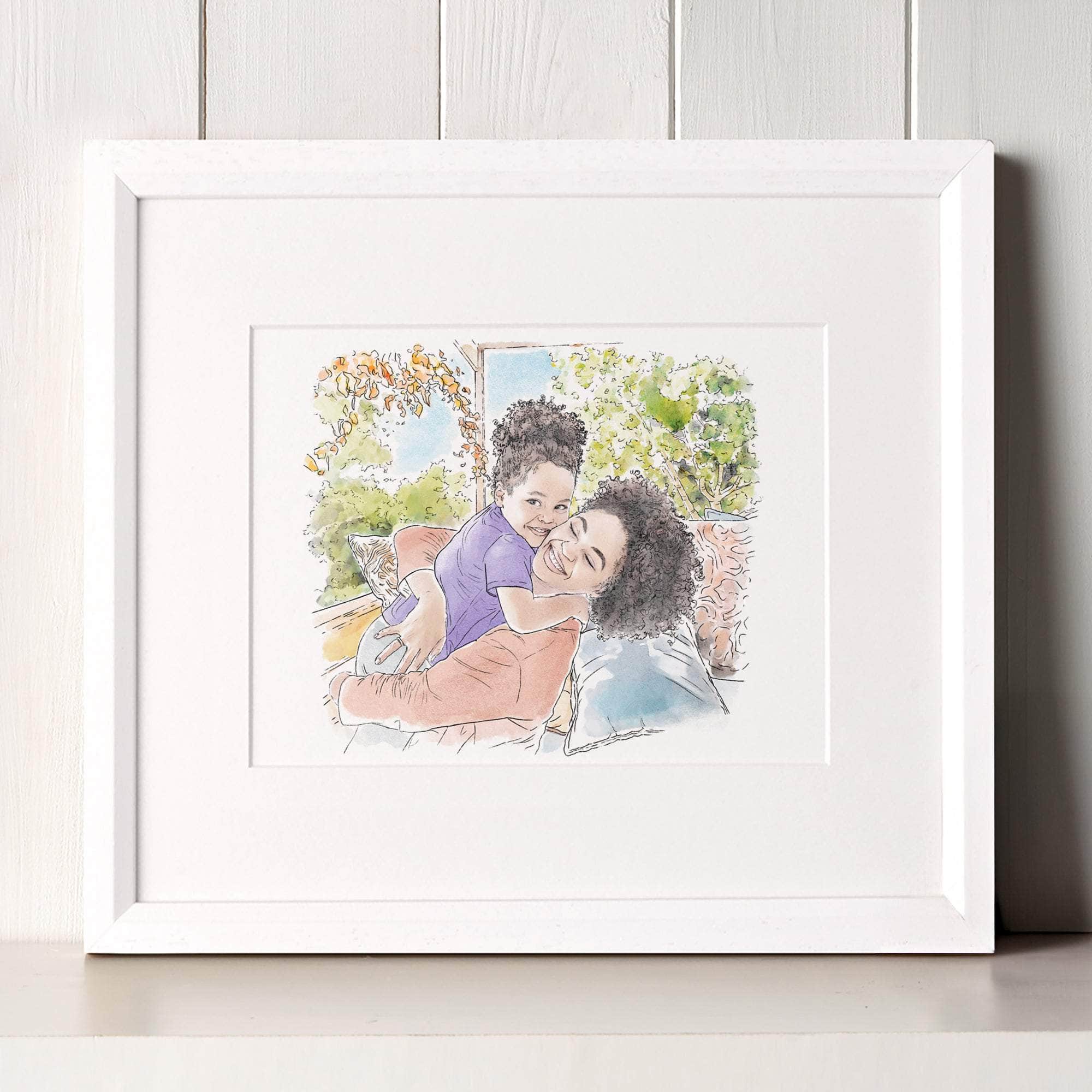 A personalised watercolour sketch based on a favourite photograph, hand-drawn by artists working in Devon. A special keepsake celebrating those moments between mother and child.