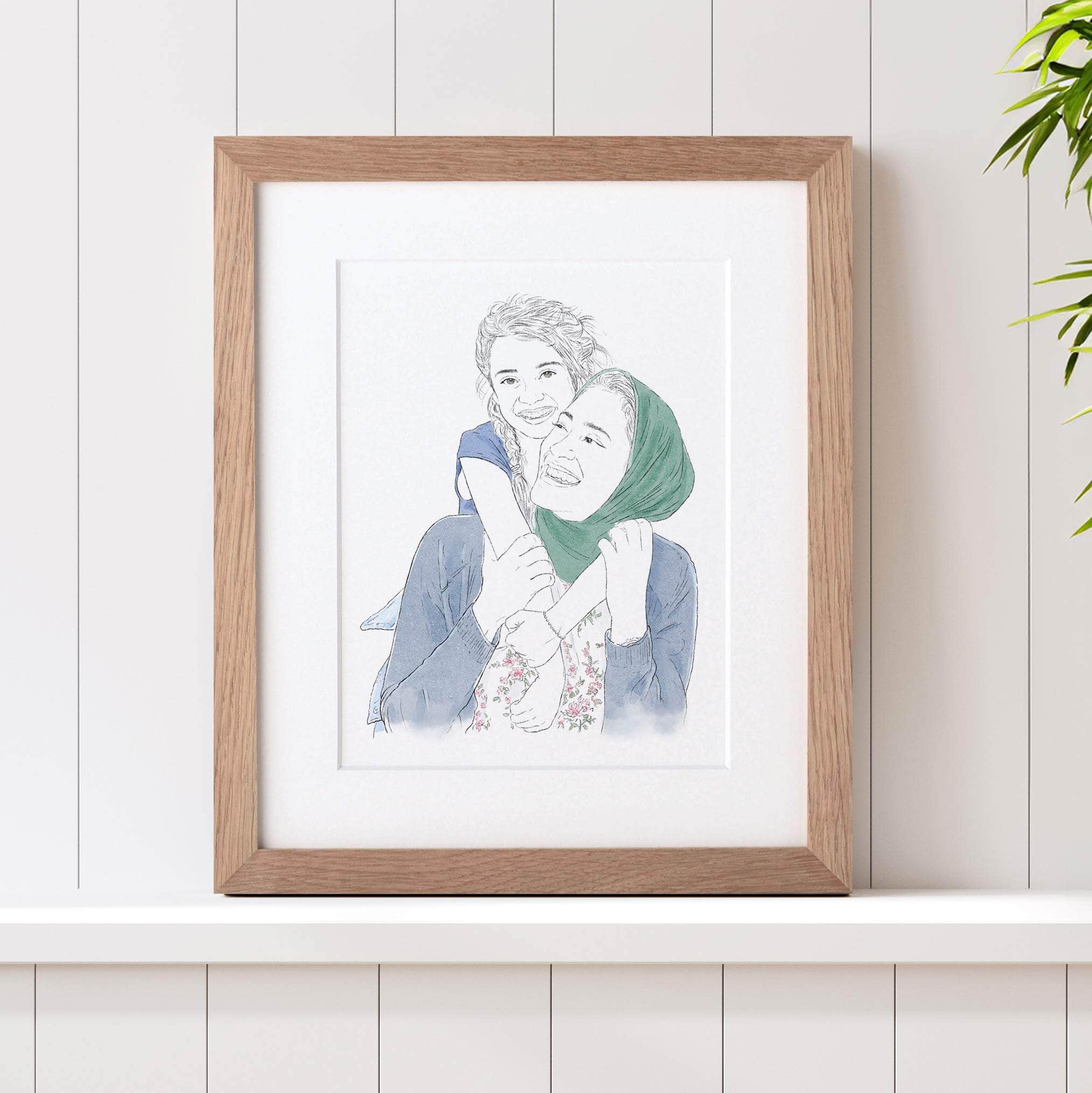 Our portraits are drawn in a freehand, flowing line style, capturing the subject's outline from the photograph's perspective, with clothing highlighted in watercolour. You also have the option to include full watercolour, allowing the artist to enhance the entire subject with watercolour details. Background elements are omitted unless specifically requested as an additional option. The final illustration is digitally printed, resulting in a vibrant and polished finish..