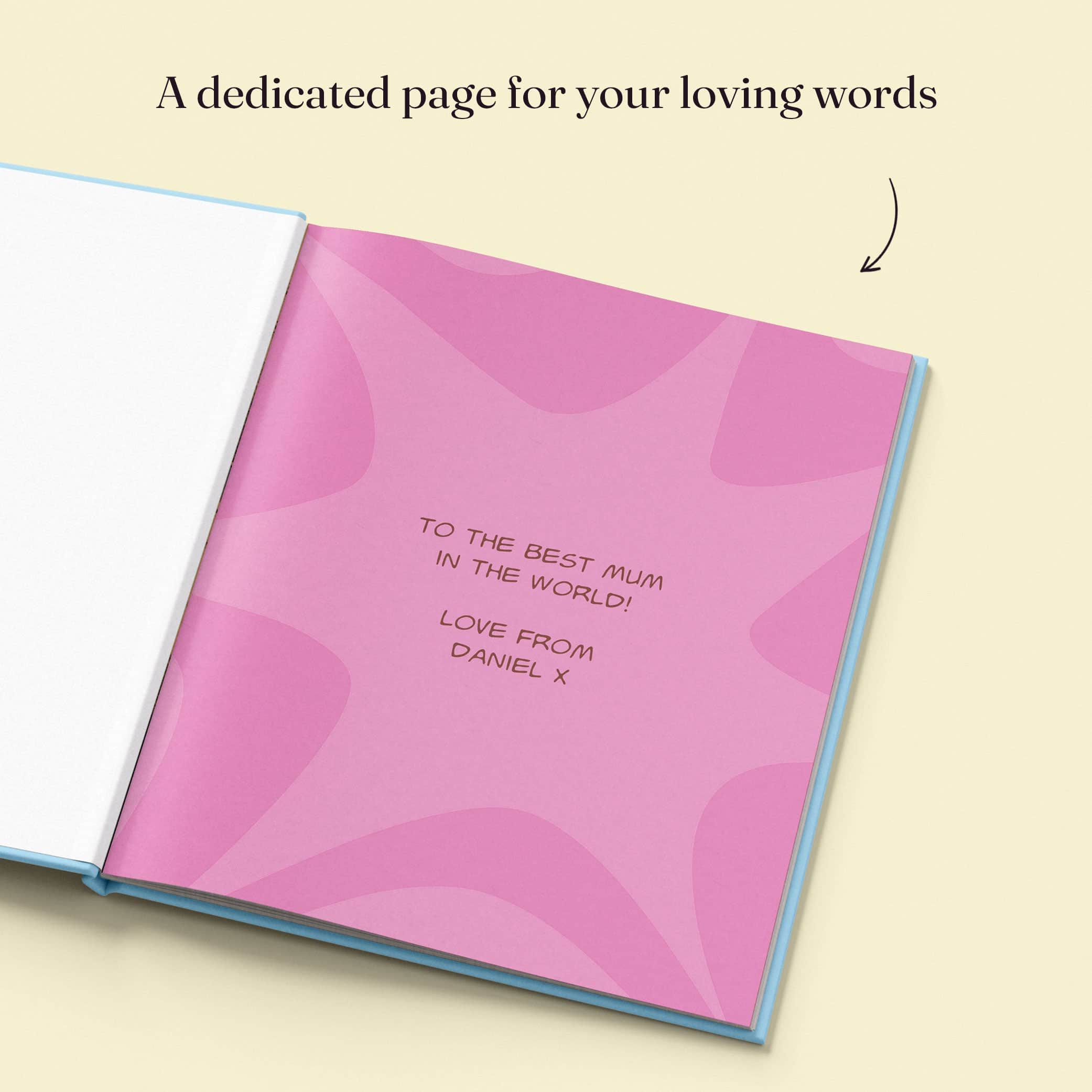 Personalised throughout with what your Mummy loves - from her job, where she lives, favourite food and clothes, hobbies, what she's scared of (not getting a full night's sleep!), and what she is best at (cuddles and bathtime fun!)