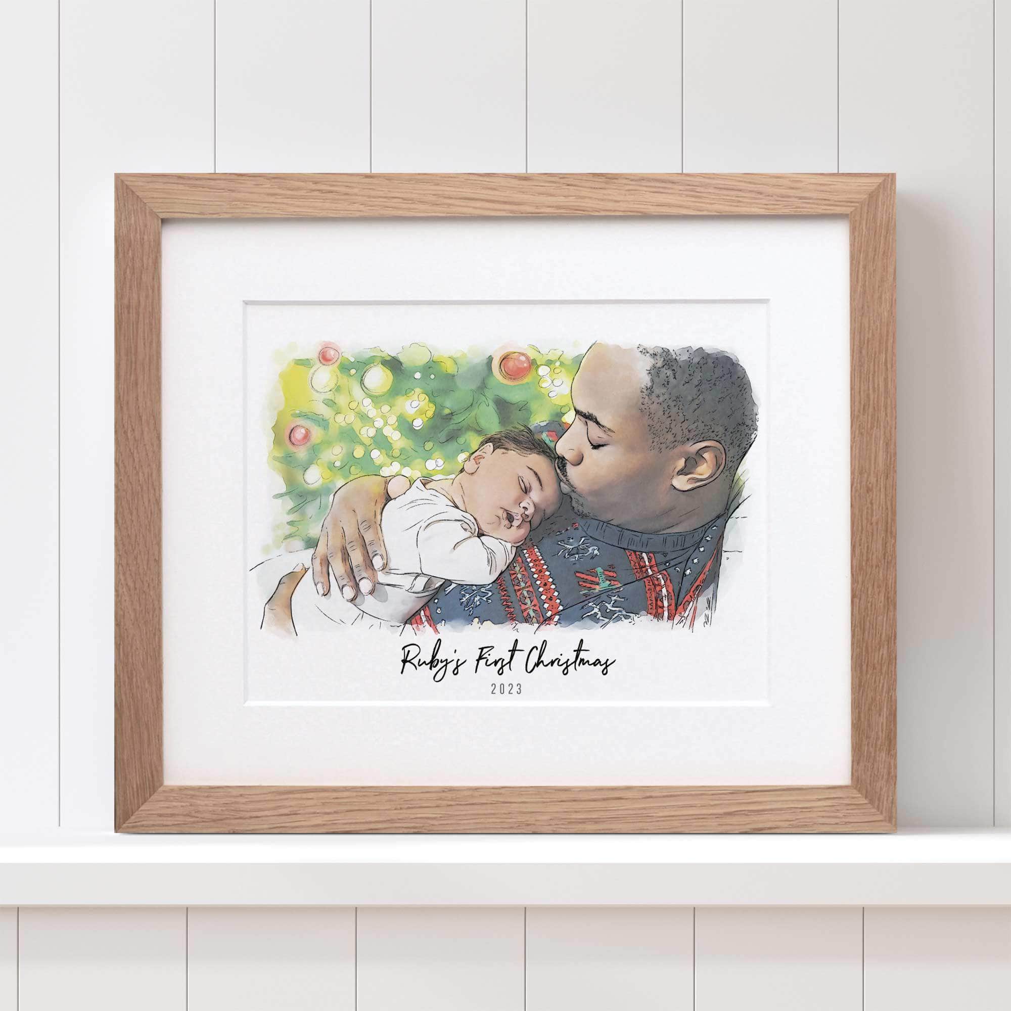Celebrate your baby's first Christmas with a beautifully hand-drawn watercolour illustration, designed to capture the magic of this precious milestone.