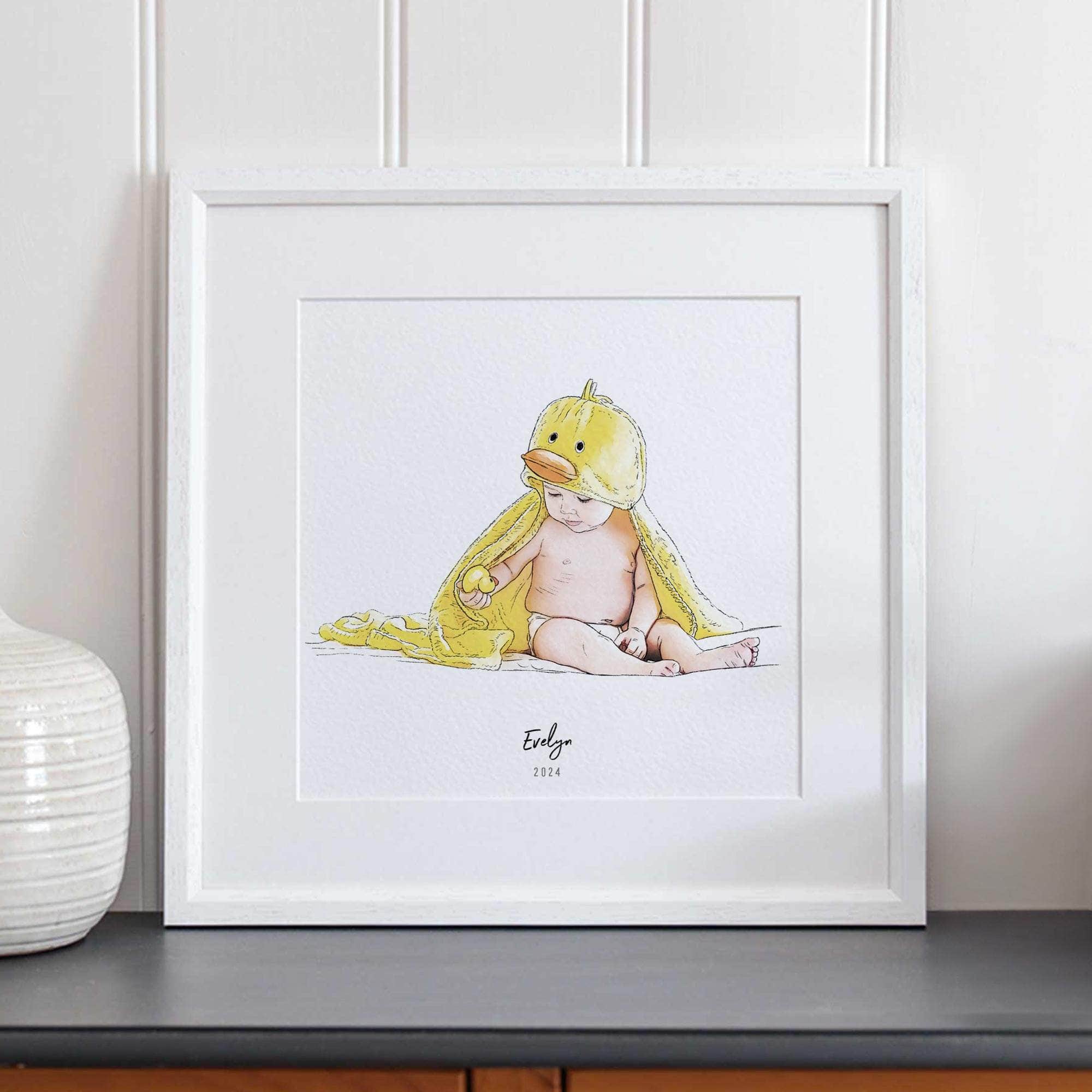 Hand-drawn, black and white line drawing, digitally printed with full colour watercolour where we colour hair, skin, clothes etc. Your choice of text (eg a name) is printed with a message and date below in contemporary type (enter NA if not needed).