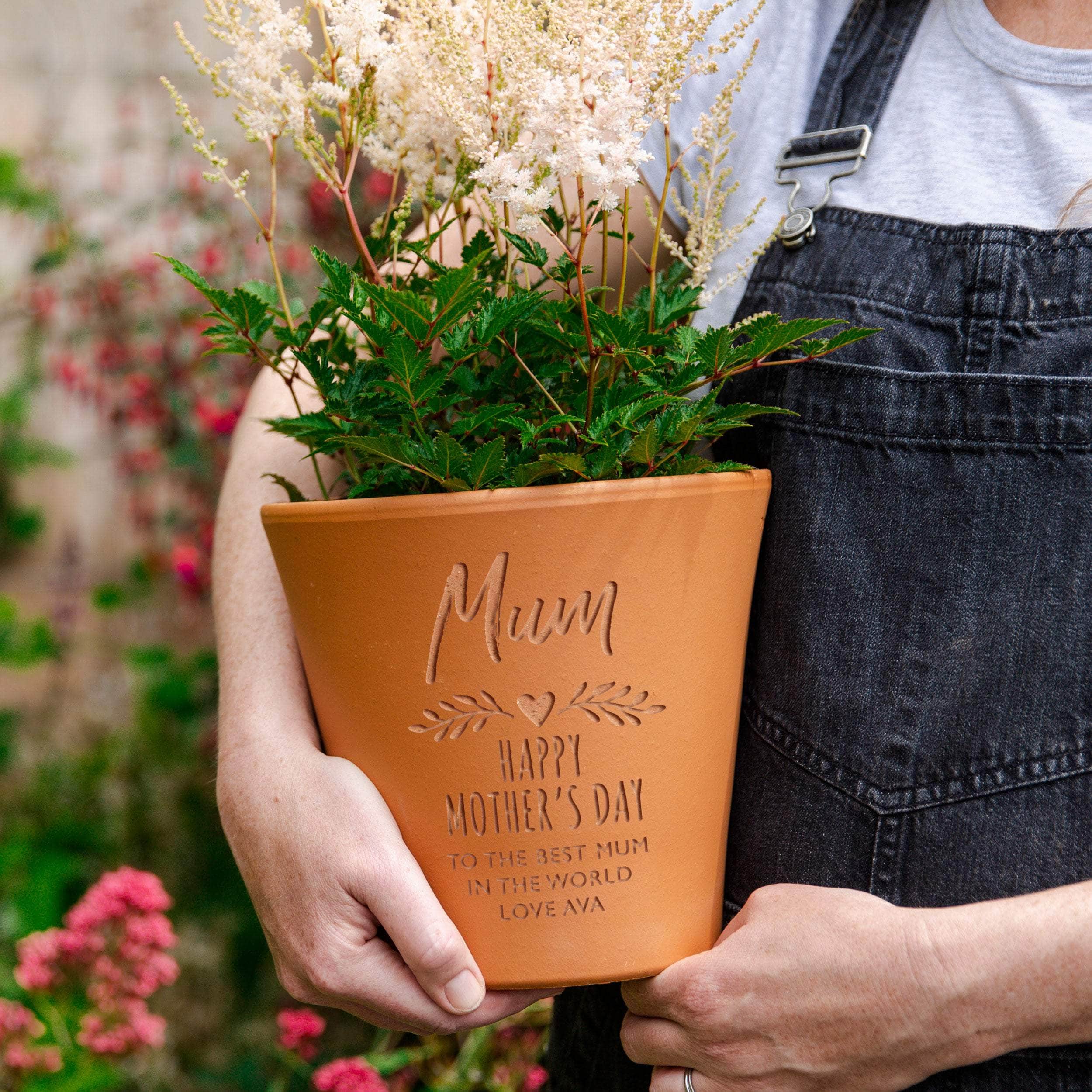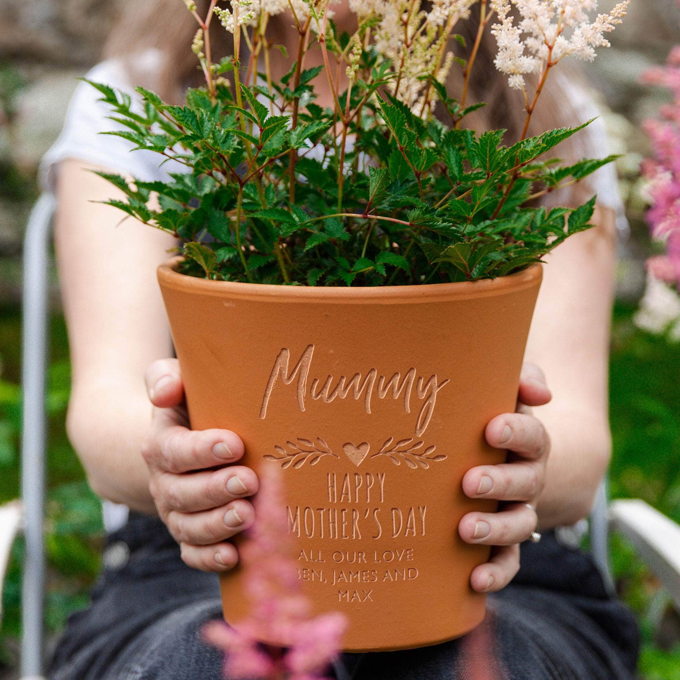 An elegant terracotta flower pot engraved with your choice of name (eg Mummy, Mum, Nan, etc), your personalised message (eg Happy Mother's Day, Happy Birthday, etc) and who it is from (eg All our Love, Ben and Sarah) - a perfect gift this Mother's day.