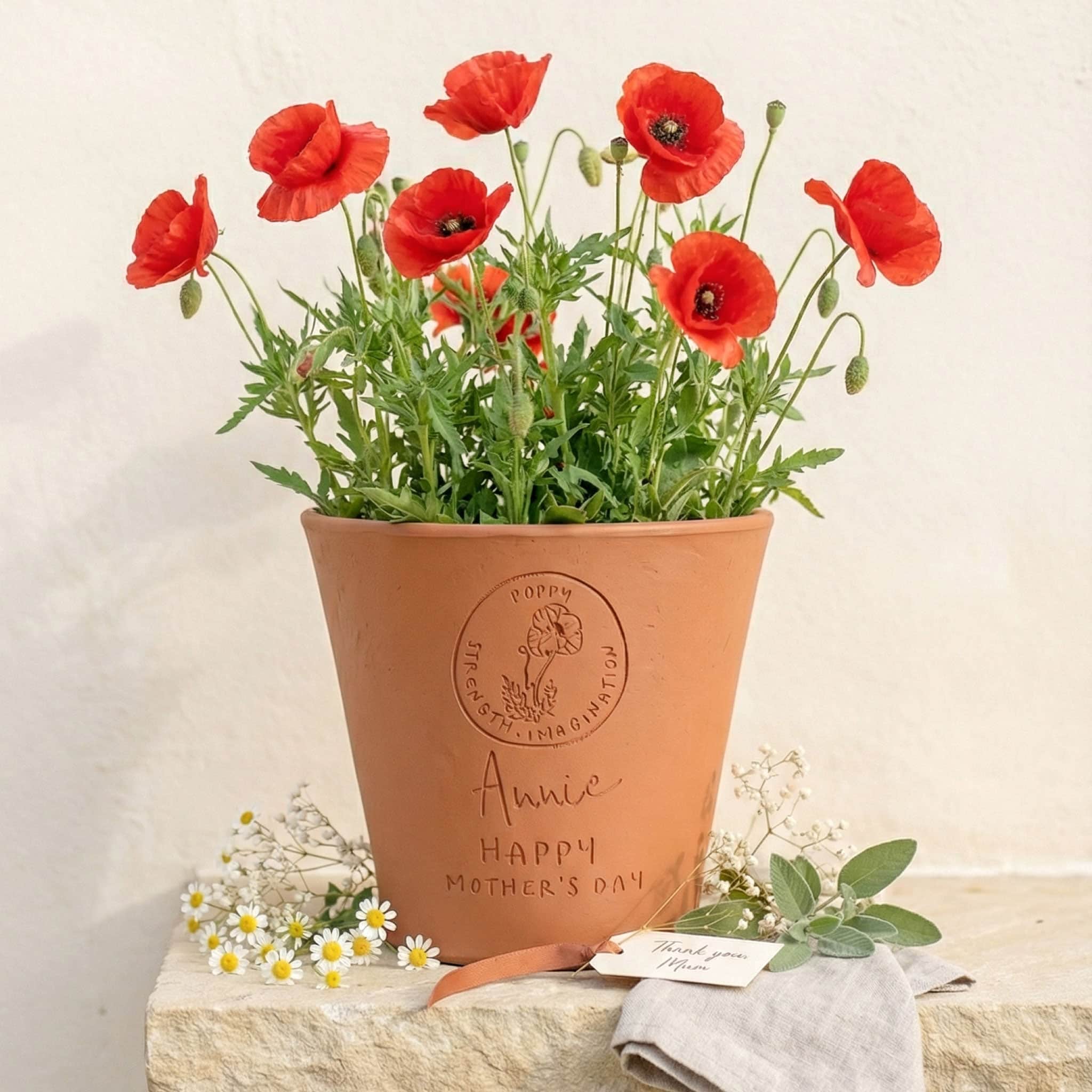 A gorgeous terracotta flower pot engraved with your name, birth date and message with a motif of that month's birth flower and its meaning. Complete this unique gift with a packet of your loved ones birth-flower seeds.